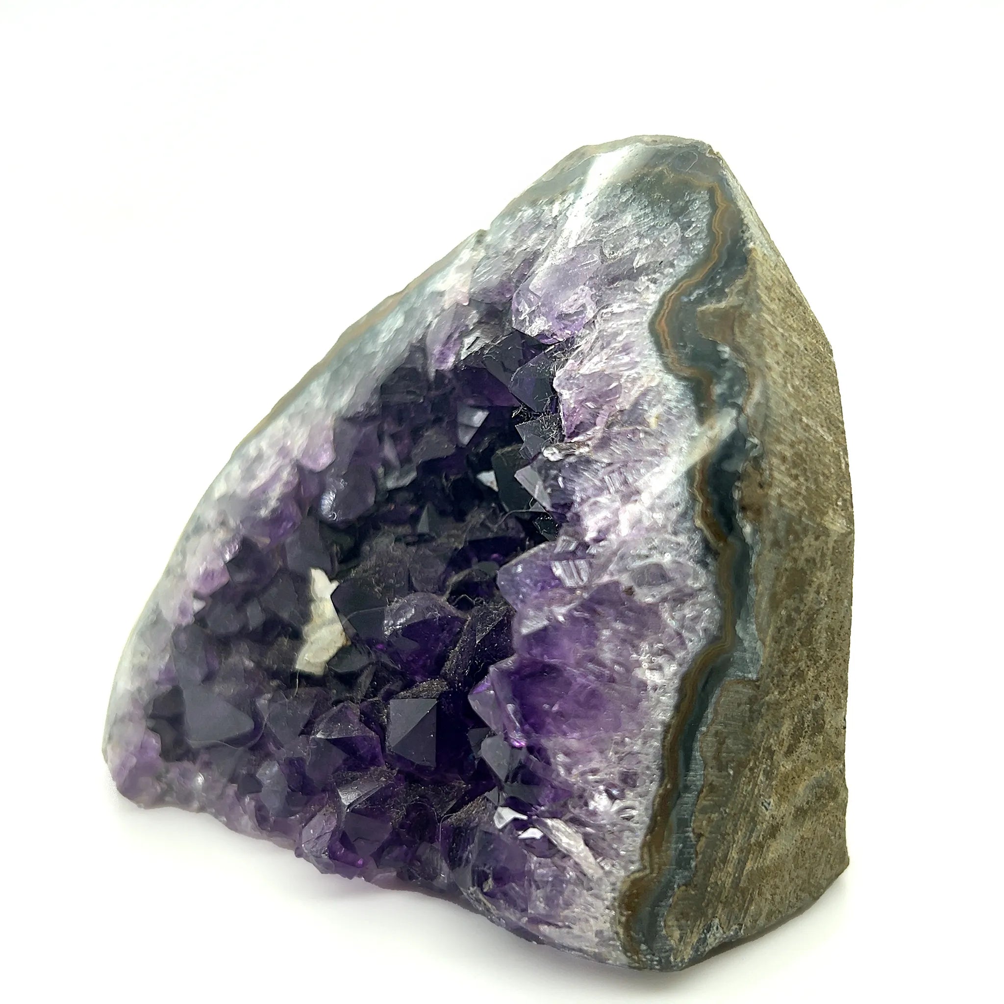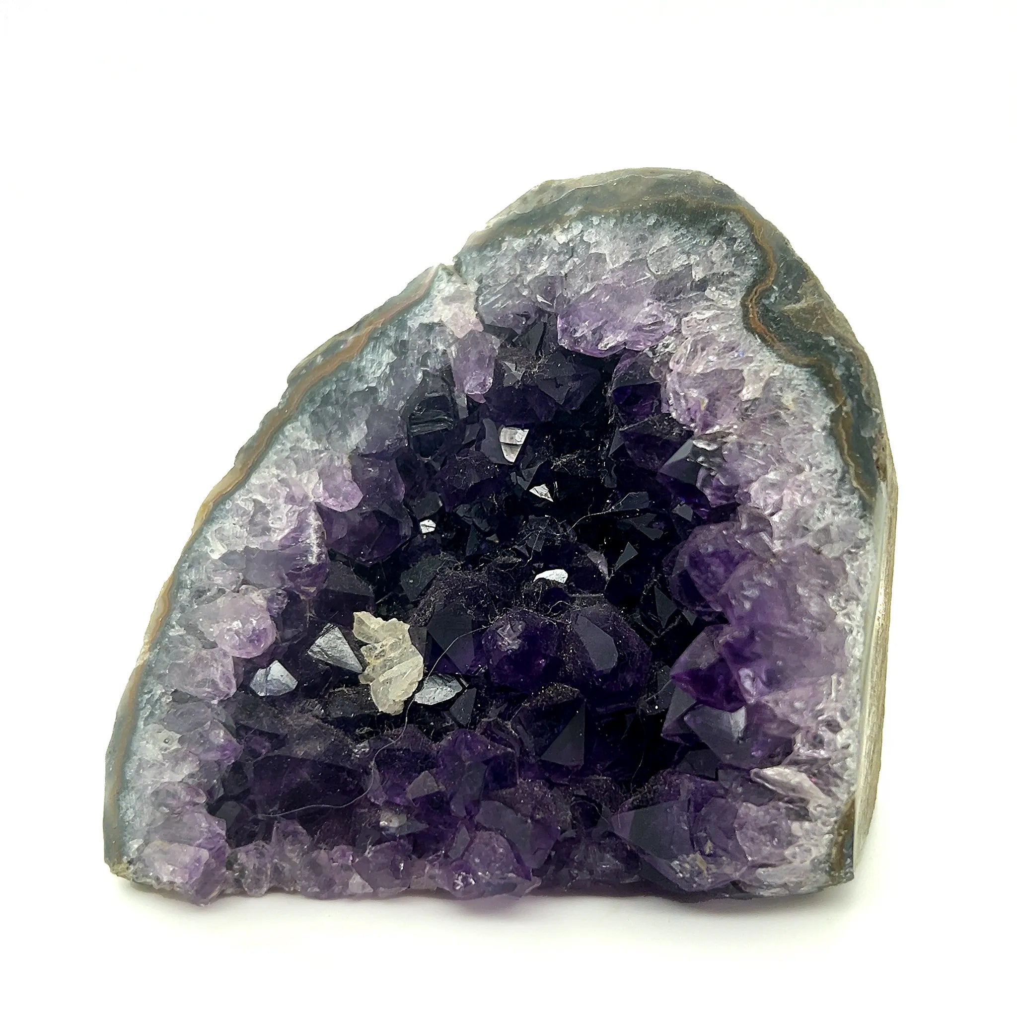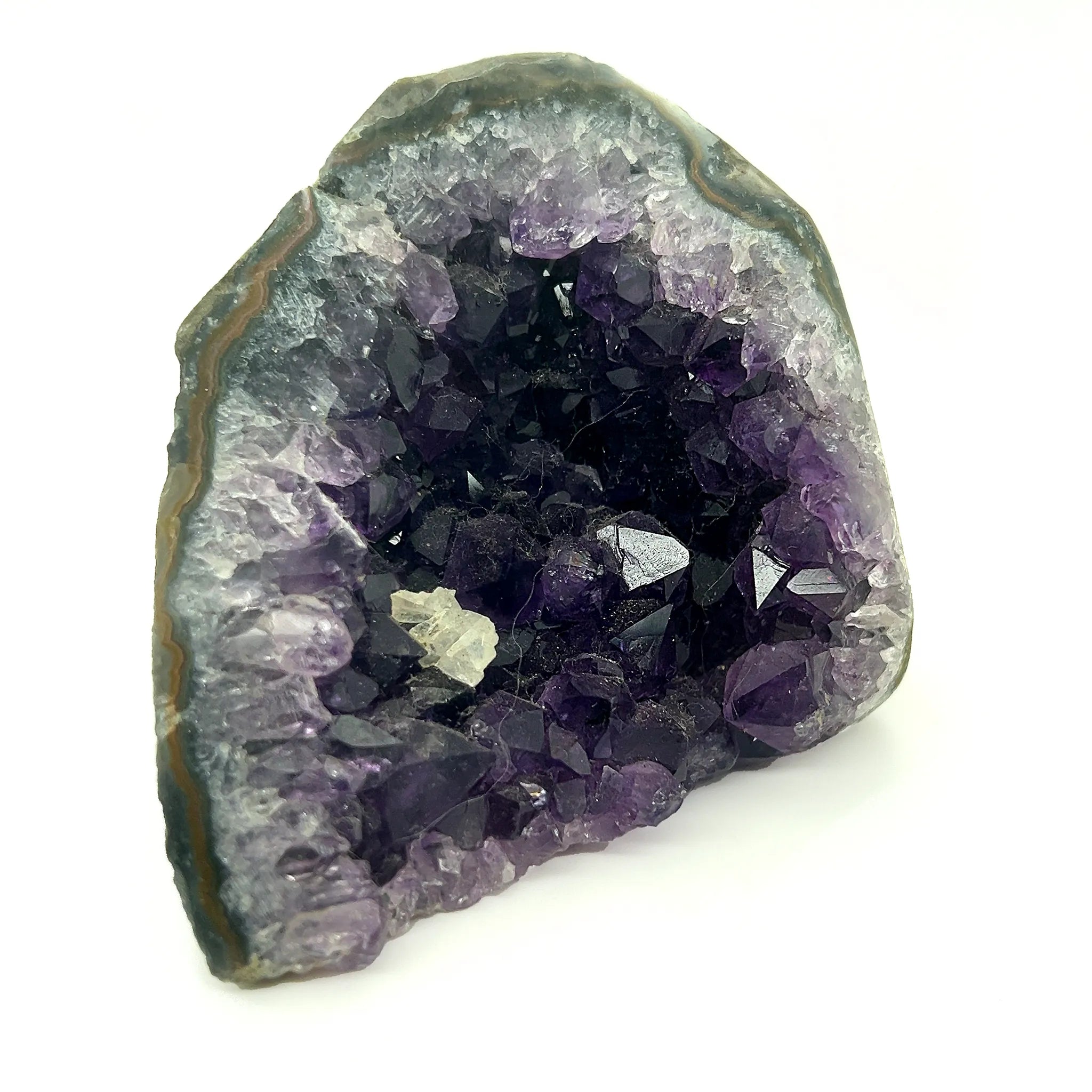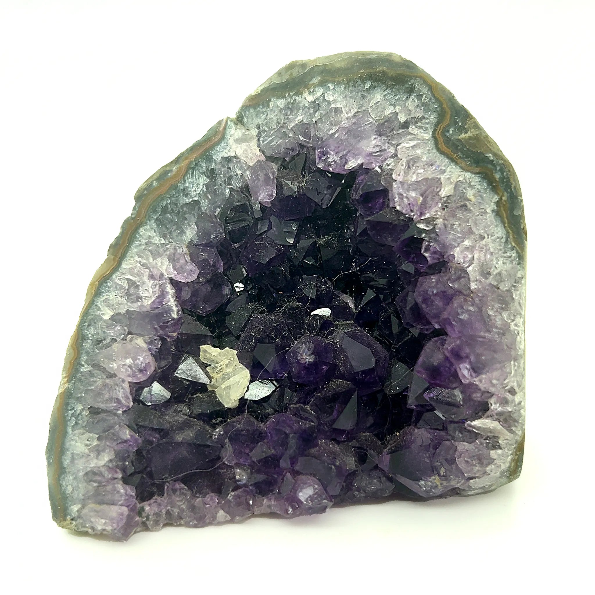 This small A-grade amethyst geode from Brazil showcases deep purple crystals. The natural cavity is lined with well-formed, lustrous points, making it a stunning display. A unique touch—a small protrusion of white Calcite—emerges on the left side, adding contrast and mineral interest.