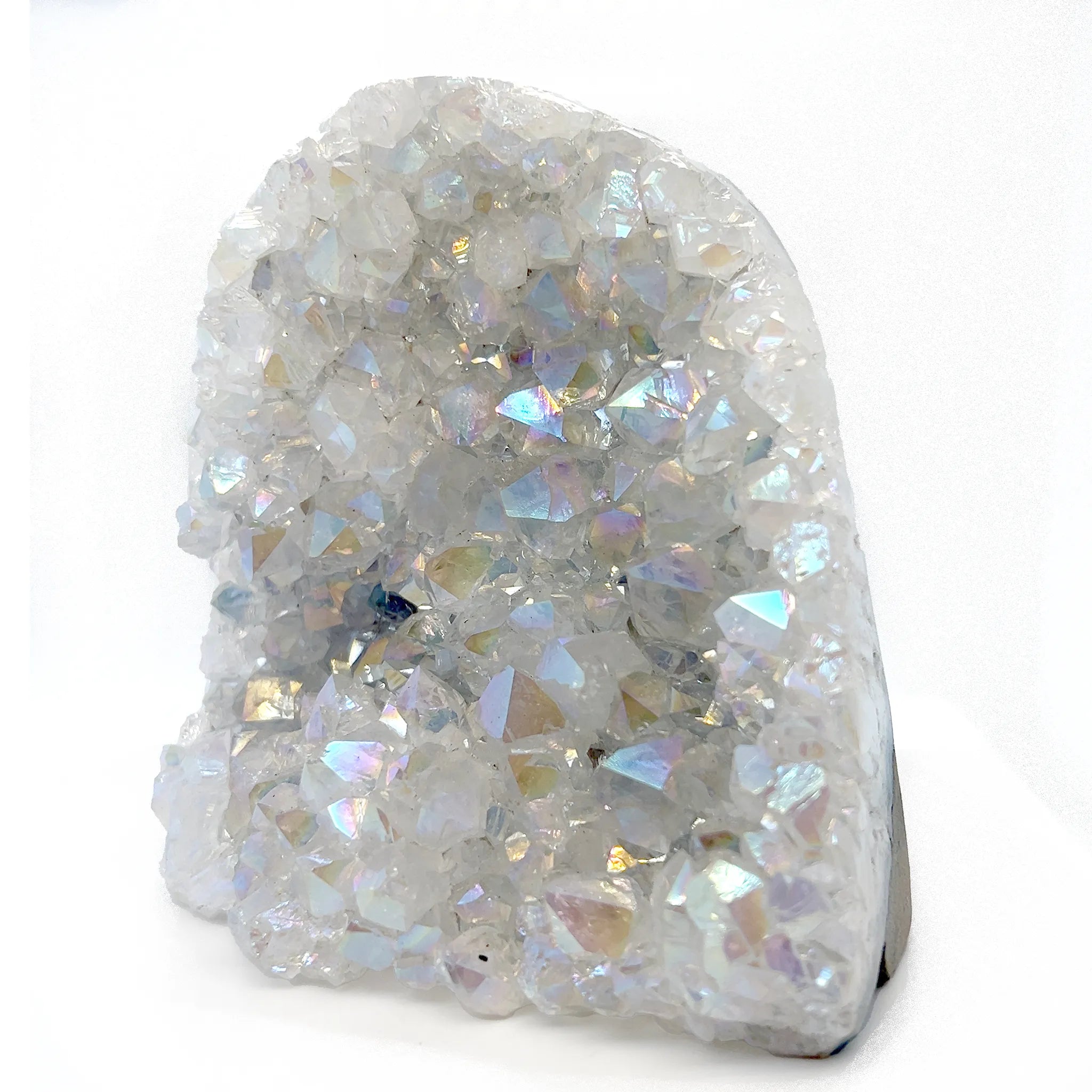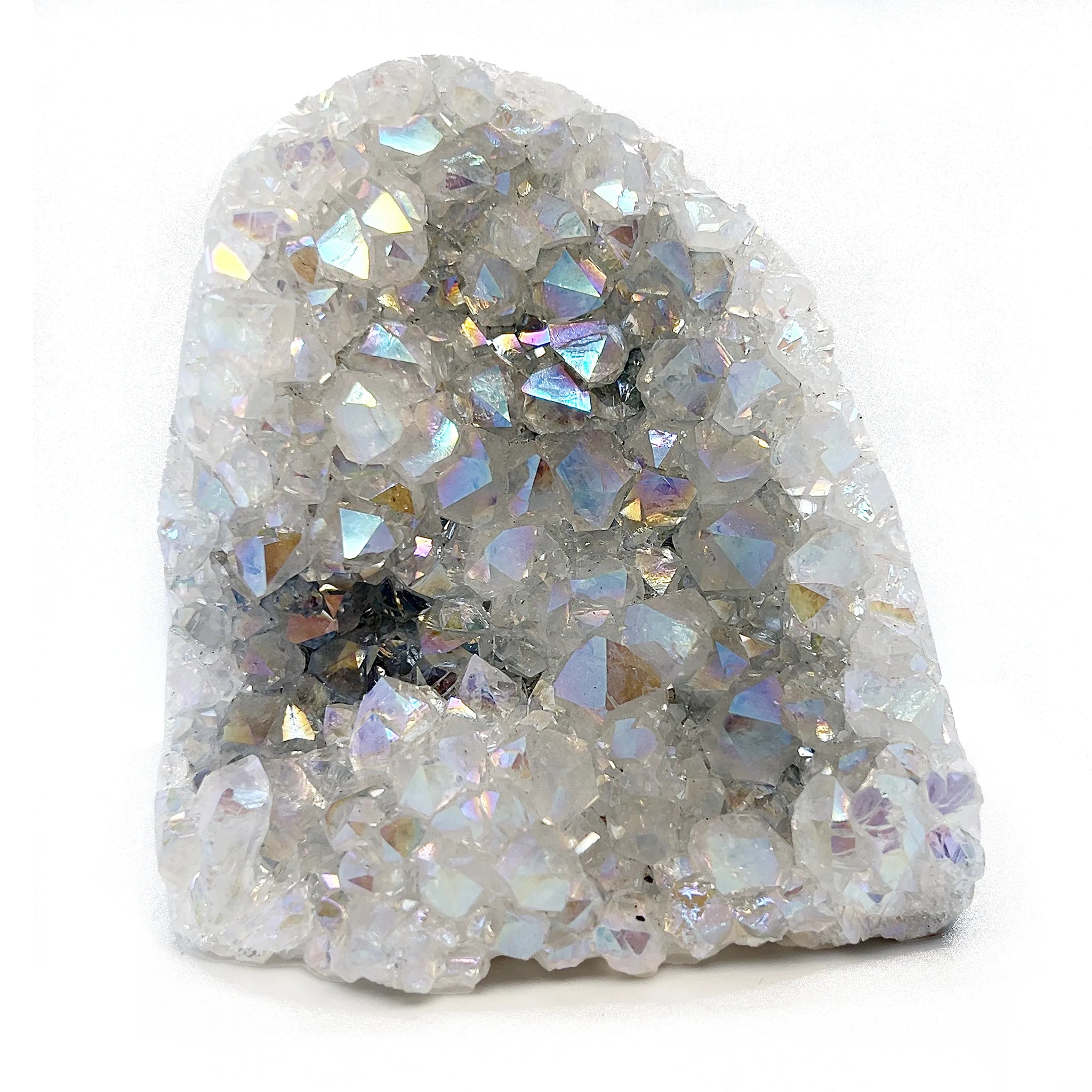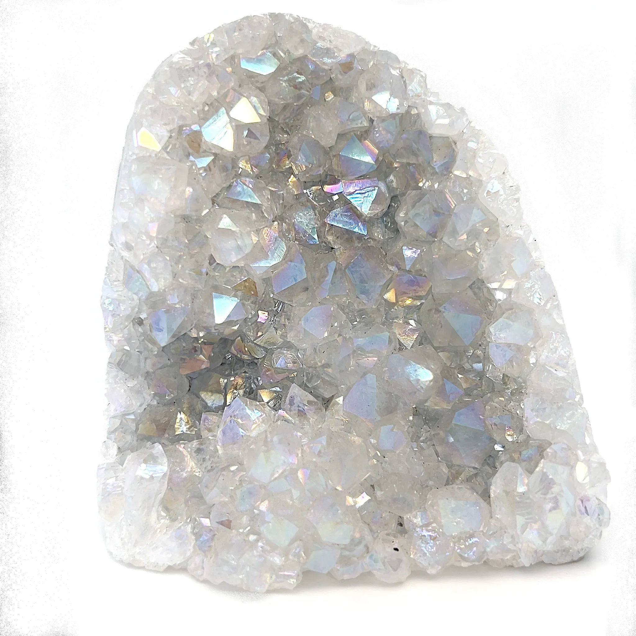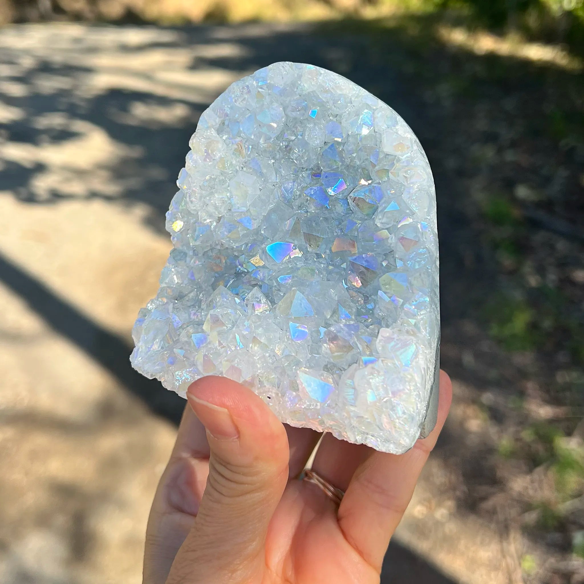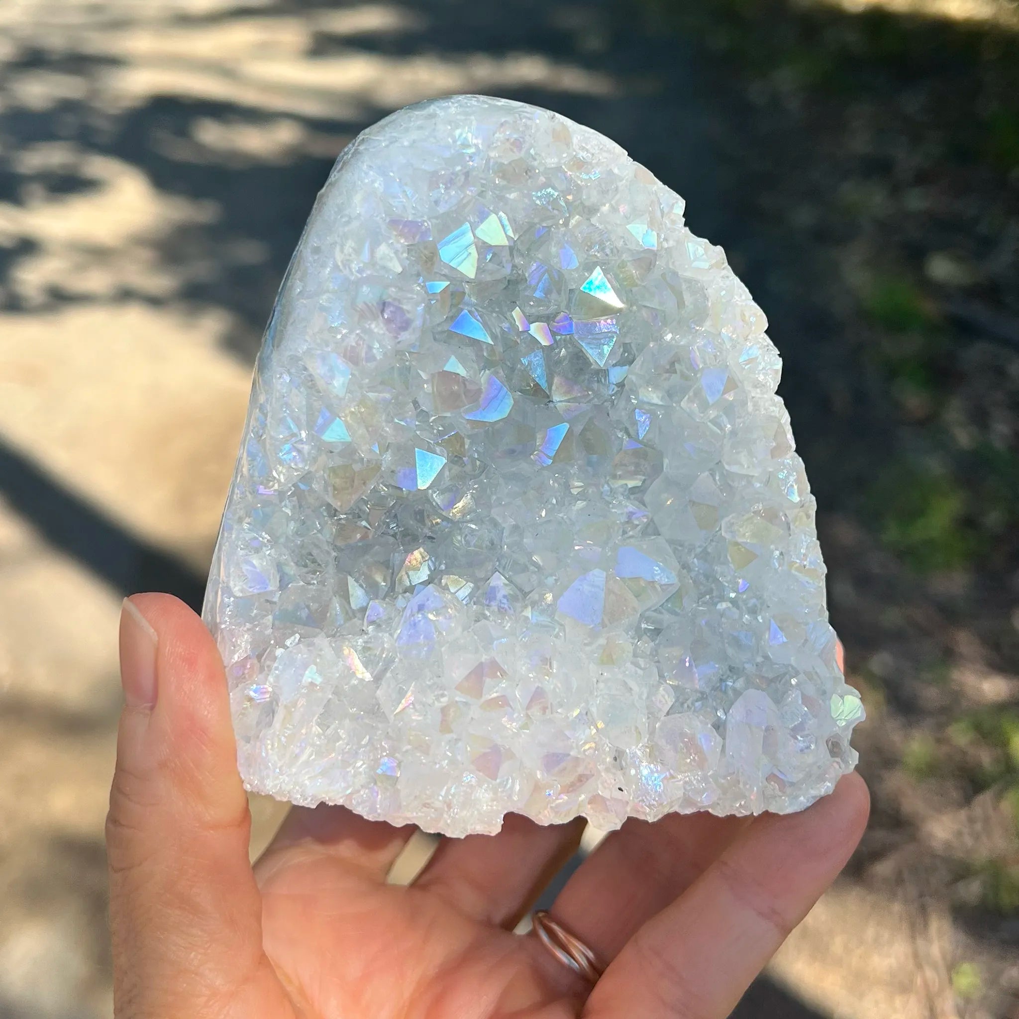 The shimmering Aura effect is created by bonding the raw Amethyst cluster with precious metals like titanium or platinum in a special high-heat vacuum process. This fusion forms an iridescent layer, amplifying the stone’s calming and protective properties.