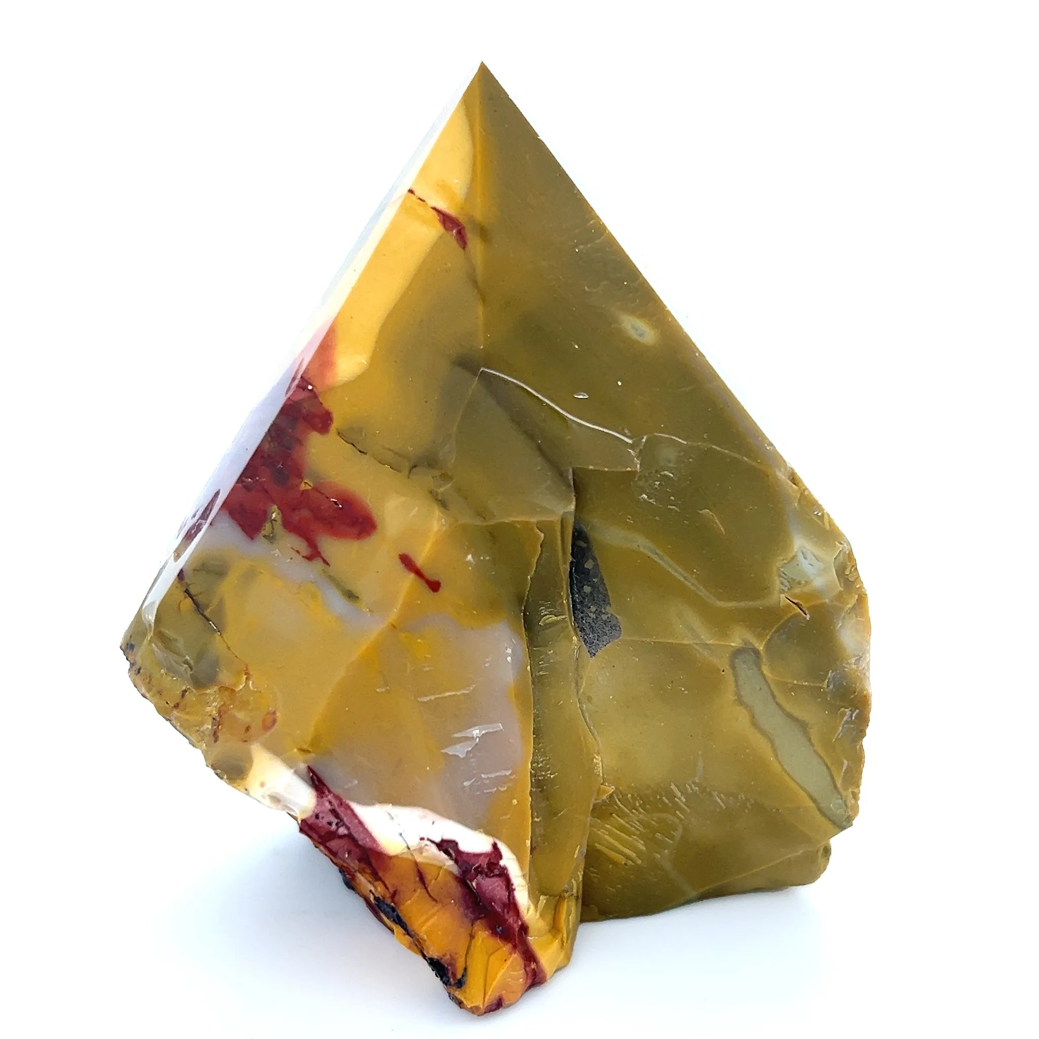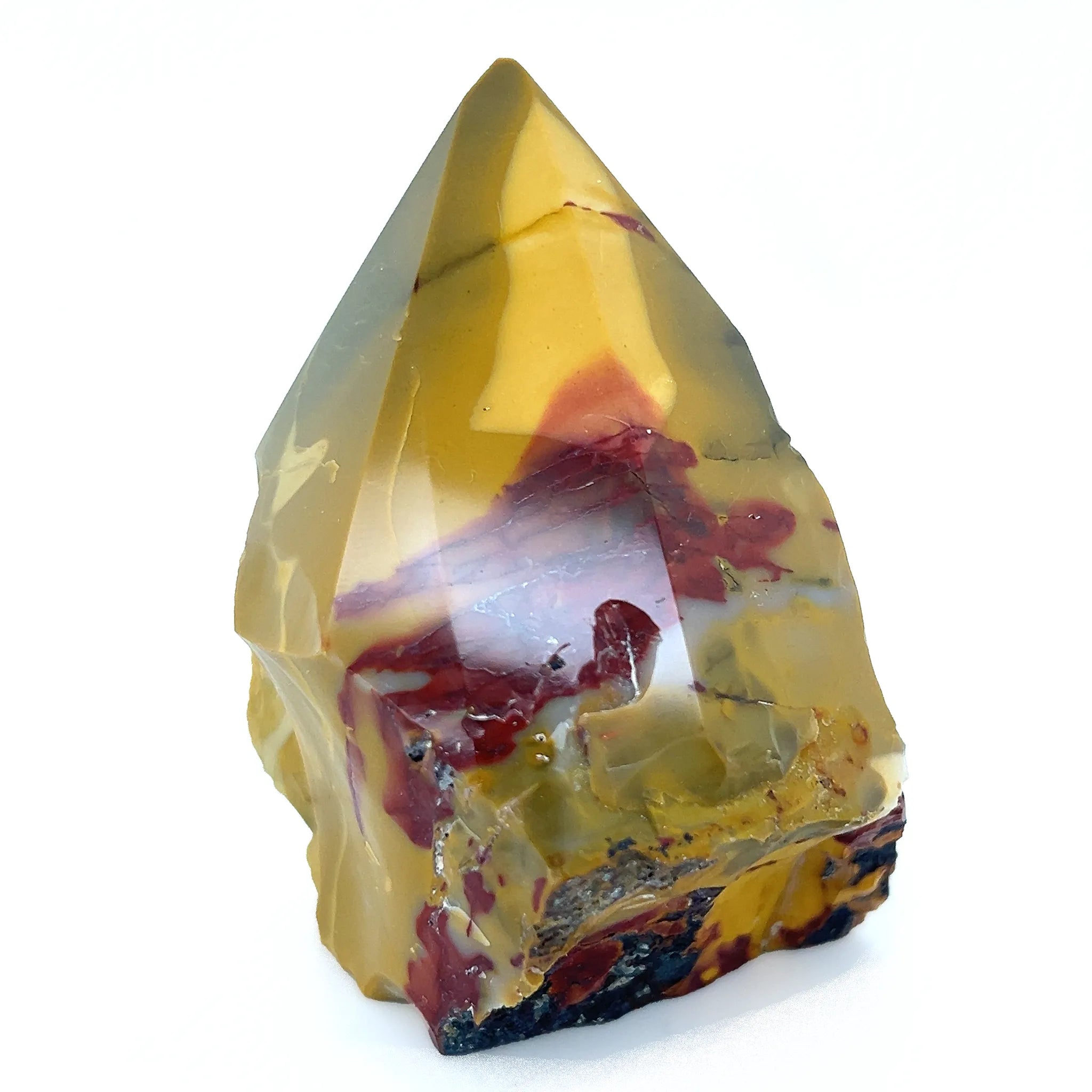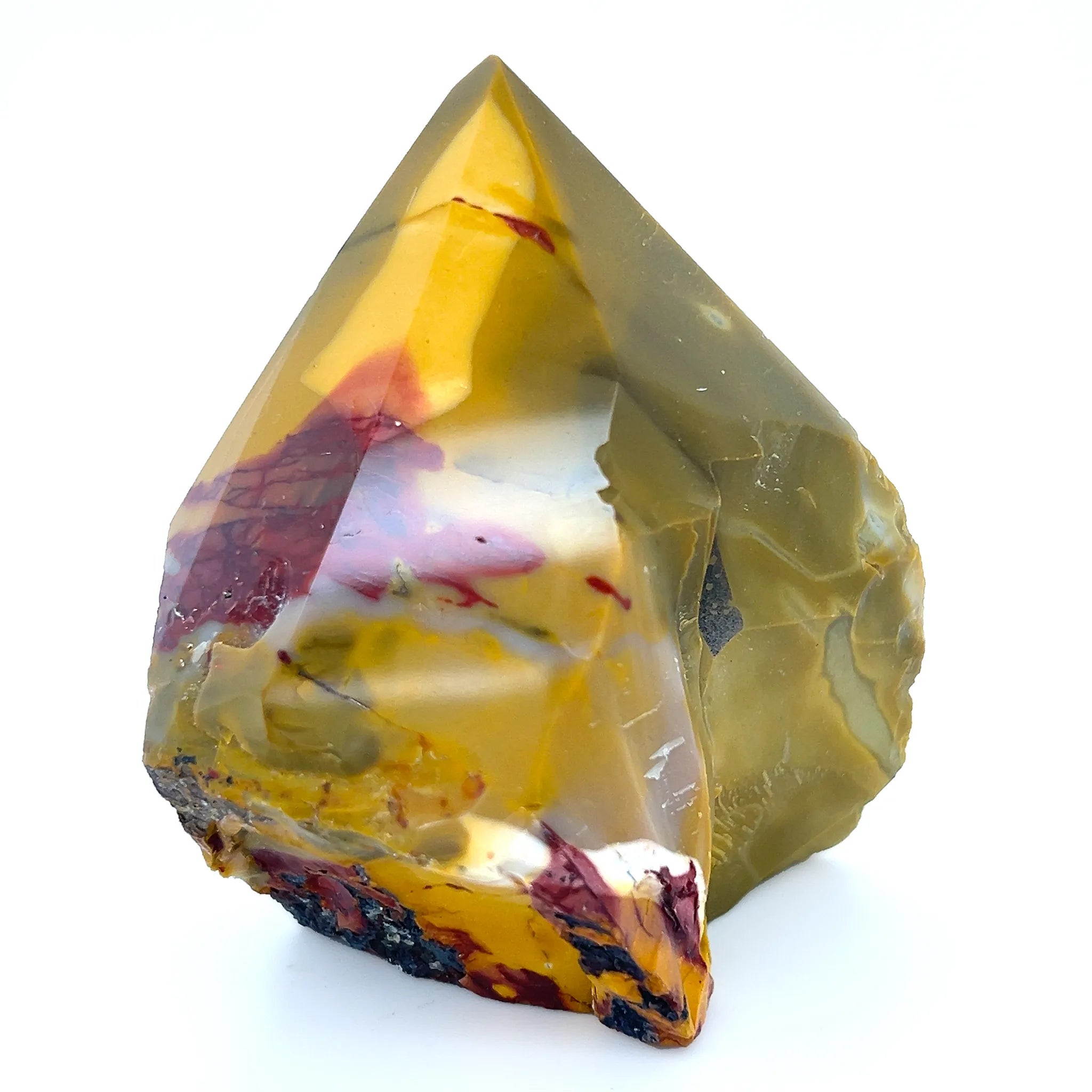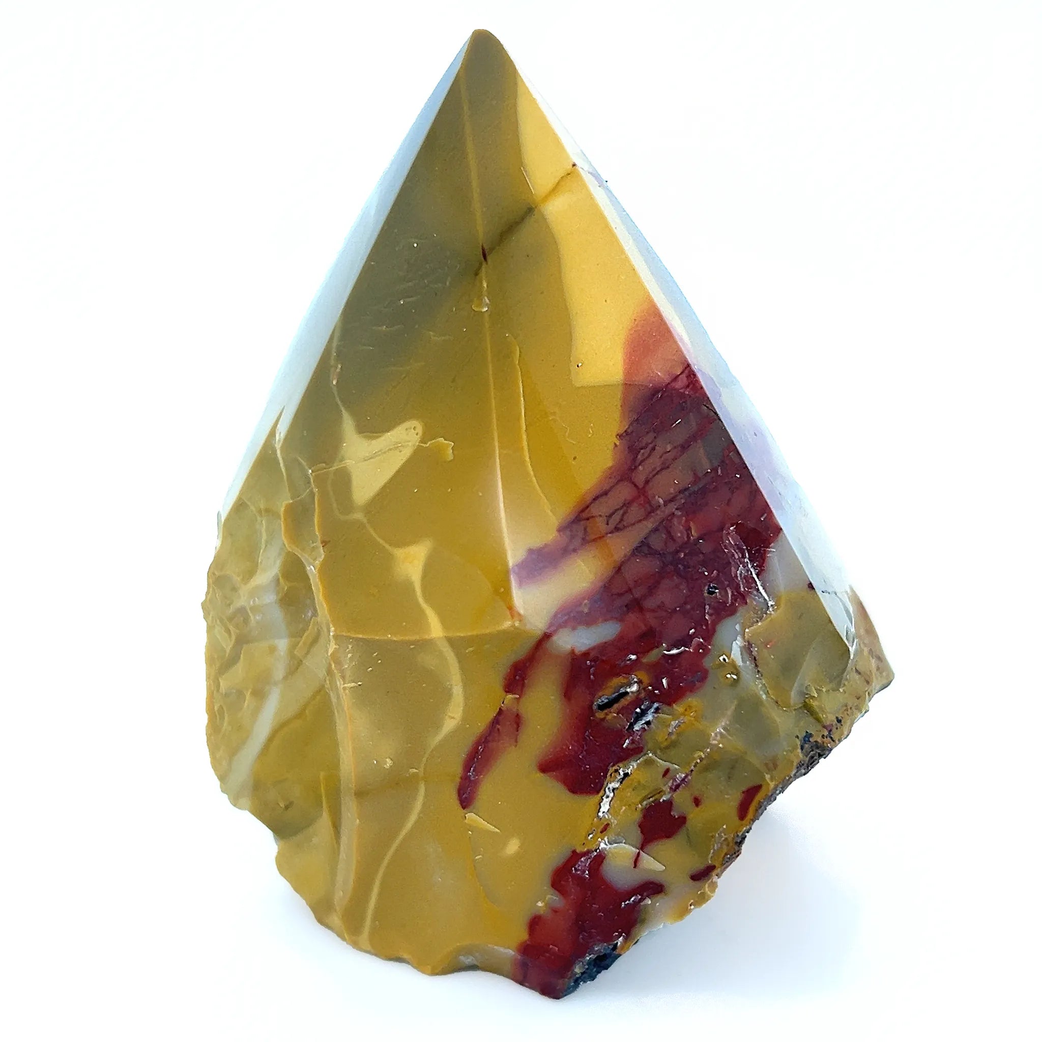 This Mookaite Semi-Polished Point displays a raw, earthy base with a smooth, polished tip in warm reds, yellows, and cream.