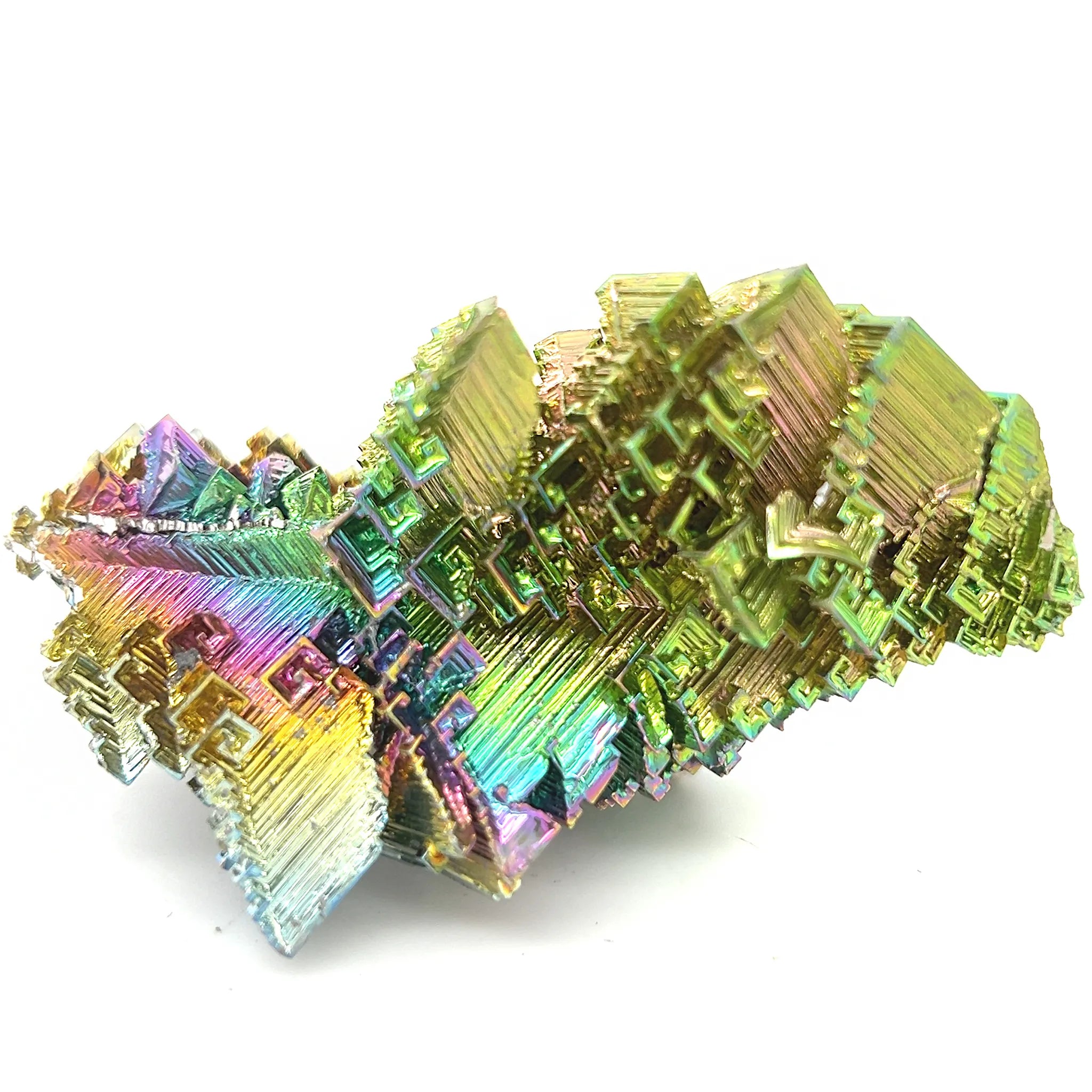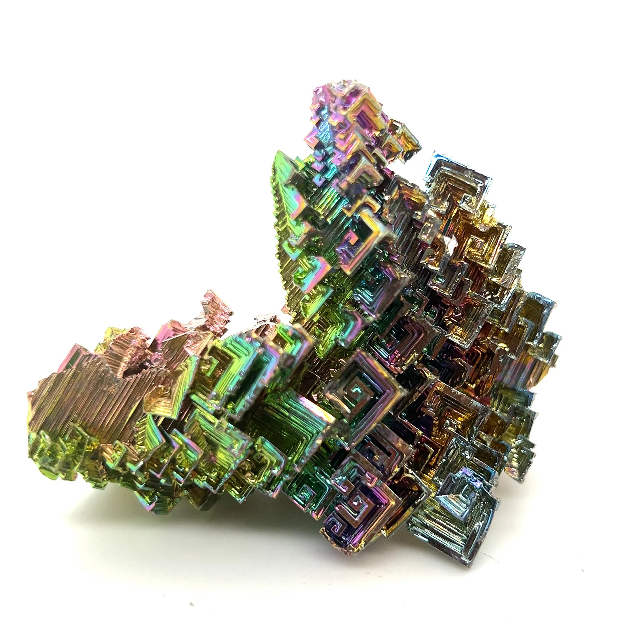 A breathtaking Bismuth mineral with a bold rainbow spectrum shimmering across its intricate crystal formations. This large, lab-grown piece showcases stair-step structures in brilliant shades of pink, blue, gold, green and violet.