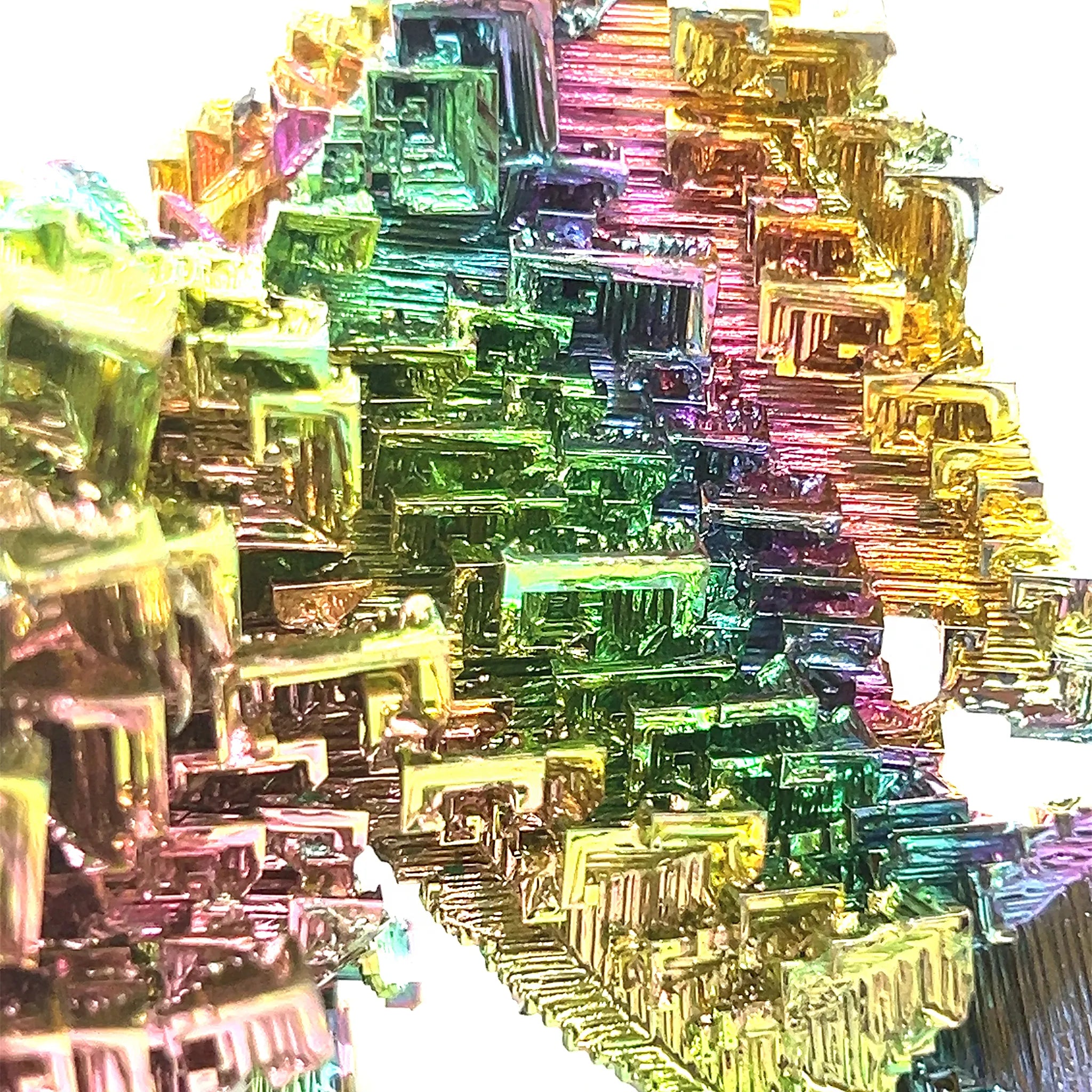 The largest deposits of naturally occurring Bismuth are found in Bolivia. Bismuth is a crystalline, brittle metal that resists being magnetized and is repelled by a magnetic field. It also has an unusually high electrical resistance for a metal. Its thermal conductivity is lower than any metal except mercury and it has the unusual property that, like water, it expands as it freezes. Bismuth is considered to be a stable element, although it is radioactive with an extremely low rate of decay with a half life more than a billion times the estimated age of the universe. Pure Bismuth is a white metal with a slight pink colour. The colours displayed come from light interference in a thin oxide layer on the surface of the crystal.