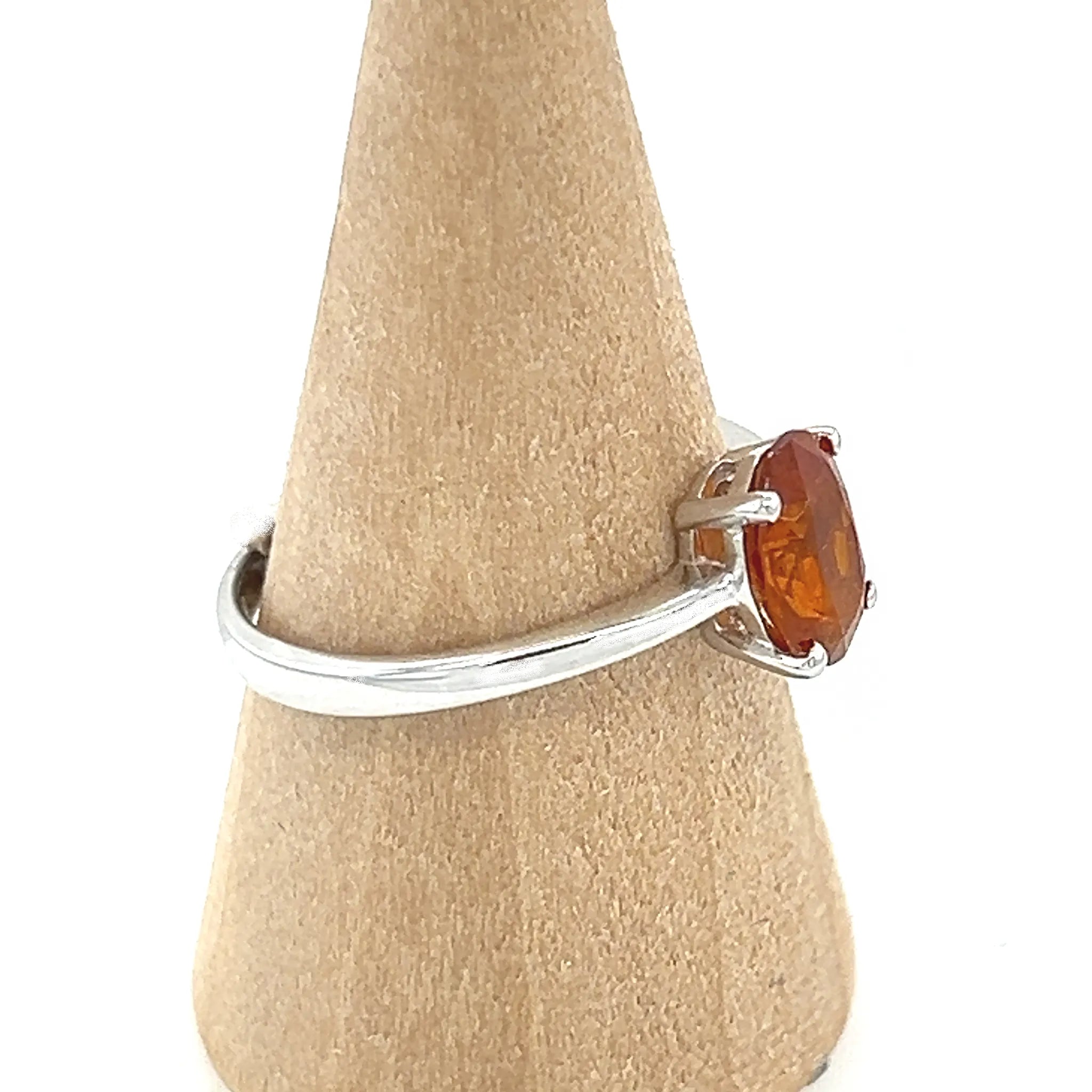 This dainty Faceted Orange Kyanite Ring features a vivid, natural gemstone set in a delicate claw setting. This piece shows off a slim .925 sterling silver band, finished with rhodium plating for added resistance to tarnish and a lasting shine.