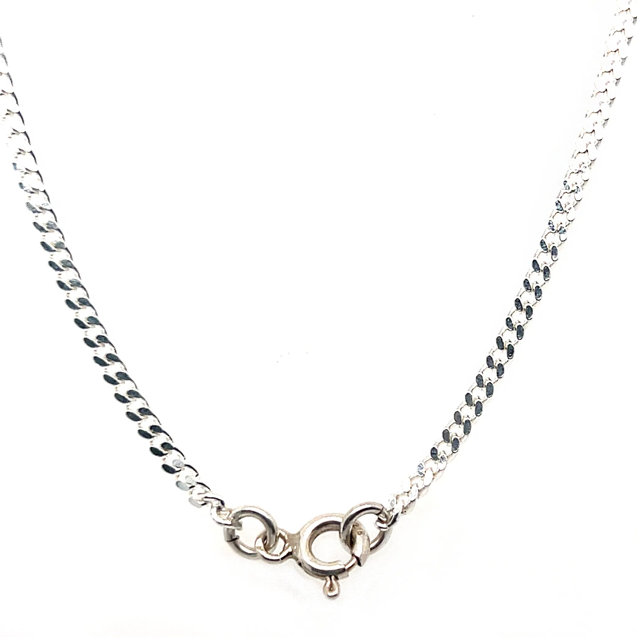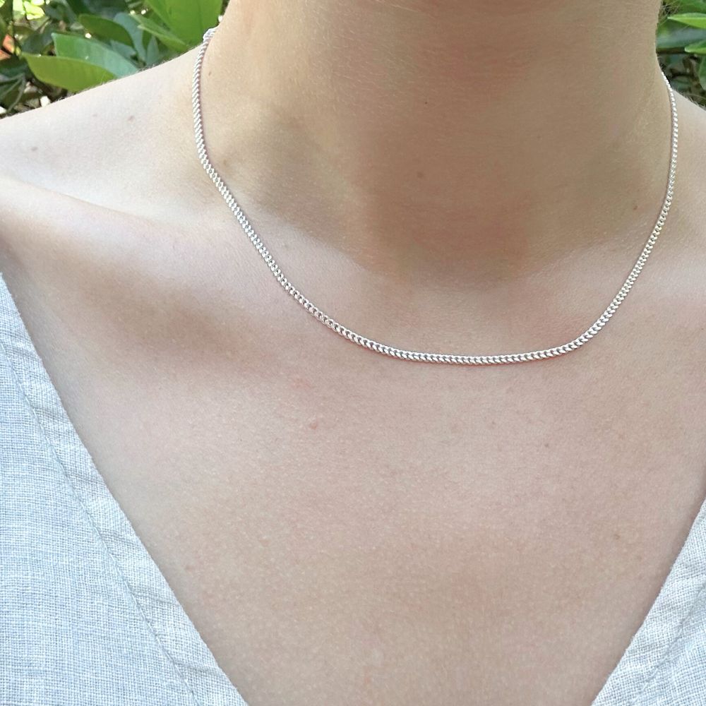 Our Fine Curb Silver Chain is crafted from polished .925 sterling silver with a delicate 0.2mm width. The fine interlocking curb links lie smoothly against the skin, giving it a refined and minimal look—perfect for lightweight pendants or layering.