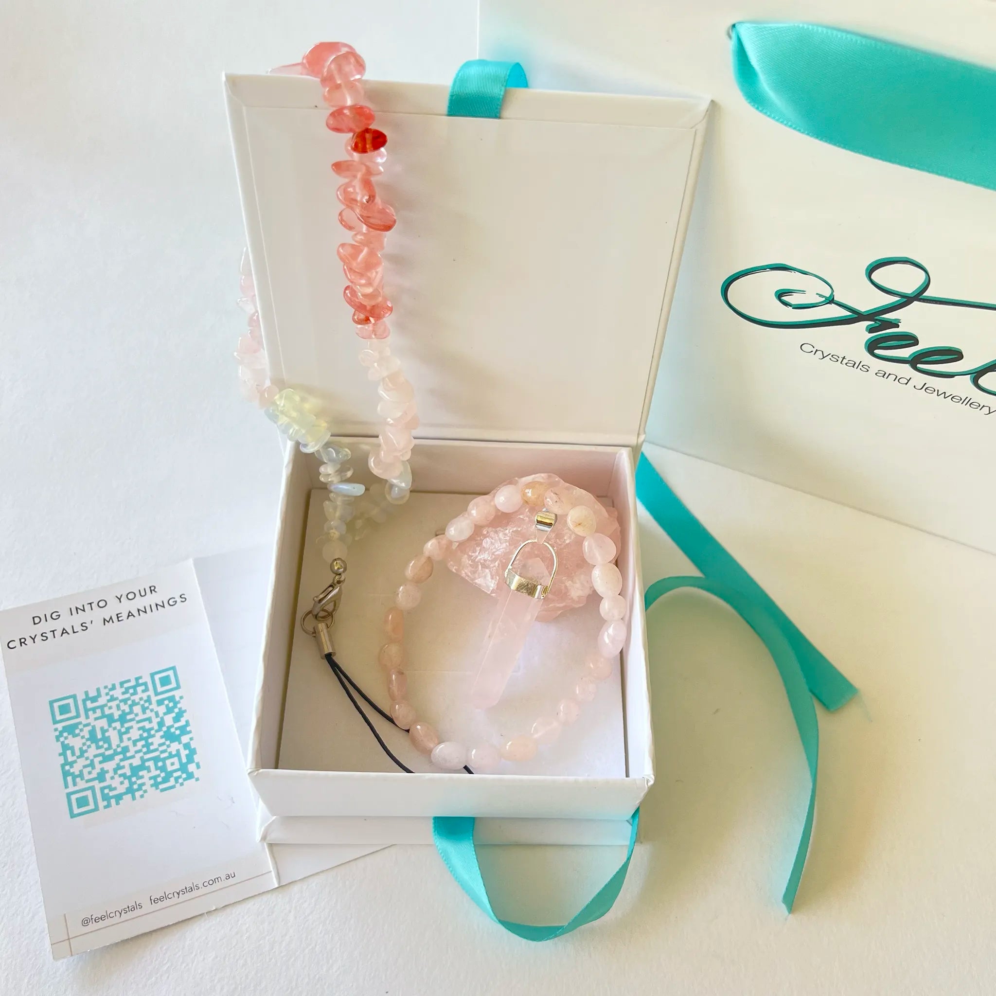 Each crystal has been specifically chosen for its felt properties of love. Traditionally, these stones have been used to invite love into all areas of life, support emotional healing, and enhance self-worth. They serve as gentle reminders to remain open to giving and receiving love, compassion, and kindness.