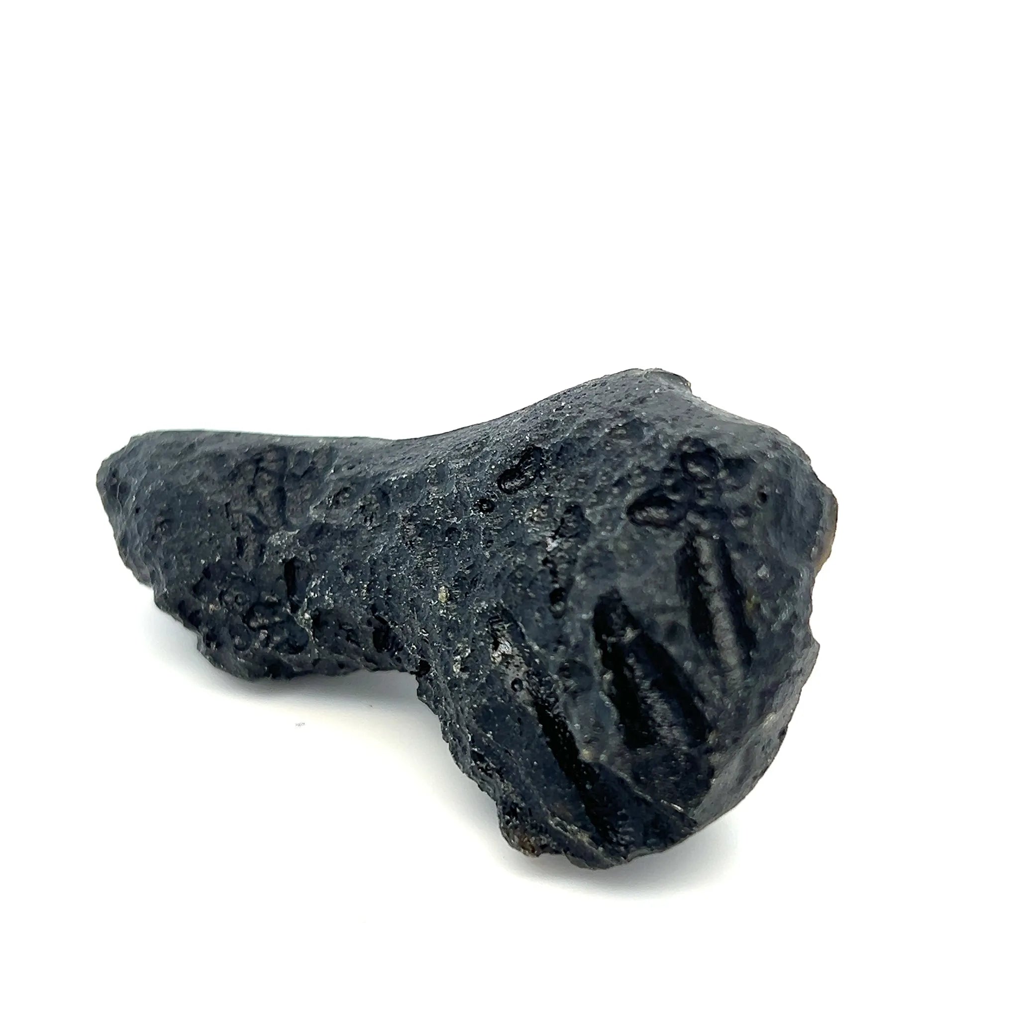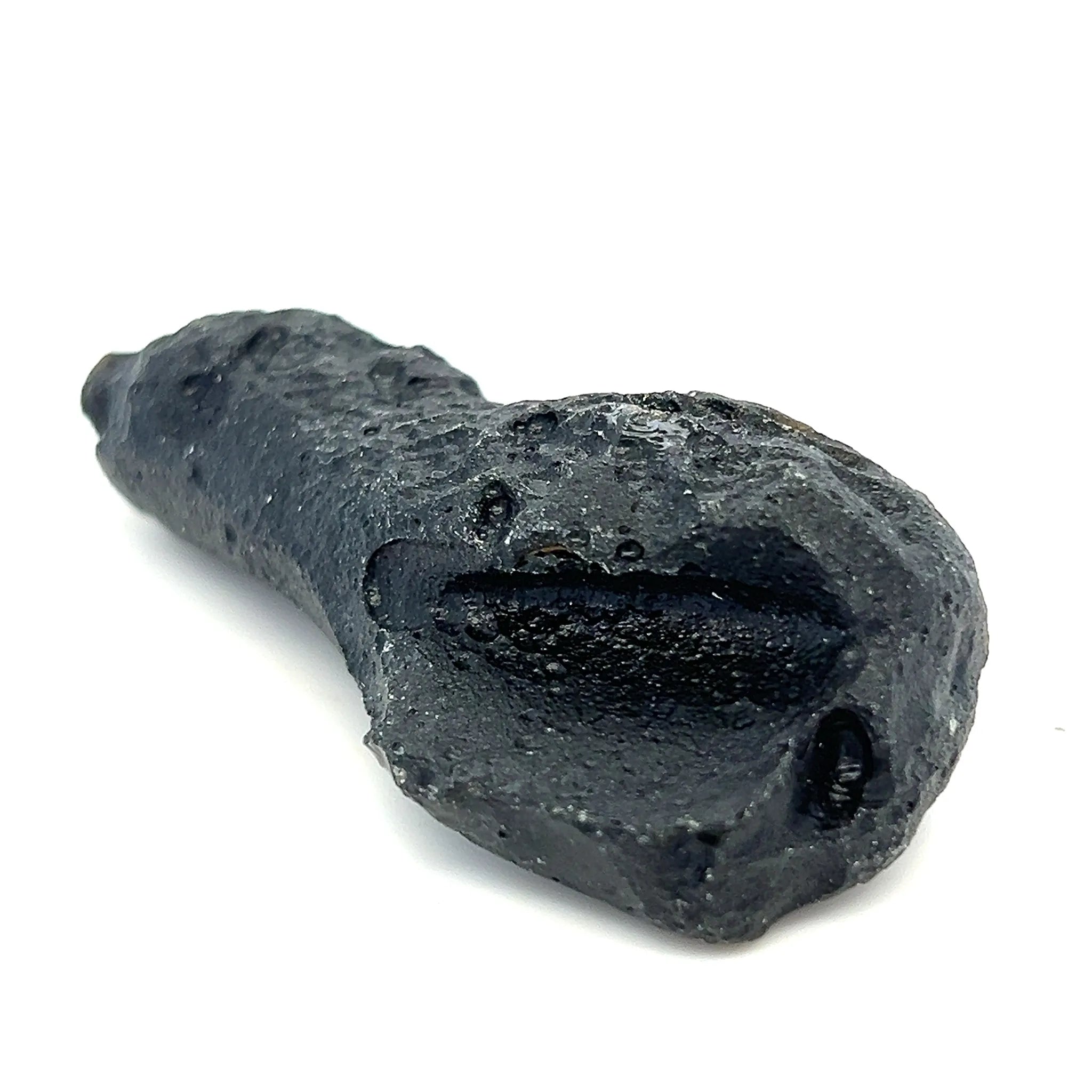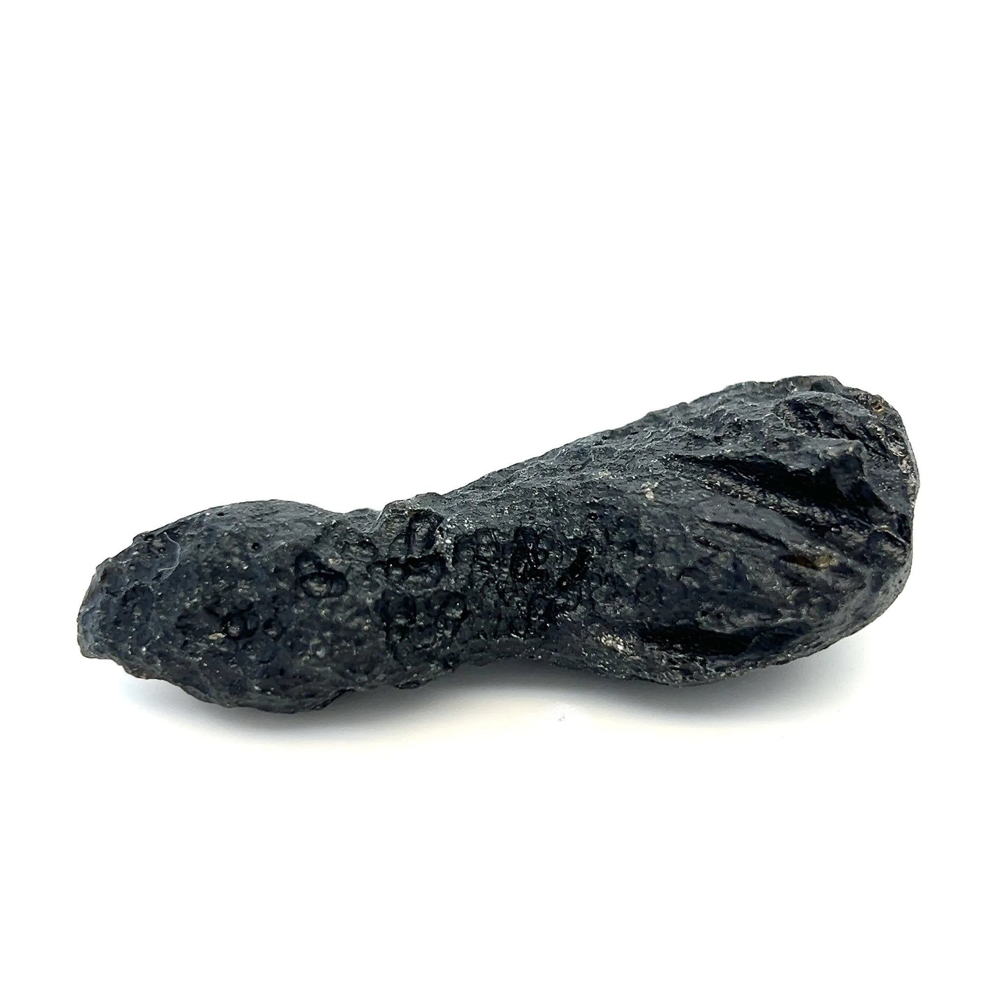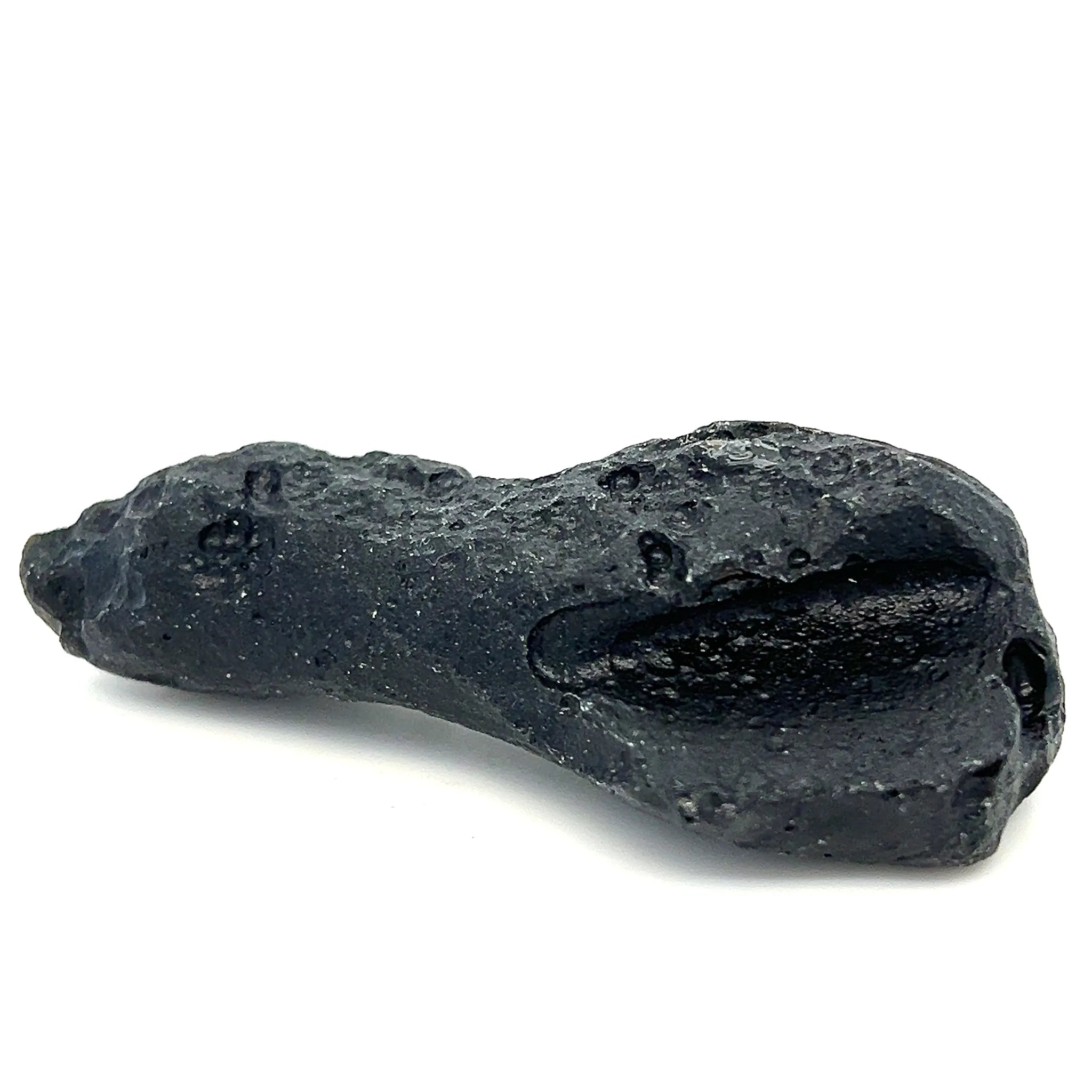 This Genuine Tektite from Zhanjiang, Guangdong, China, displays a natural, rugged black form with a glassy texture and unique pitted surface.