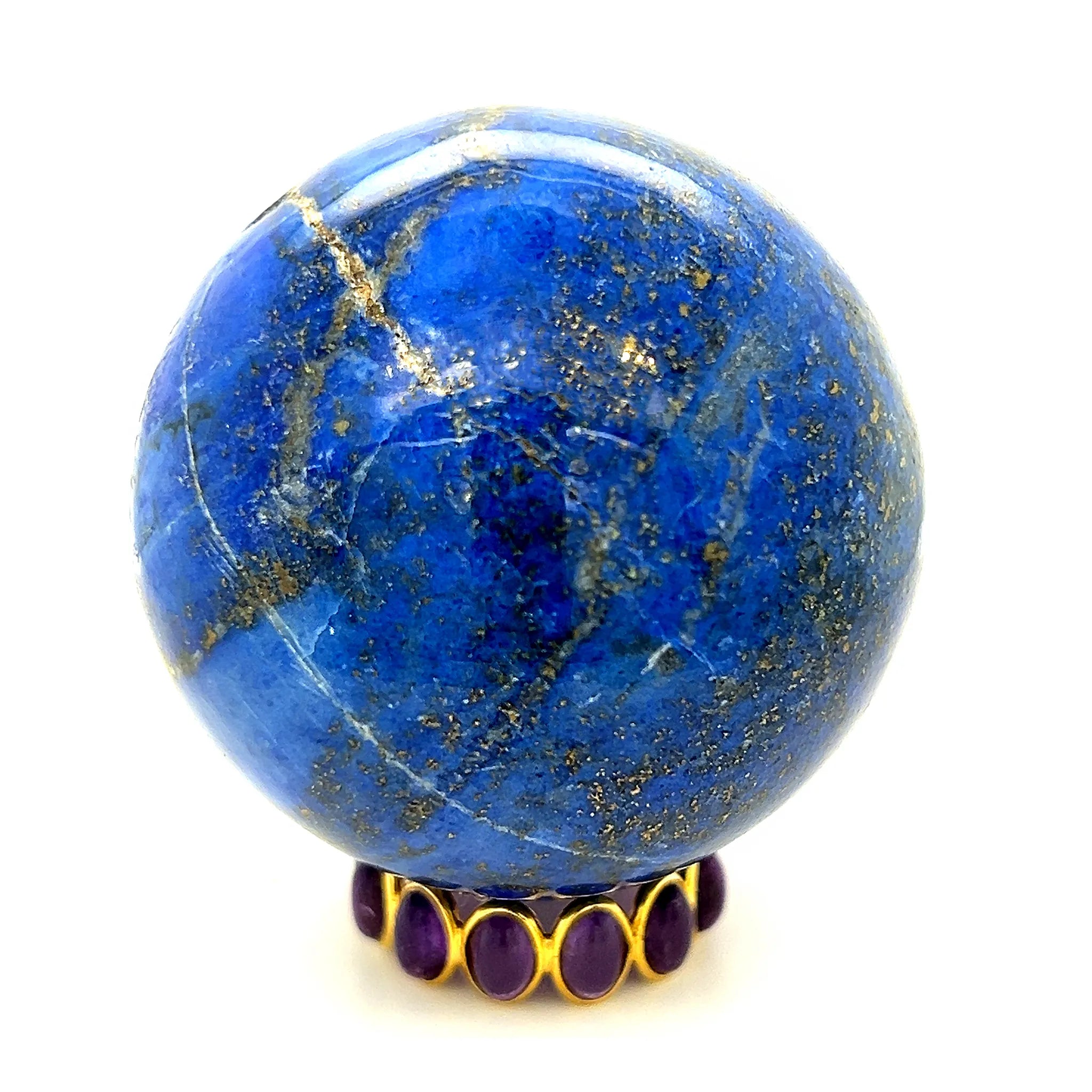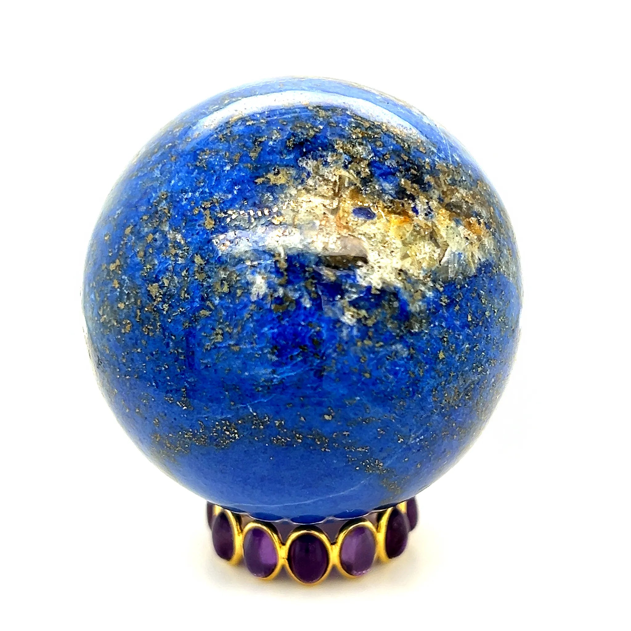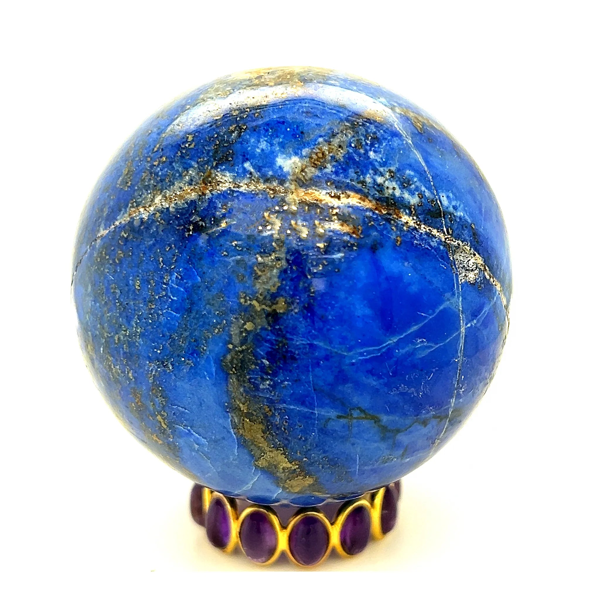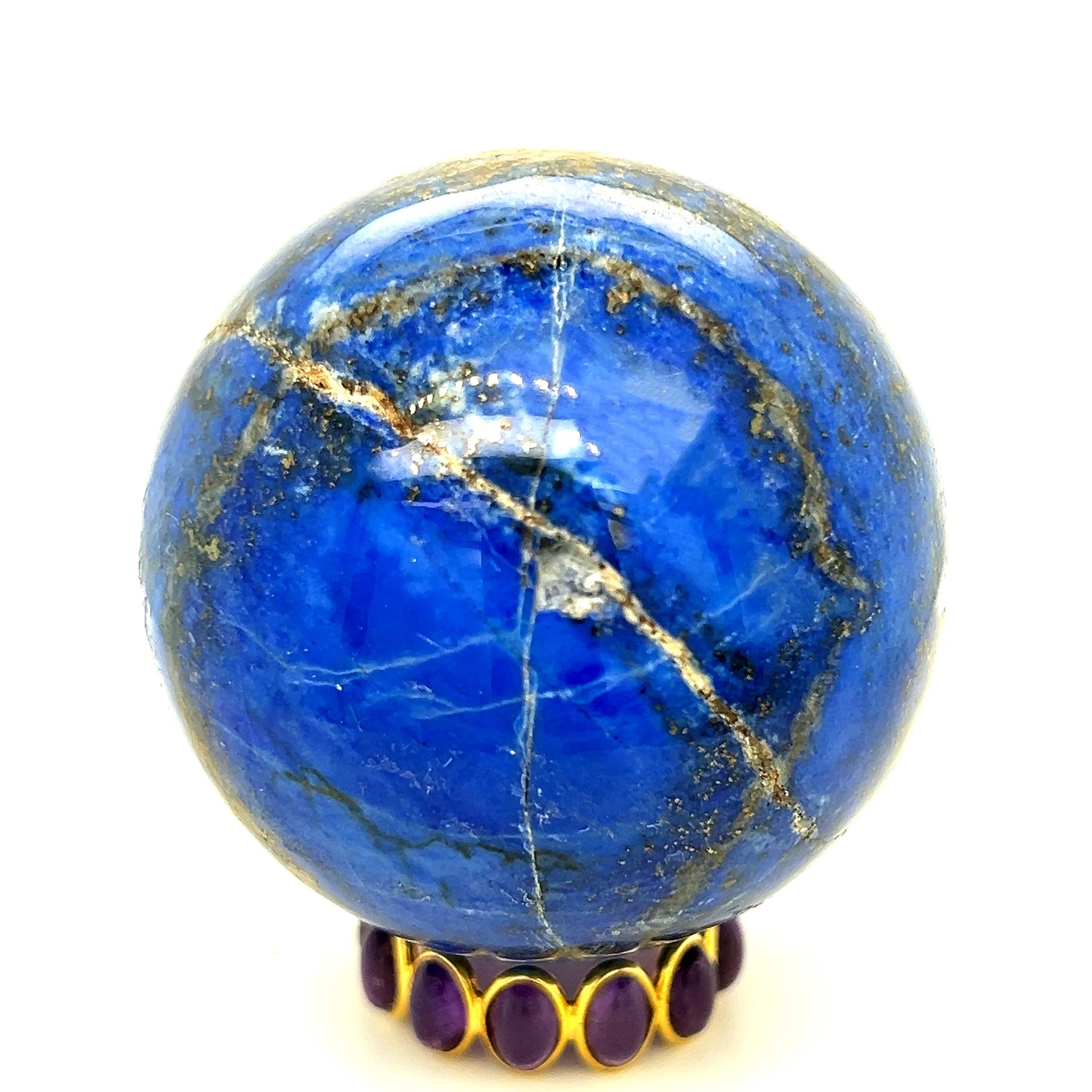 This 5cm Lapis Lazuli sphere draws the eye with its rich, deep blue tone and a striking natural ring of golden pyrite.
