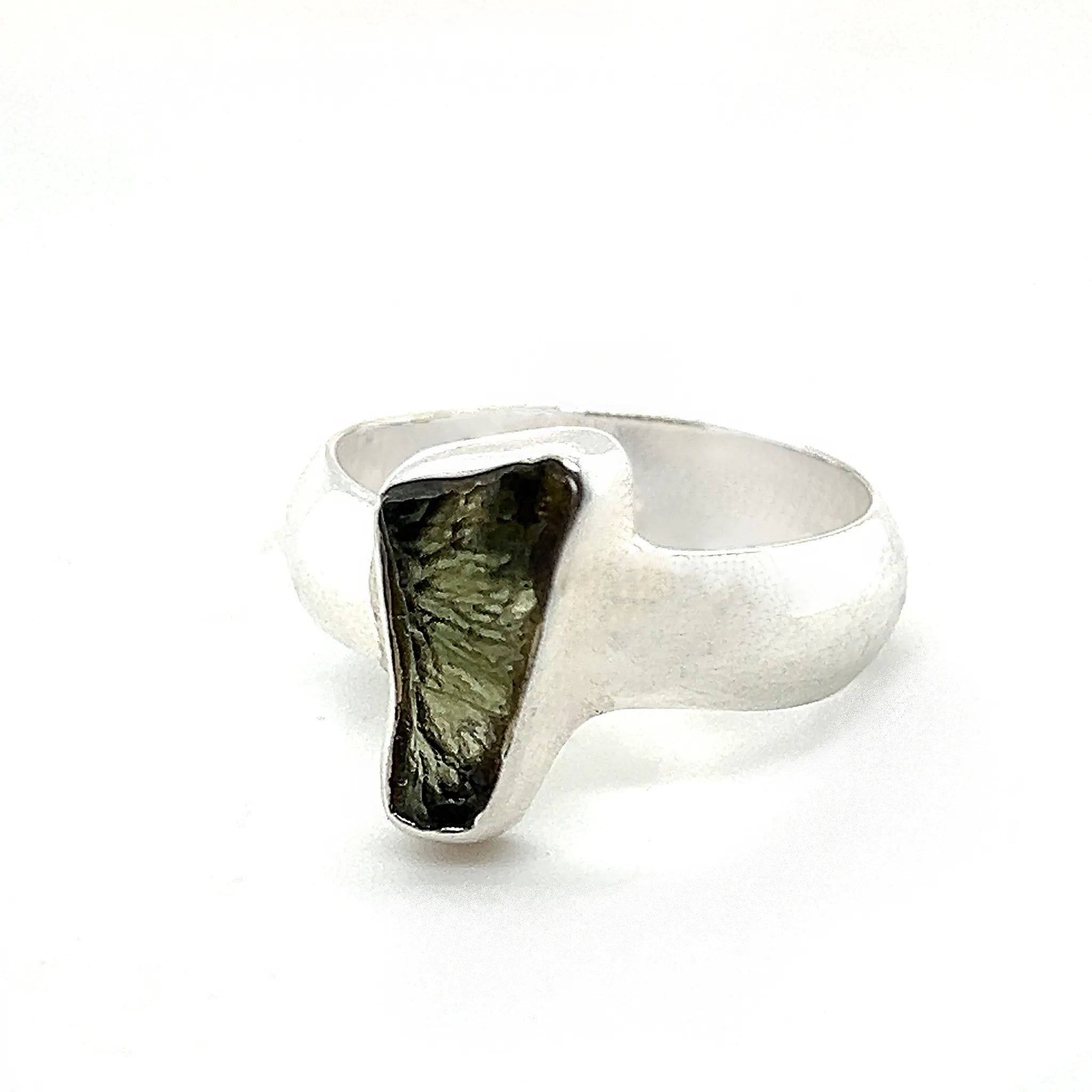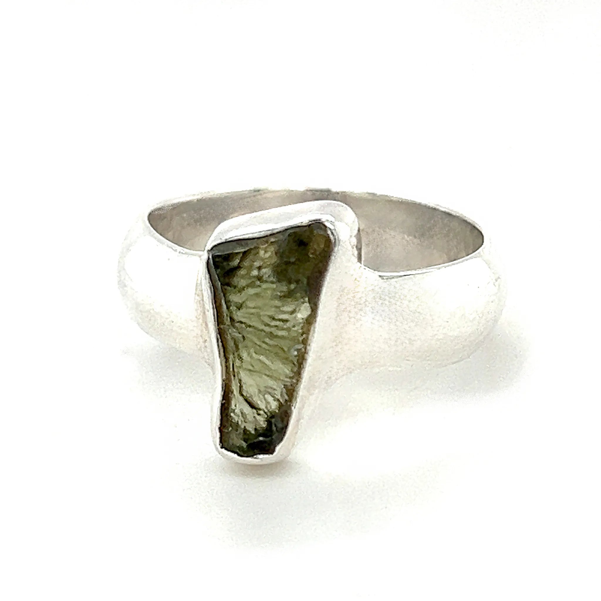 Genuine Raw Moldavite Ring - Size 9, sourced from the Czech Republic. Set in .925 sterling silver, this rare Meteorite is prized for transformation and spiritual growth.