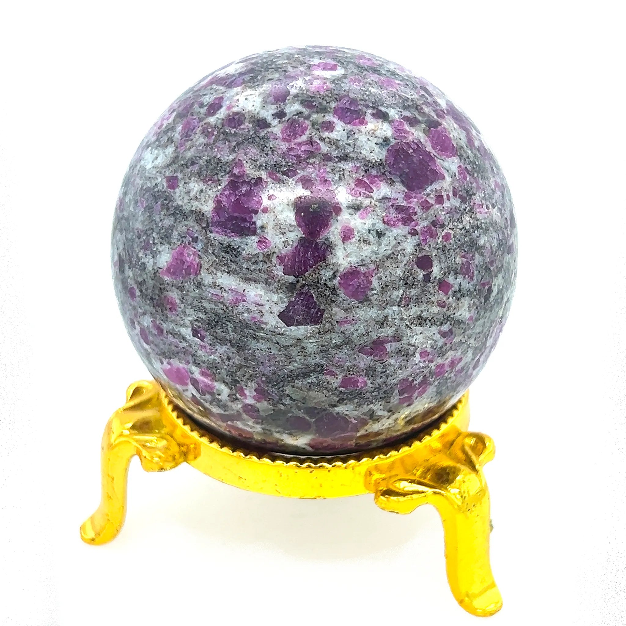 This 5.5cm polished sphere features vivid red Ruby crystals naturally embedded in a contrasting white and grey feldspar matrix.