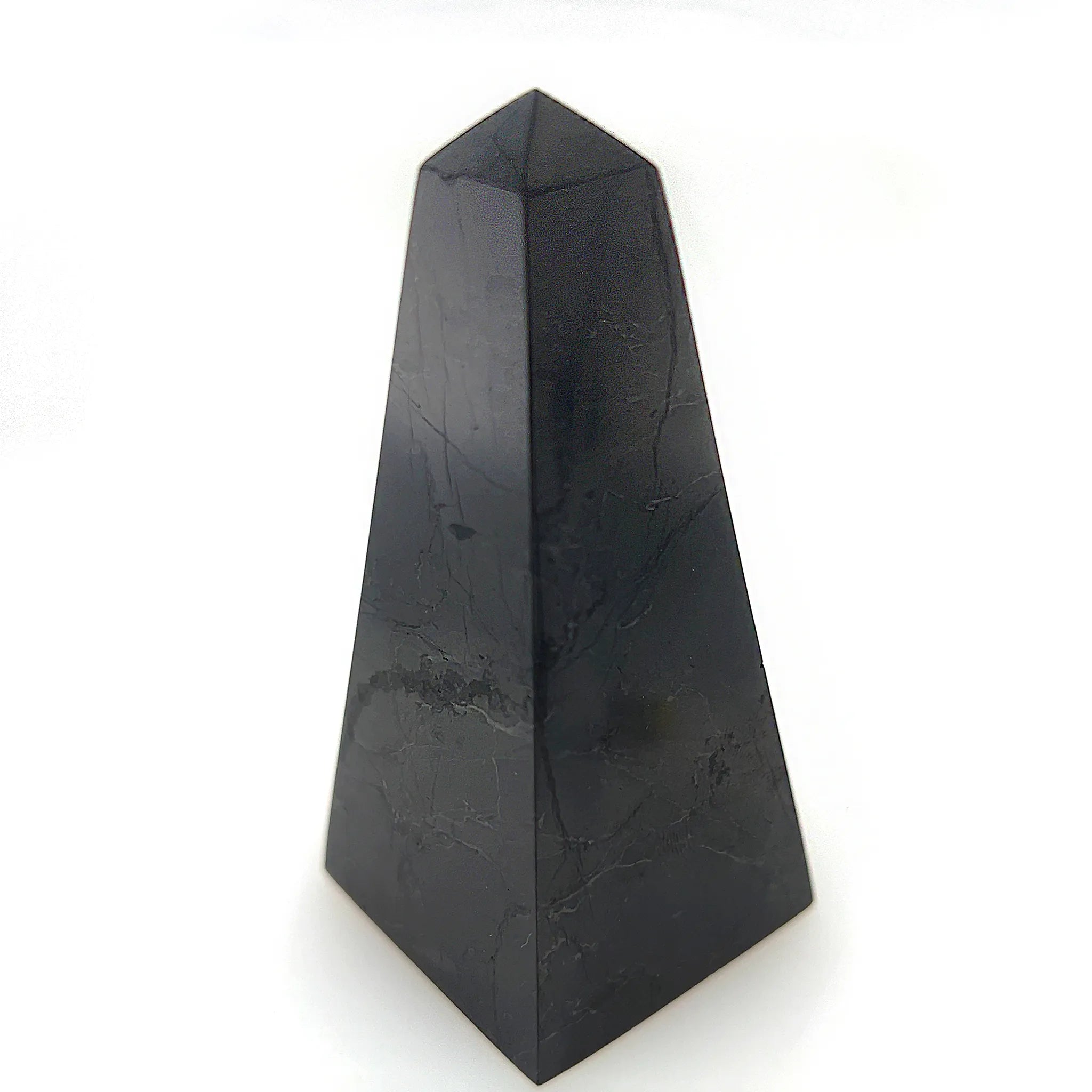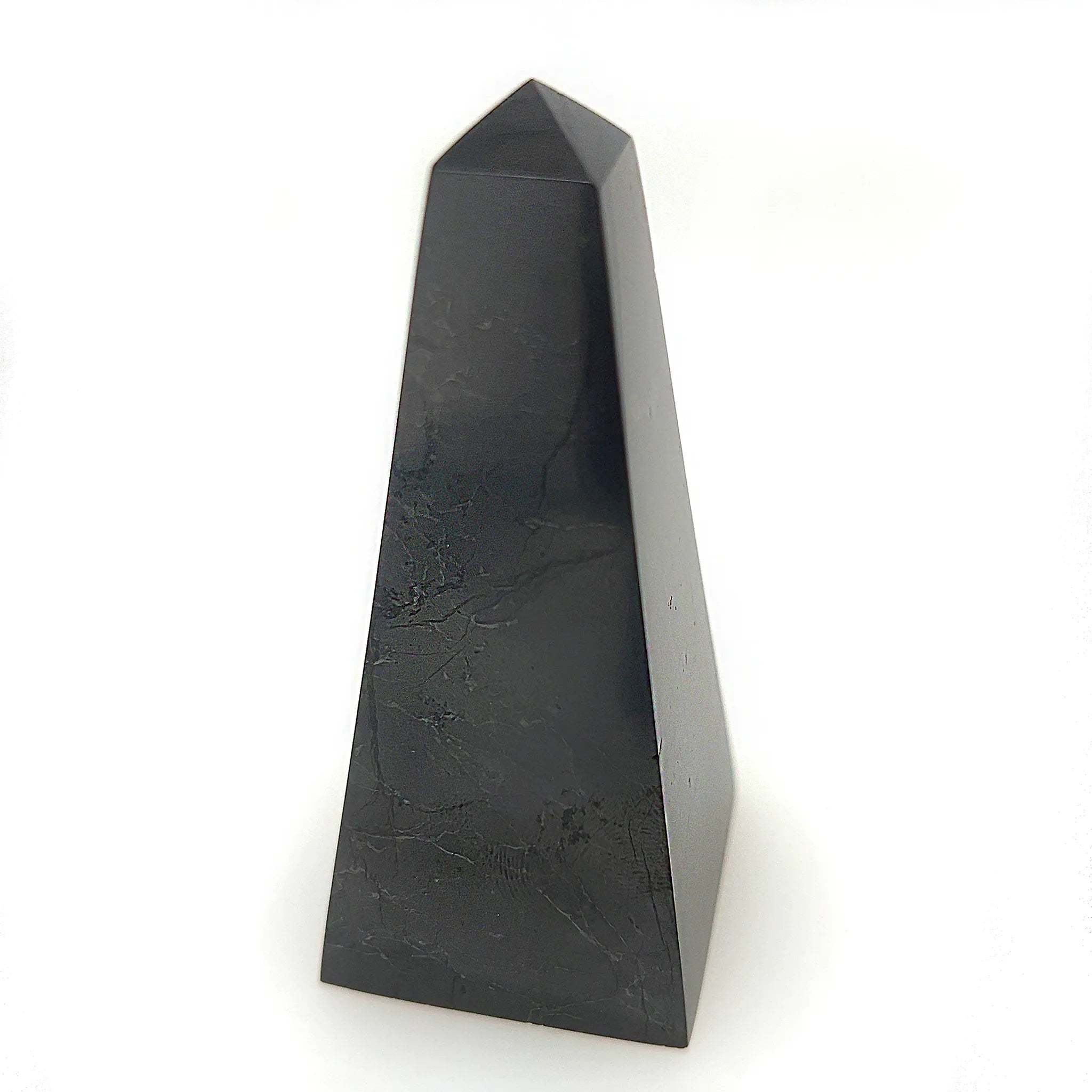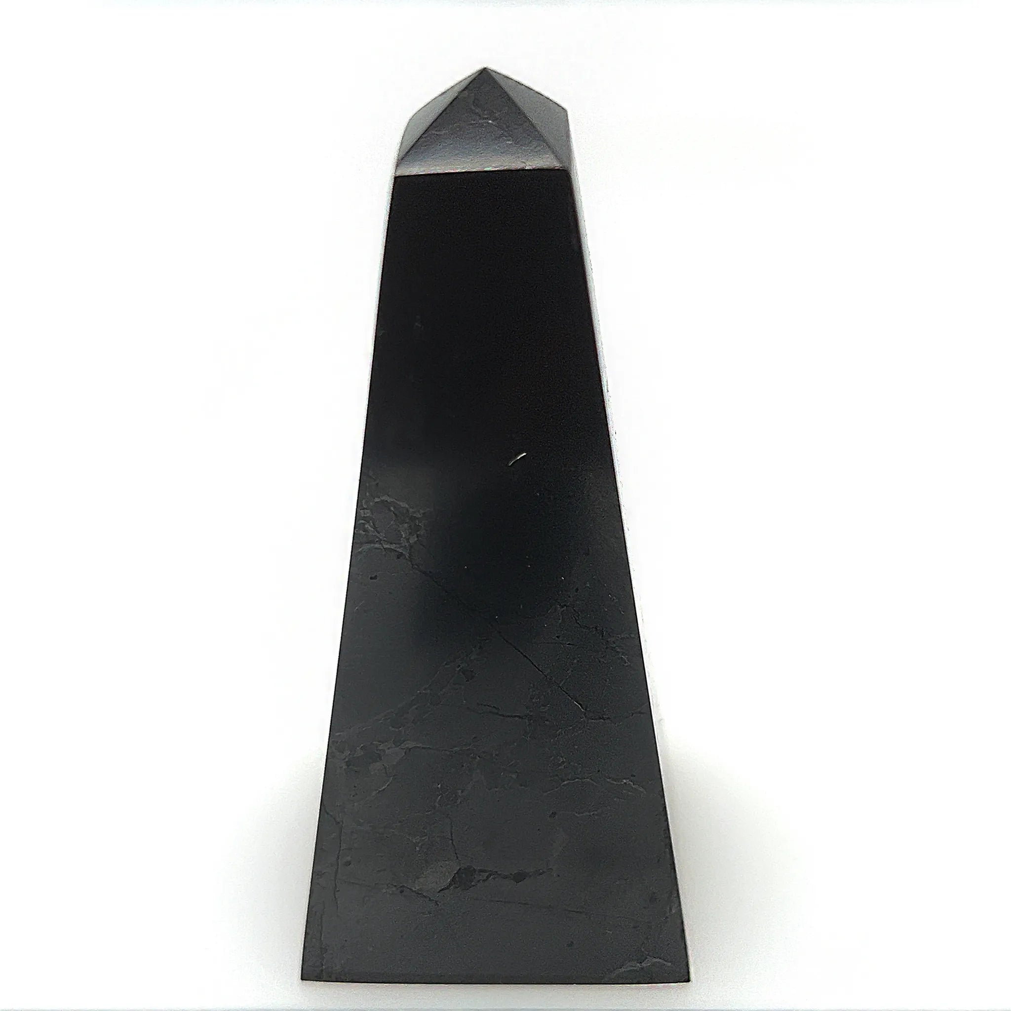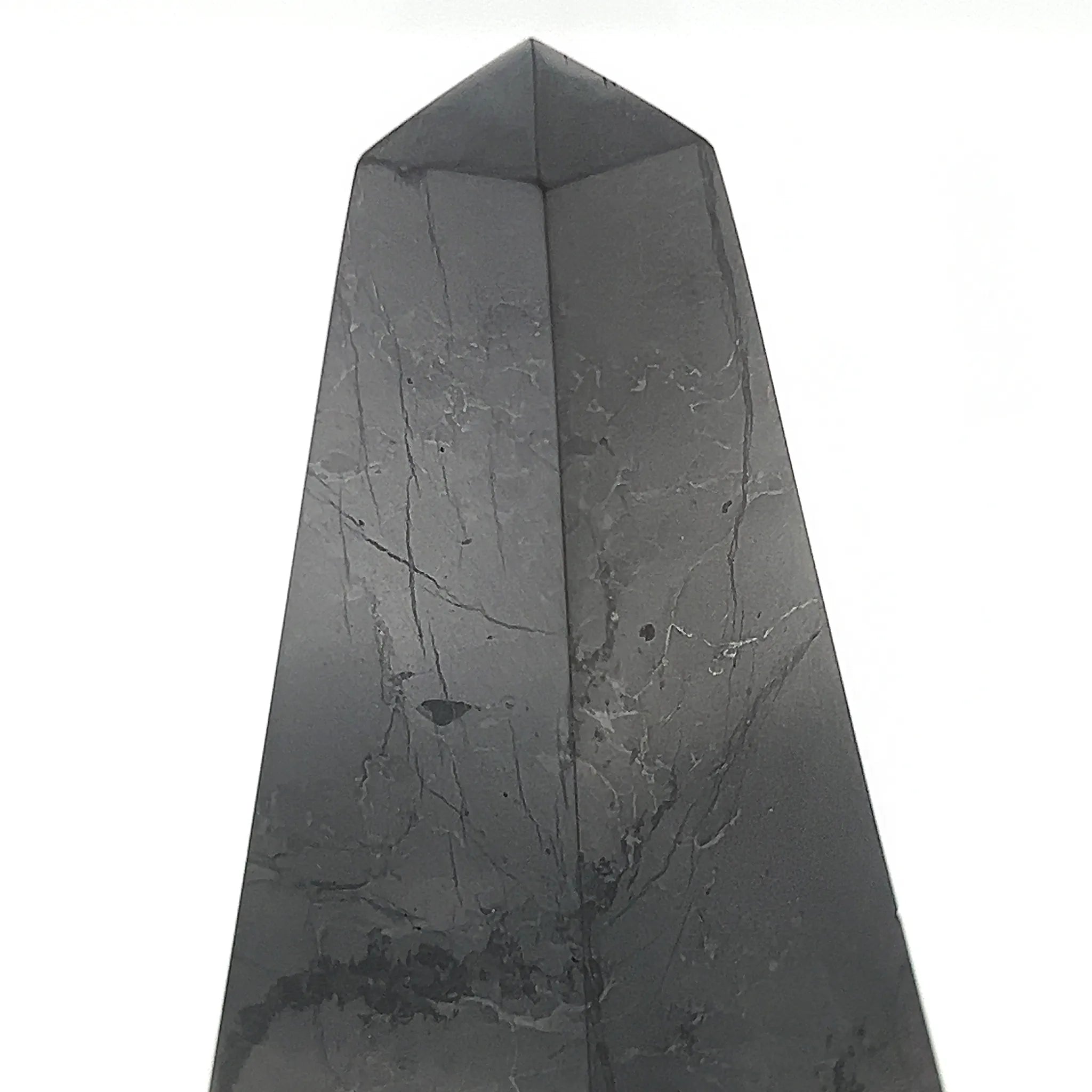 This polished Shungite obelisk is a sleek black stone with natural, subtle patterns from Russia's Karelia region. The obelisk shape, symbolic of transformation and ascension, focuses energy through its pointed tip while grounding with its stable base. Shungite, known for its purifying and protective properties, is said to absorb negative energies and electromagnetic radiation, making it ideal for home or workspace energy balancing.