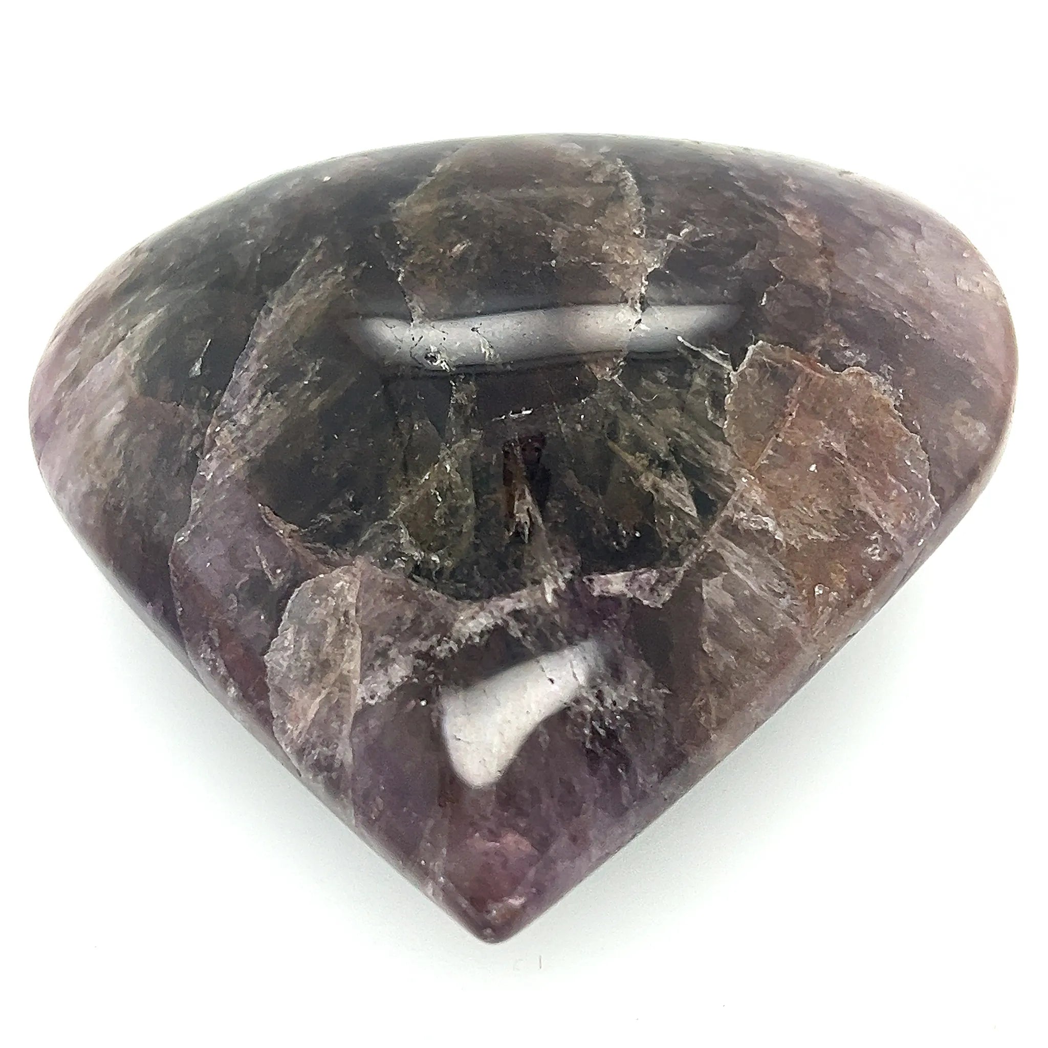 The Super Seven Large Polished Heart is a unique crystal renowned for its blend of seven distinct minerals: Amethyst, Quartz, Smoky Quartz, Cacoxenite, Rutile, Goethite, and Lepidocrocite.