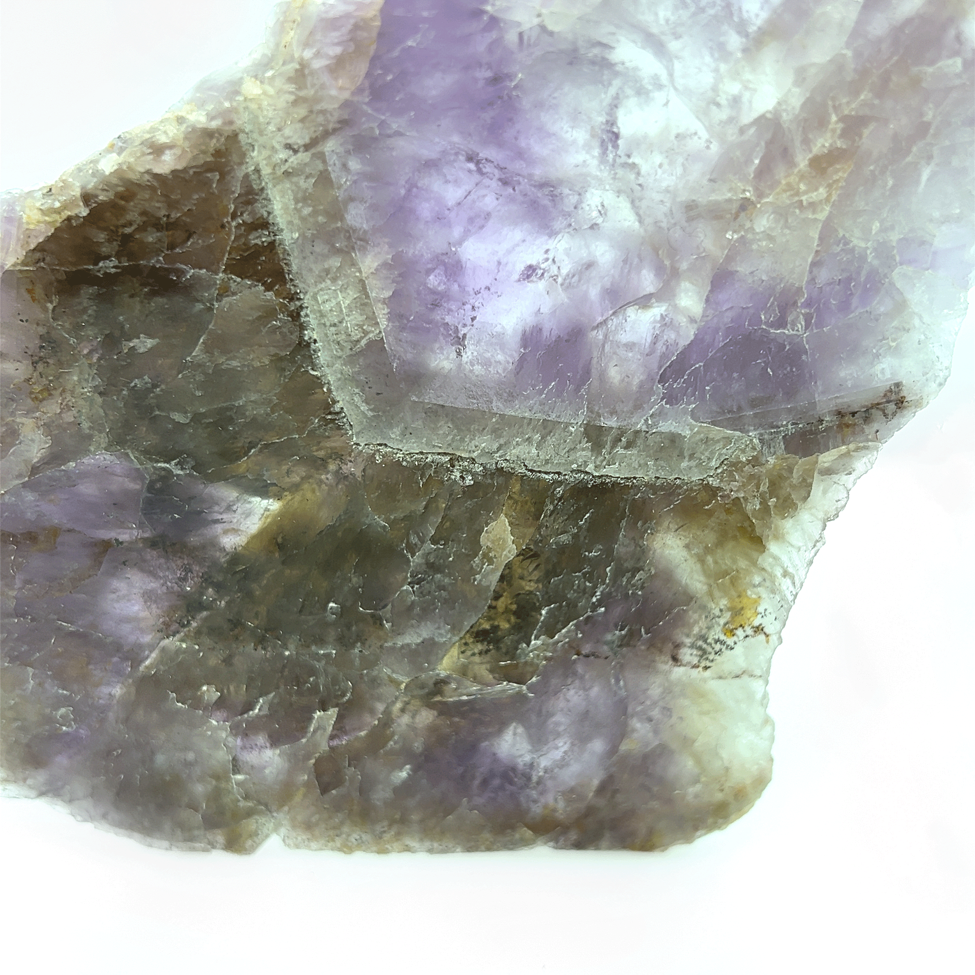 This Super Seven Polished Slice is a stunning display of distinct colours, showcasing a deep purple body that transitions into a lighter purple tip. The slice also features distinct bands of Quartz, one of the seven minerals that compose Super Seven.