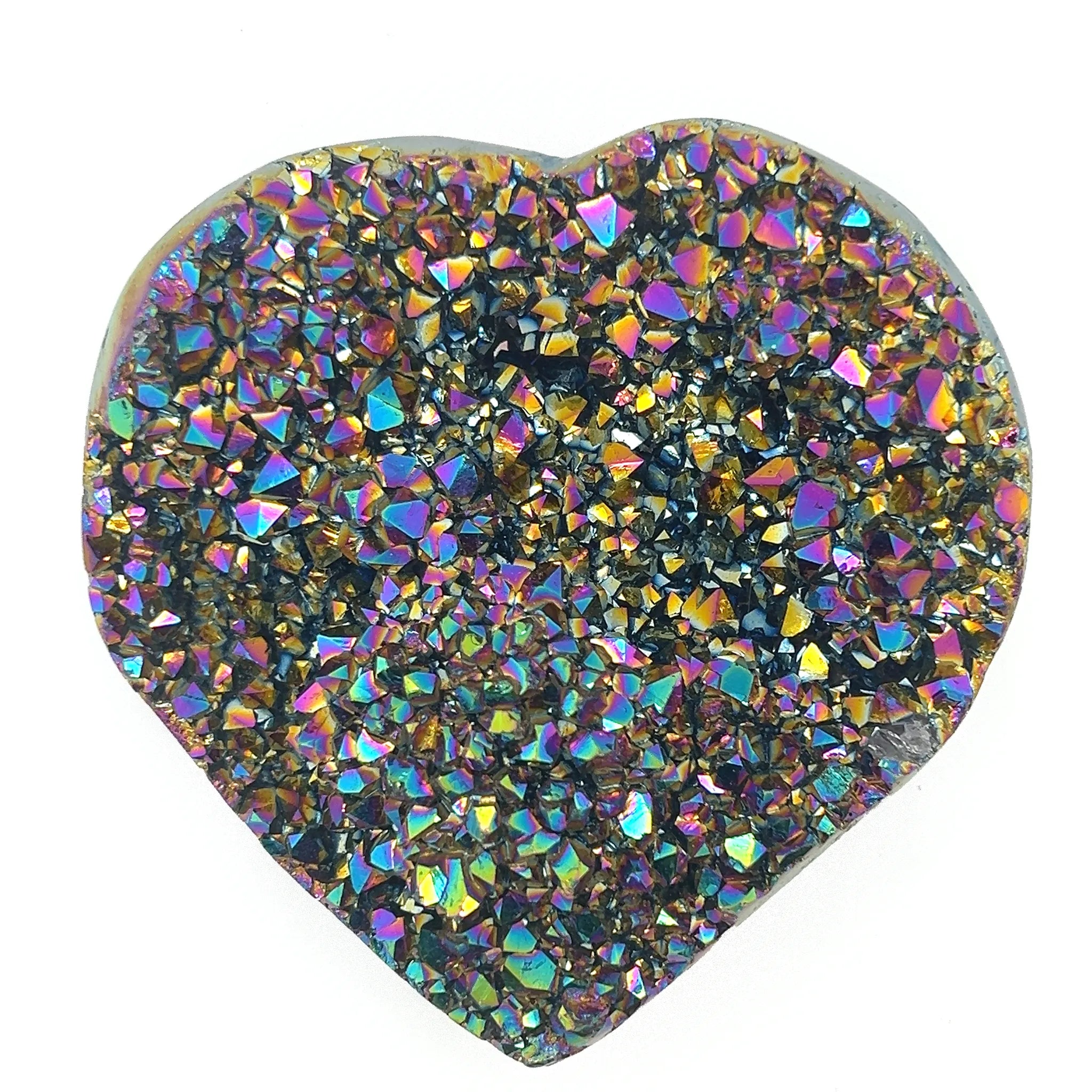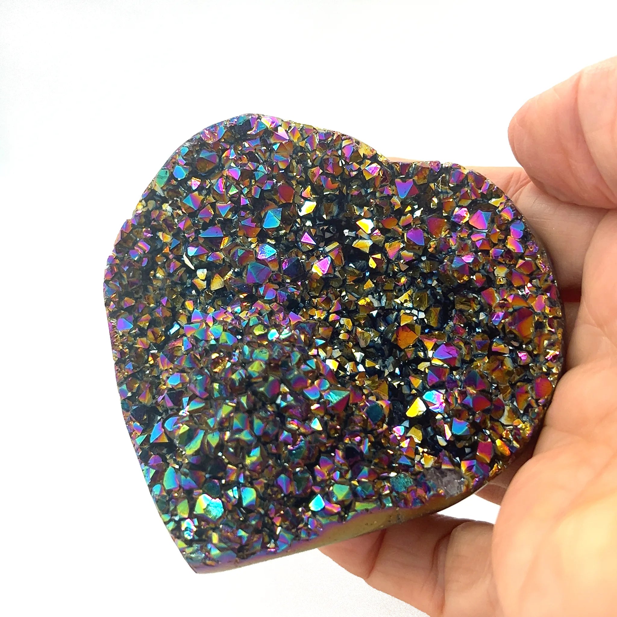 This striking Titanium Amethyst Cluster Heart combines the raw beauty of nature with a vibrant metallic finish. Amethyst forms within volcanic geodes, where silica-rich fluids crystallise over millennia into shimmering purple quartz points.