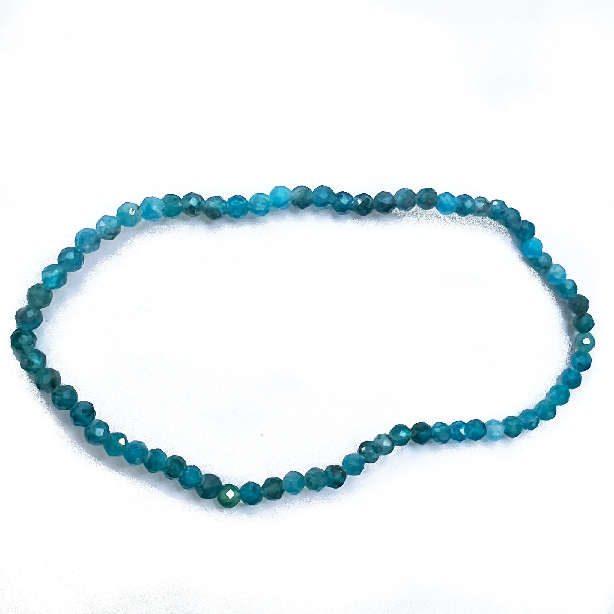 This Blue Apatite Micro Bead Bracelet features finely faceted 3mm natural Blue Apatite gemstones in rich ocean-blue tones, with subtle variations from teal to deep blue. The polished beads catch the light beautifully, creating a delicate yet vibrant piece designed for everyday wear.