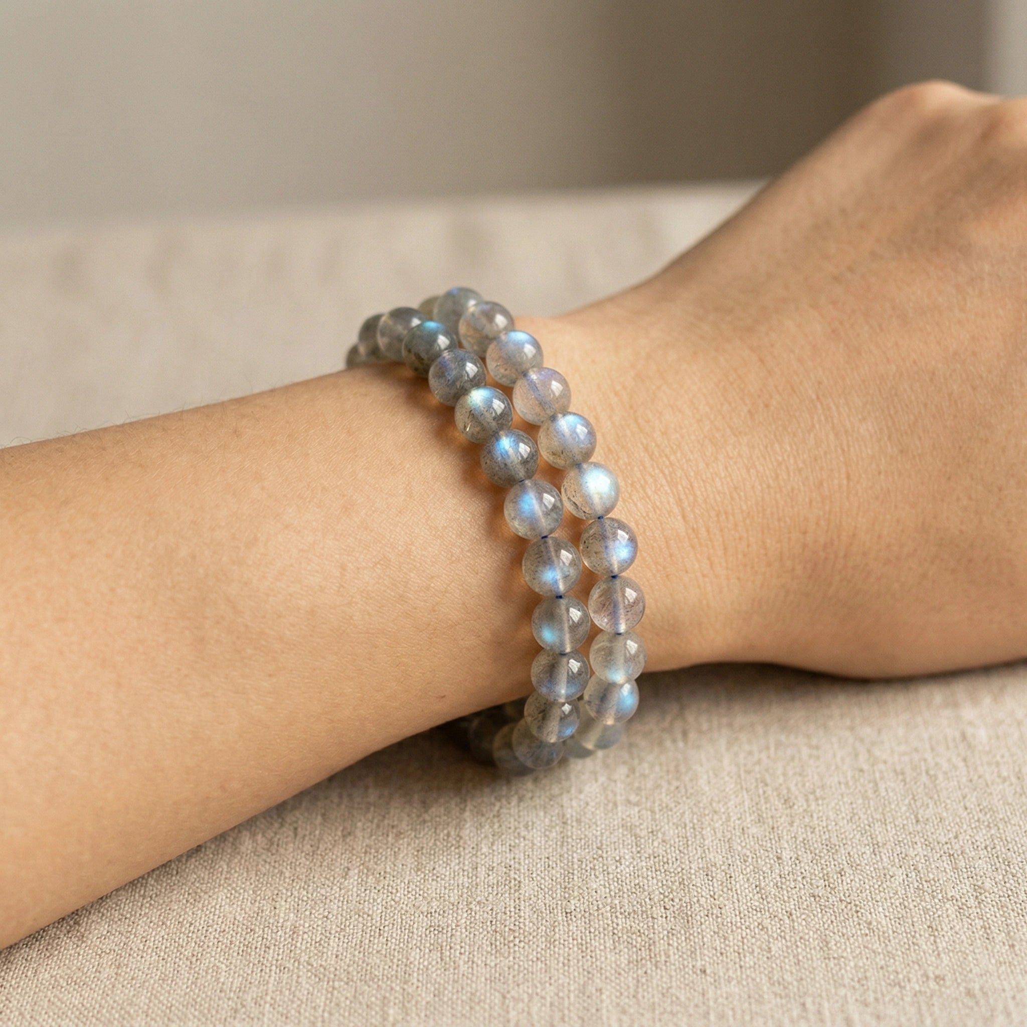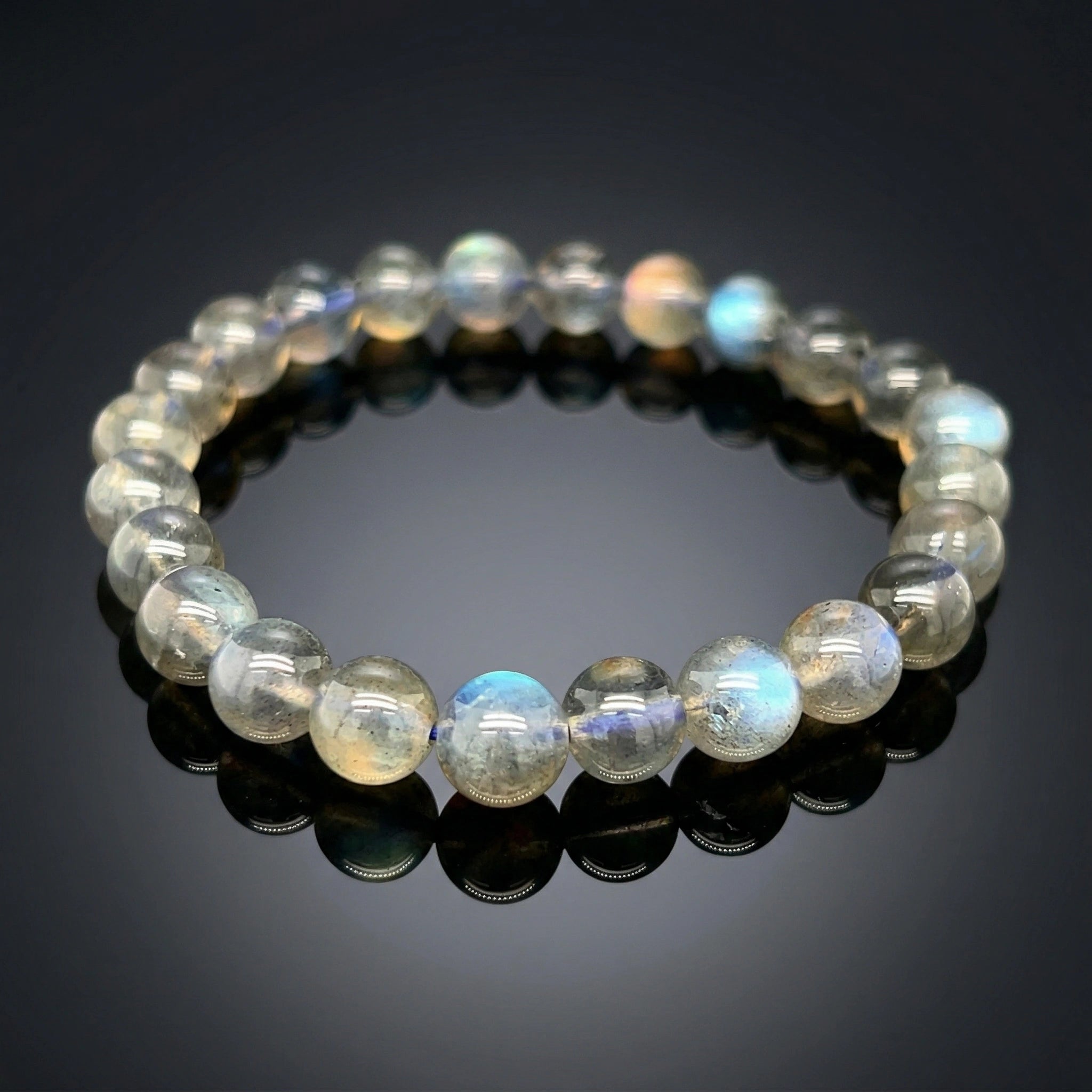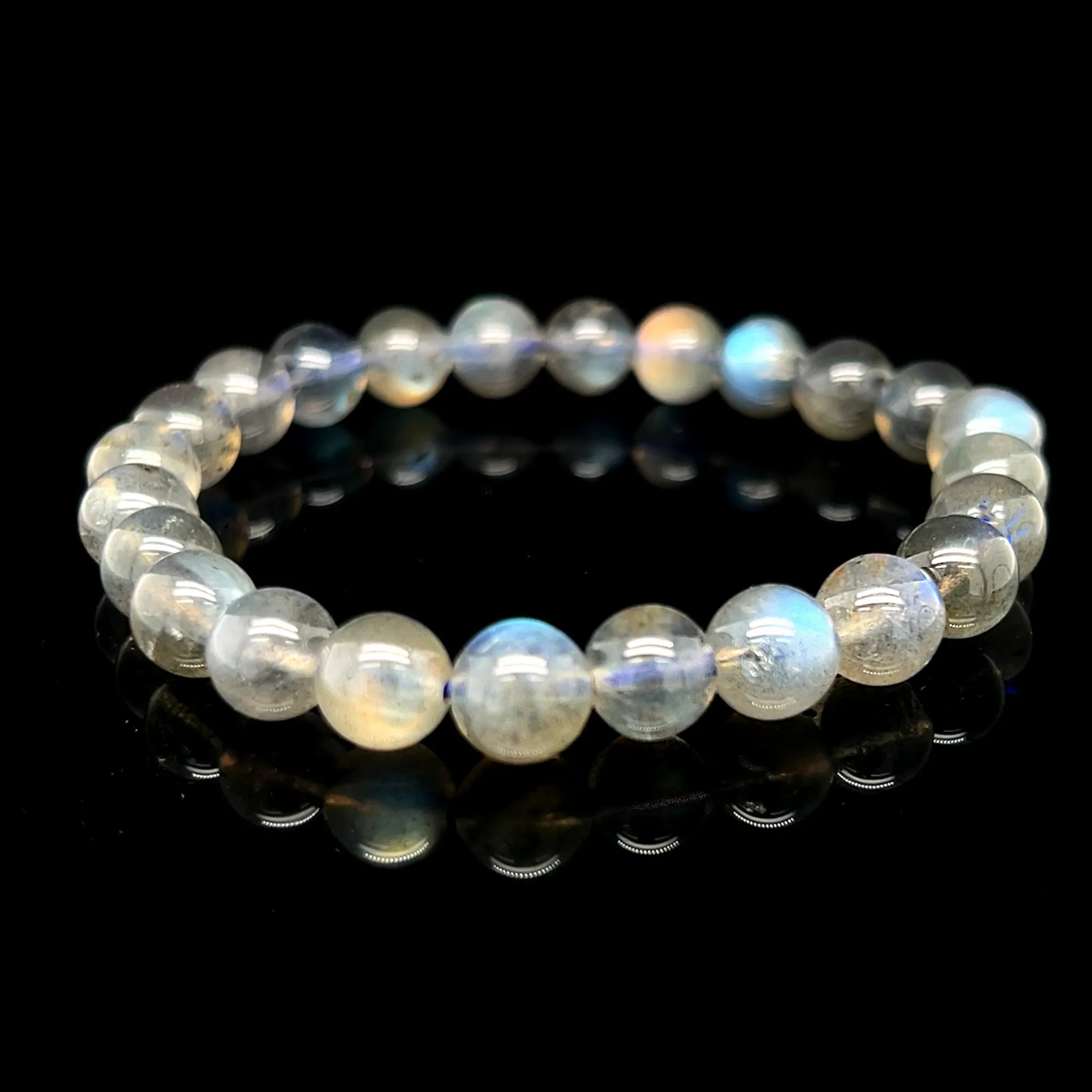 This High-grade Labradorite round bead bracelet displays soft grey tones lit by blue, gold and icy flashes. Available in 7mm and 9mm beads, this natural gemstone bracelet is a versatile piece for everyday wear.