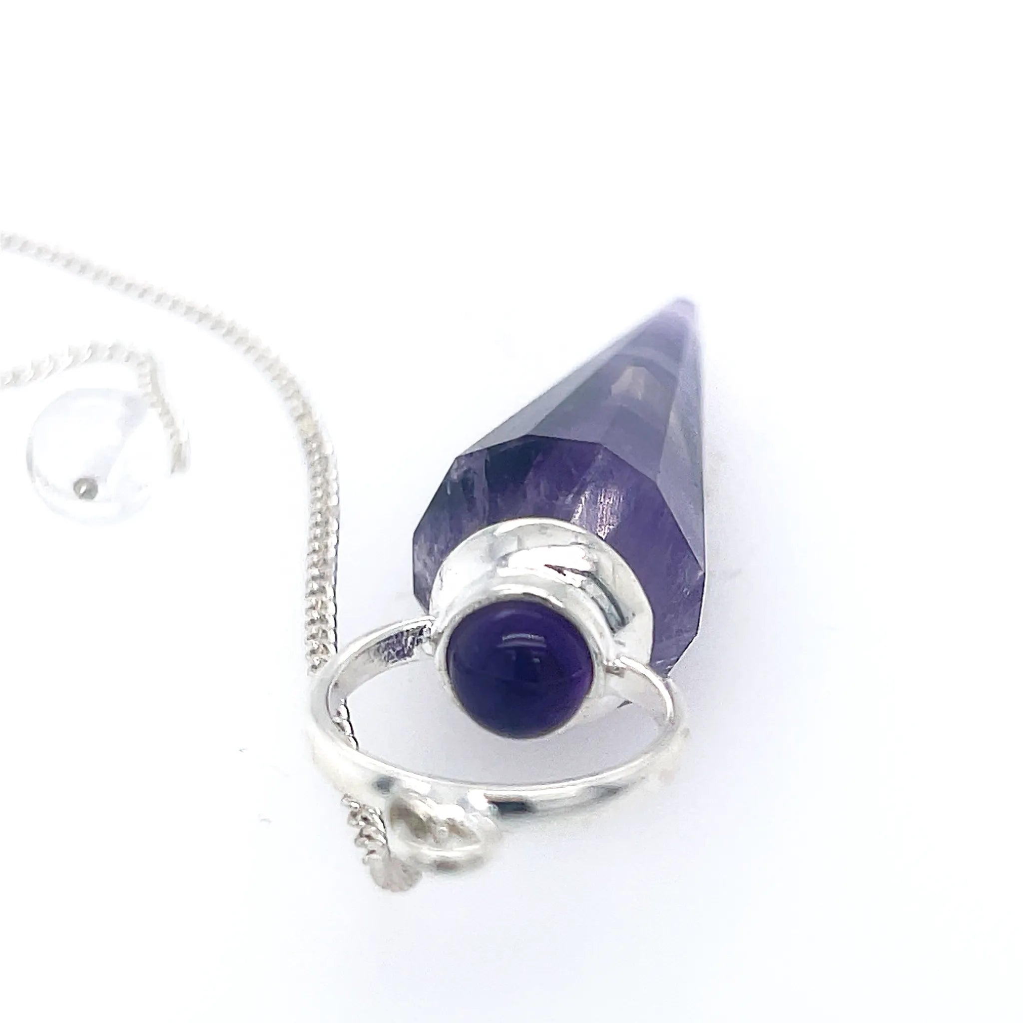 This Amethyst Pendulum displays a polished faceted point with a round Amethyst cabochon on top, suspended on a 15 cm silver-plated chain.
