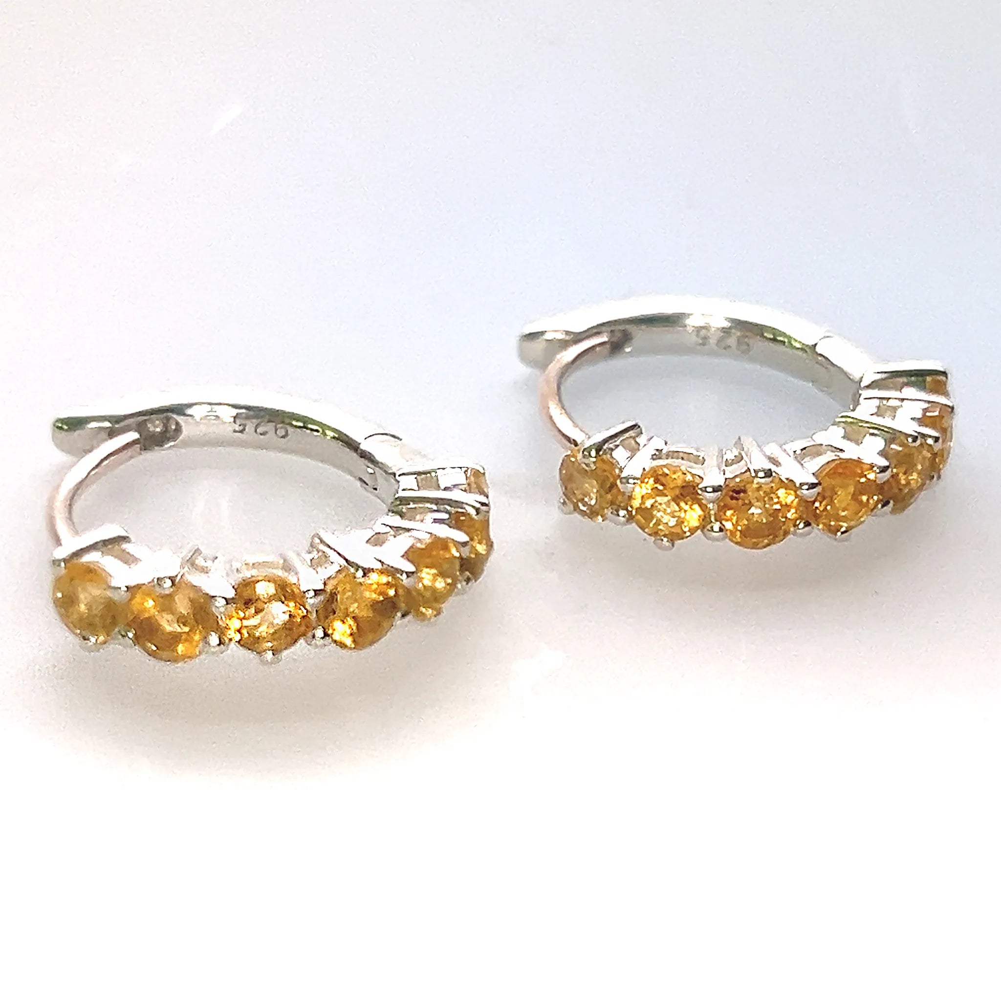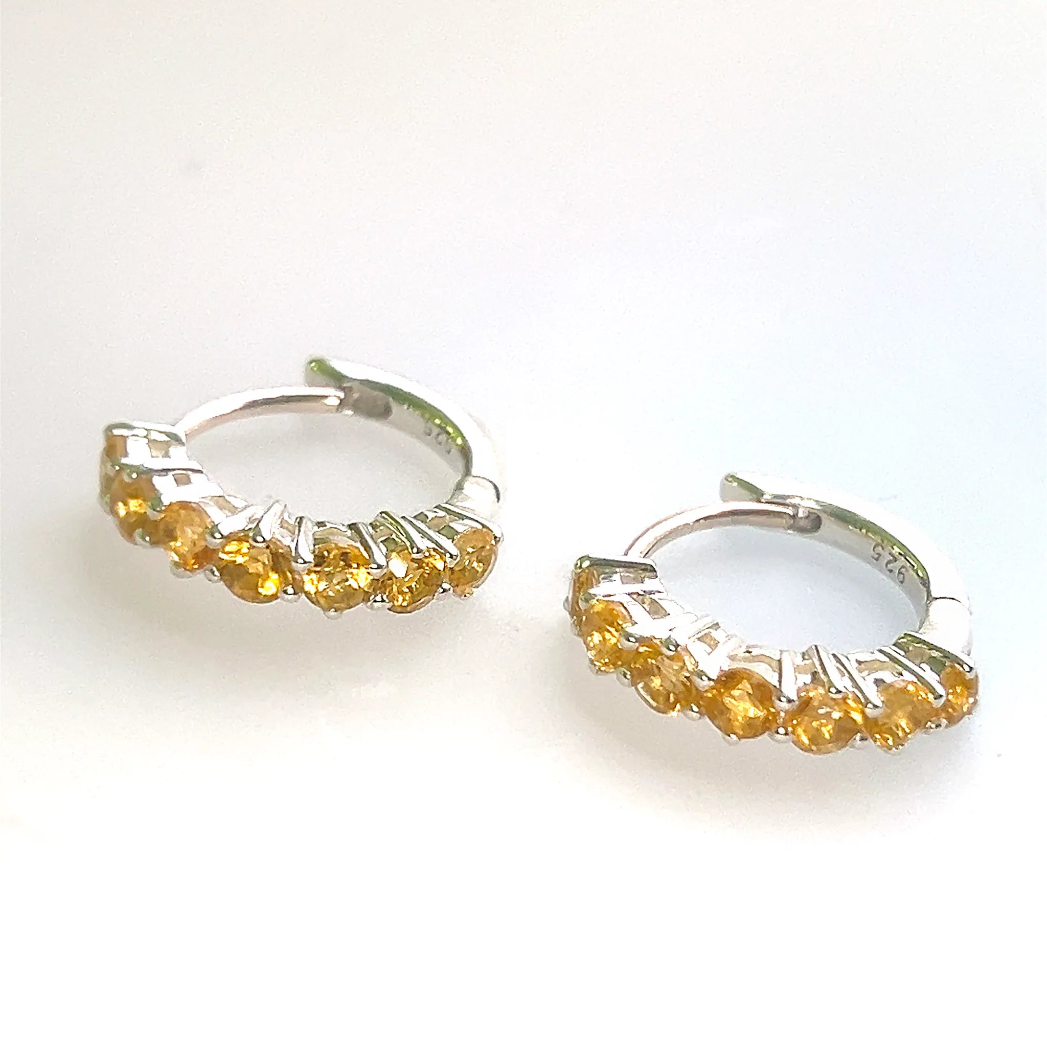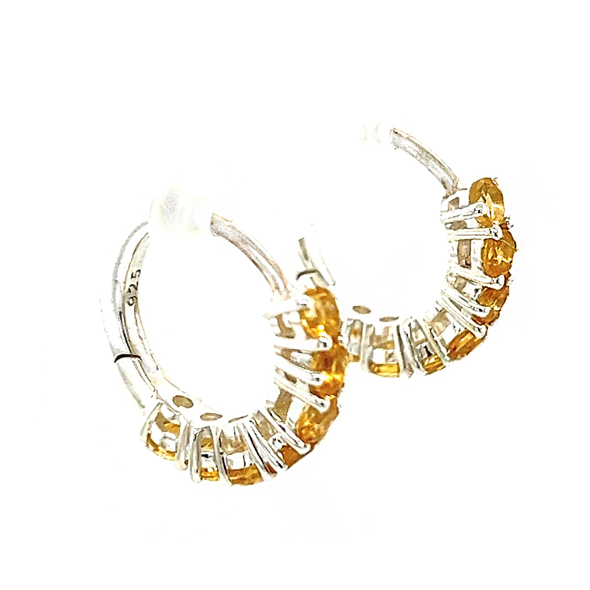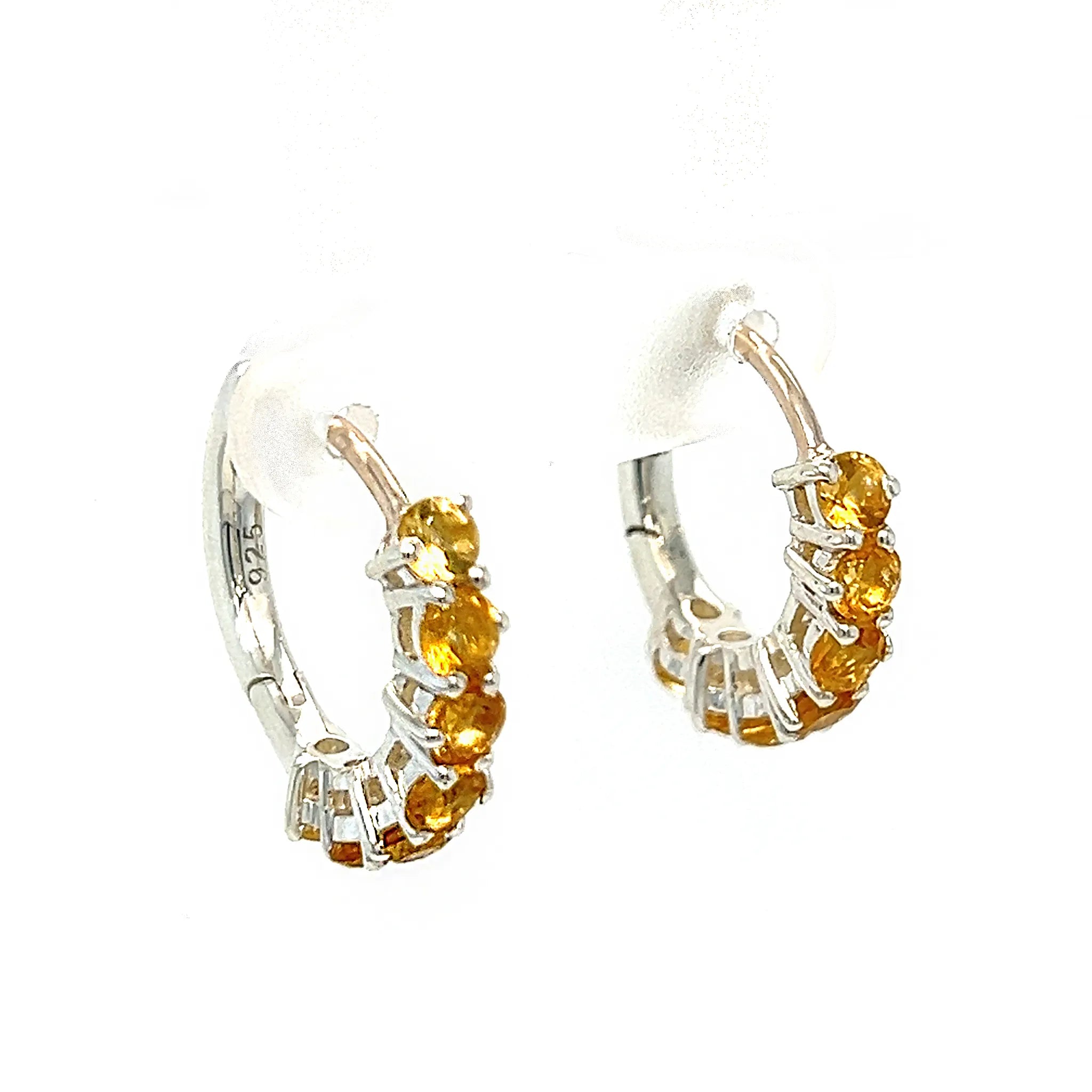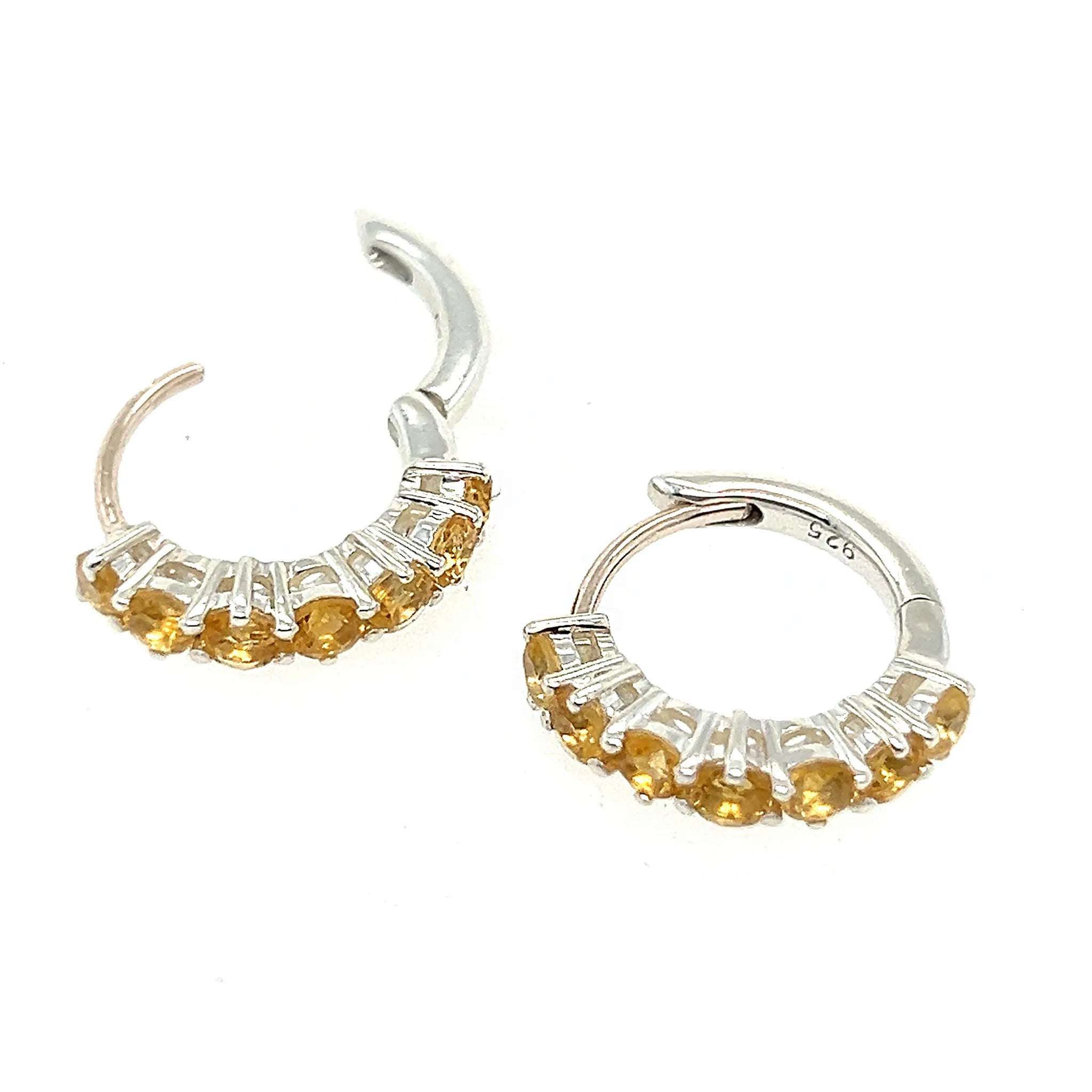 These exquisite hoop earrings feature seven small faceted Citrine gemstones set in a secure claw setting along a sleek semi-circle design. Crafted in .925 sterling silver, the warm golden hues of the Citrine stones add a touch of sunshine and sophistication to any outfit.
