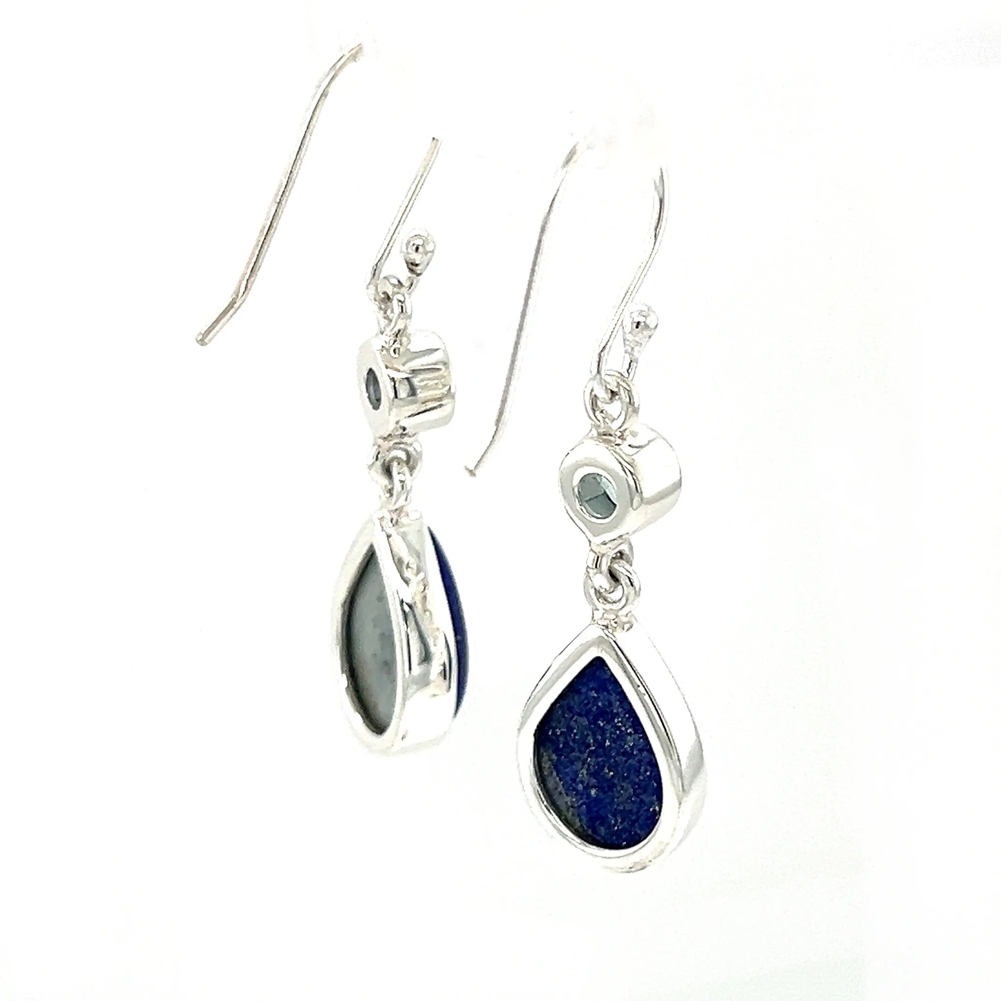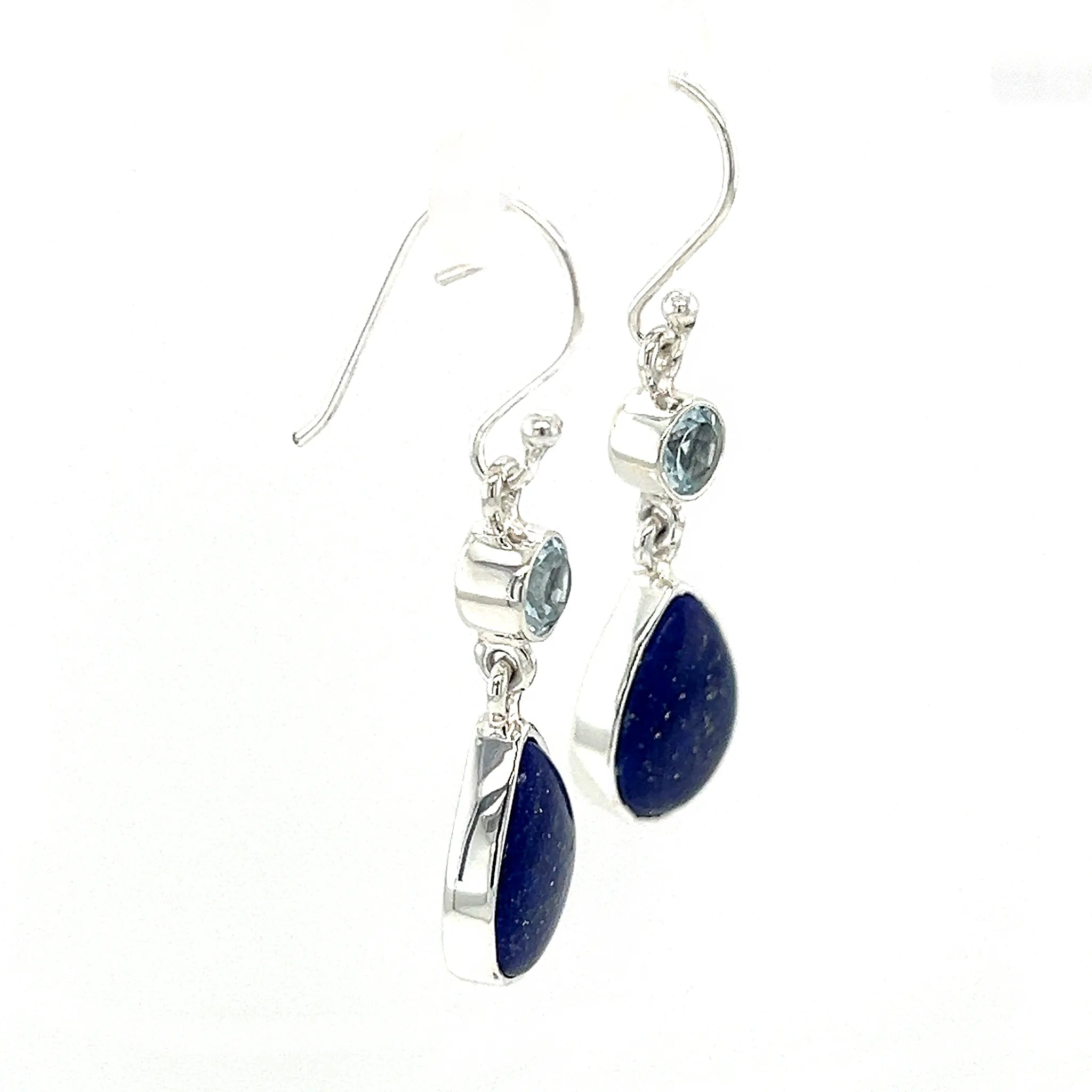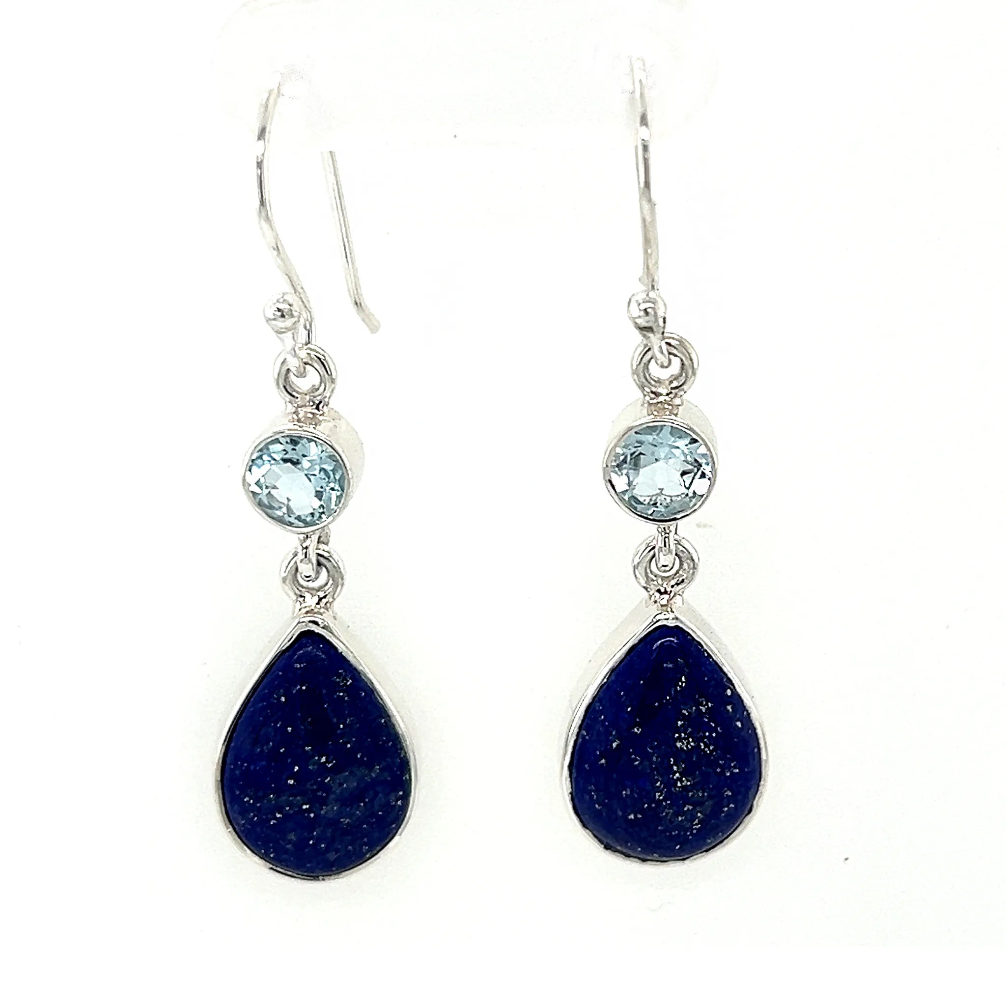 These Lapis Lazuli Blue Topaz Drop Earrings feature round faceted Blue Topaz above tear drop-shaped Lapis stones, all set in quality .925 sterling silver. The deep royal blue of Lapis Lazuli with its subtle golden pyrite inclusions pairs beautifully with the sparkling clarity of Blue Topaz.