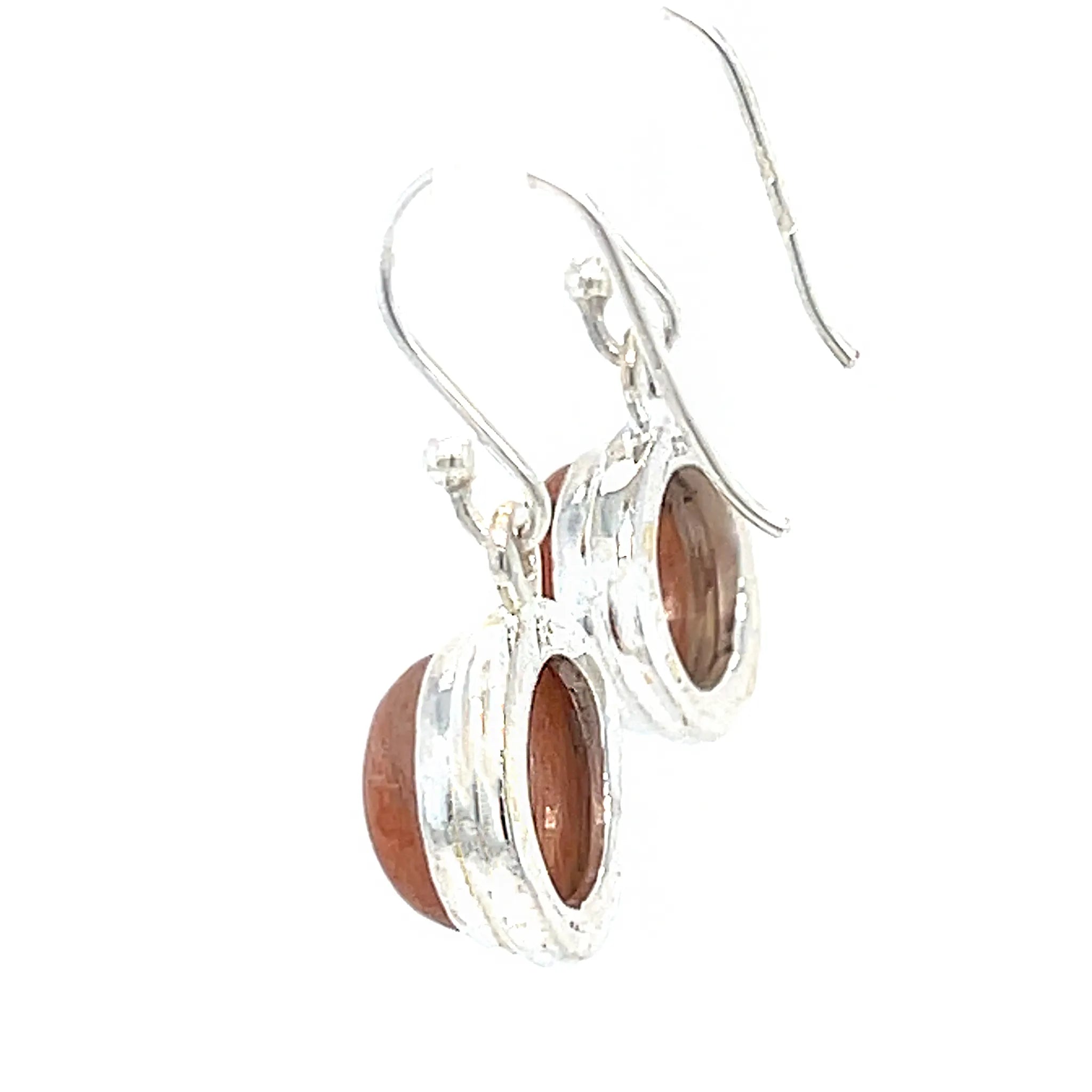 These Sunstone Round Earrings showcase natural Sunstone cabochons set in polished .925 sterling silver. Each stone shimmers with golden reflections known as aventurescence, capturing light with every movement.