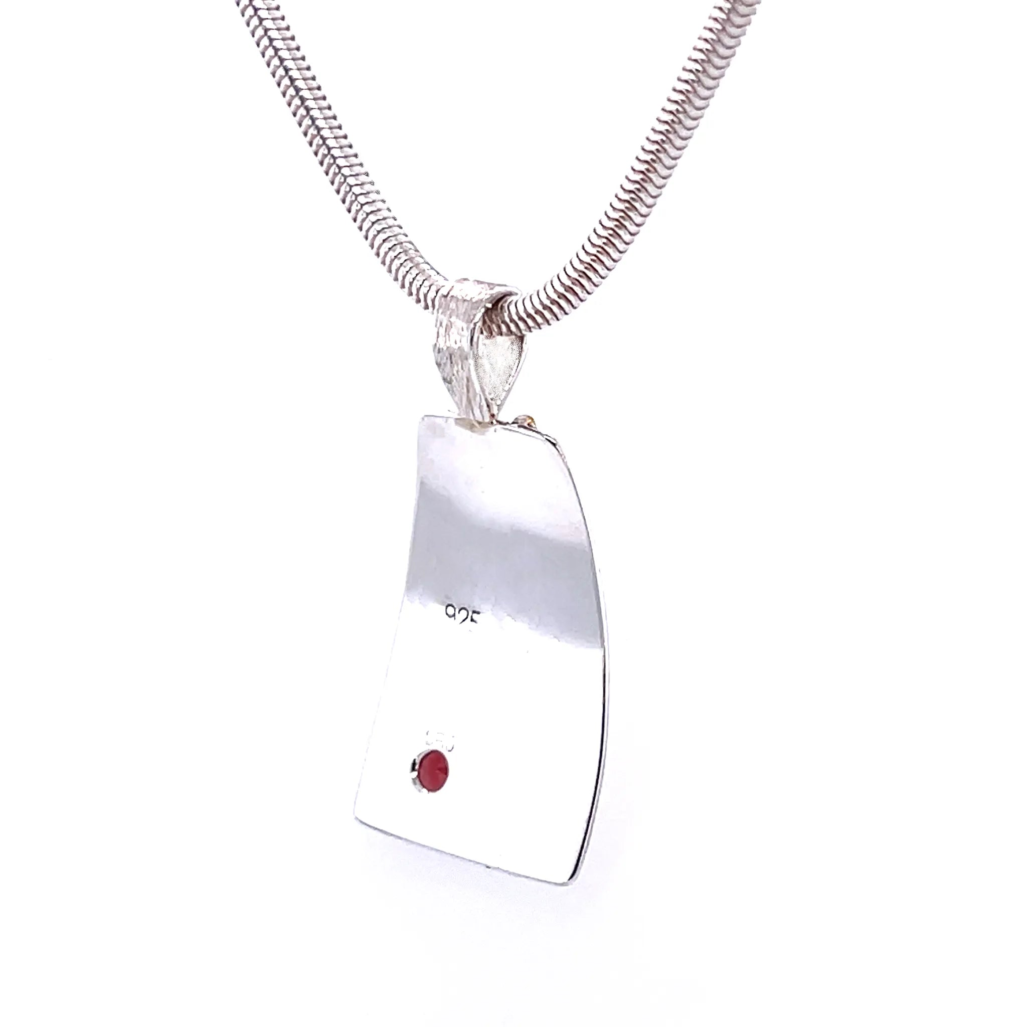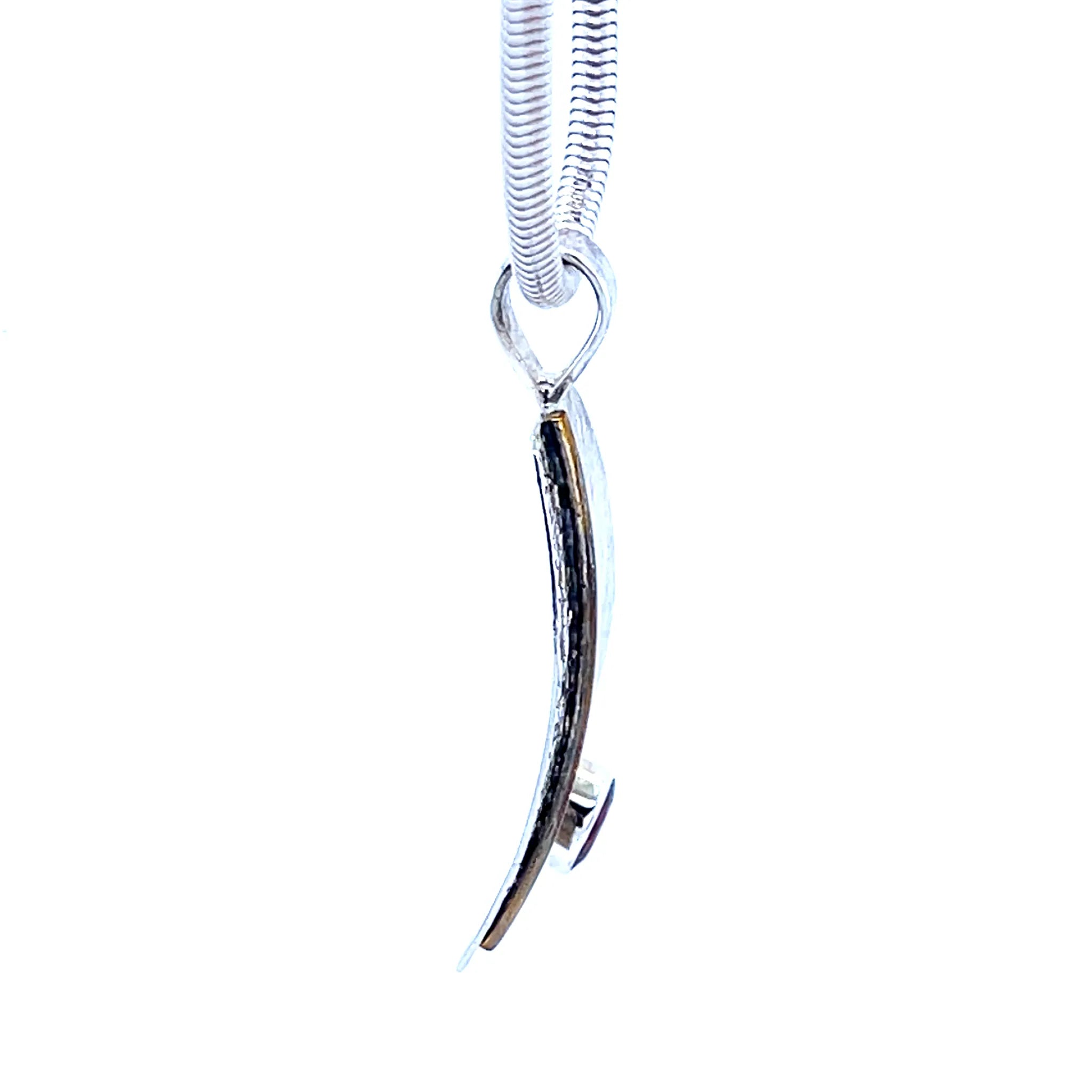 This Fancy Etched Gemstone Silver Necklace features a round gemstone set against a thin, curved .925 sterling silver plate with a contemporary etched design.