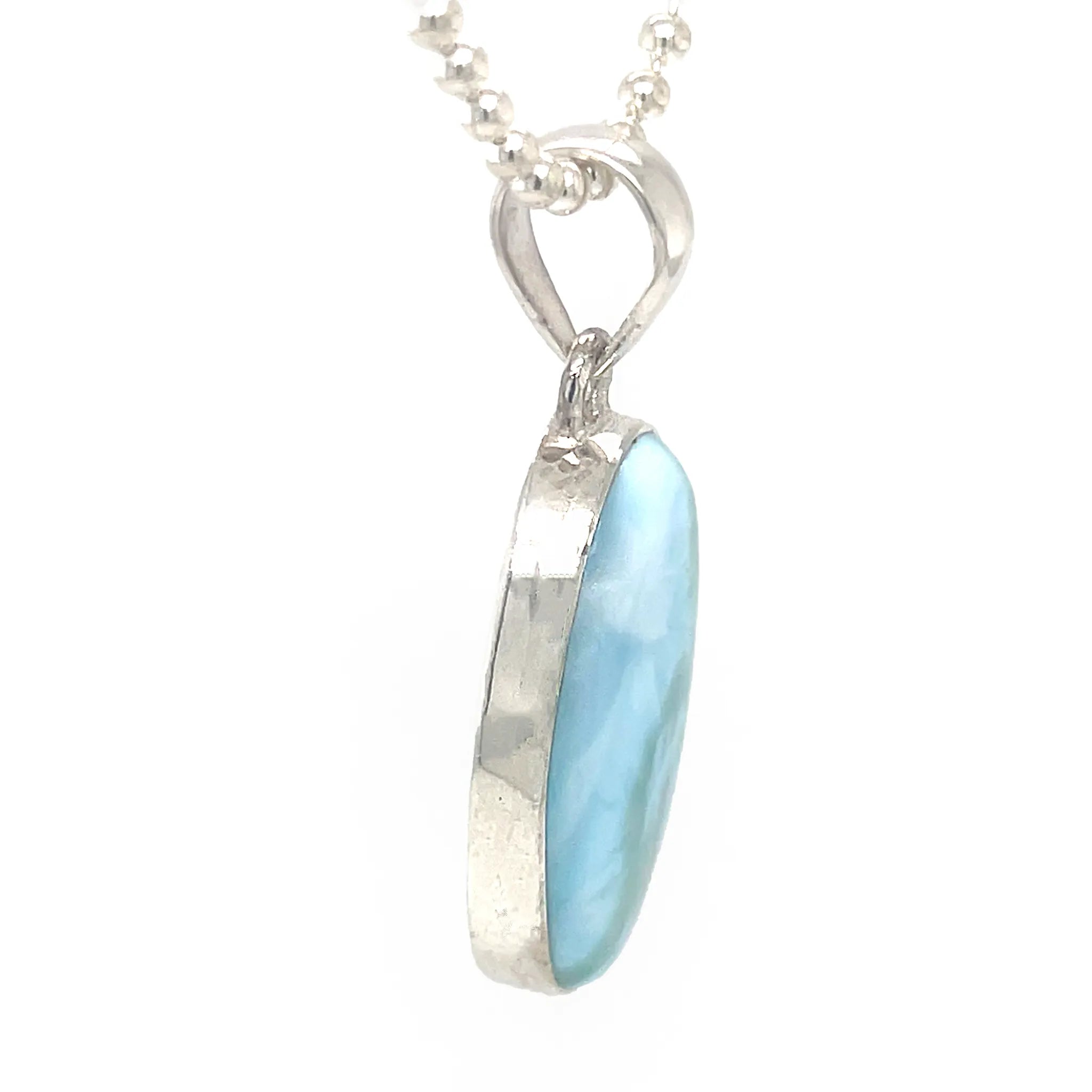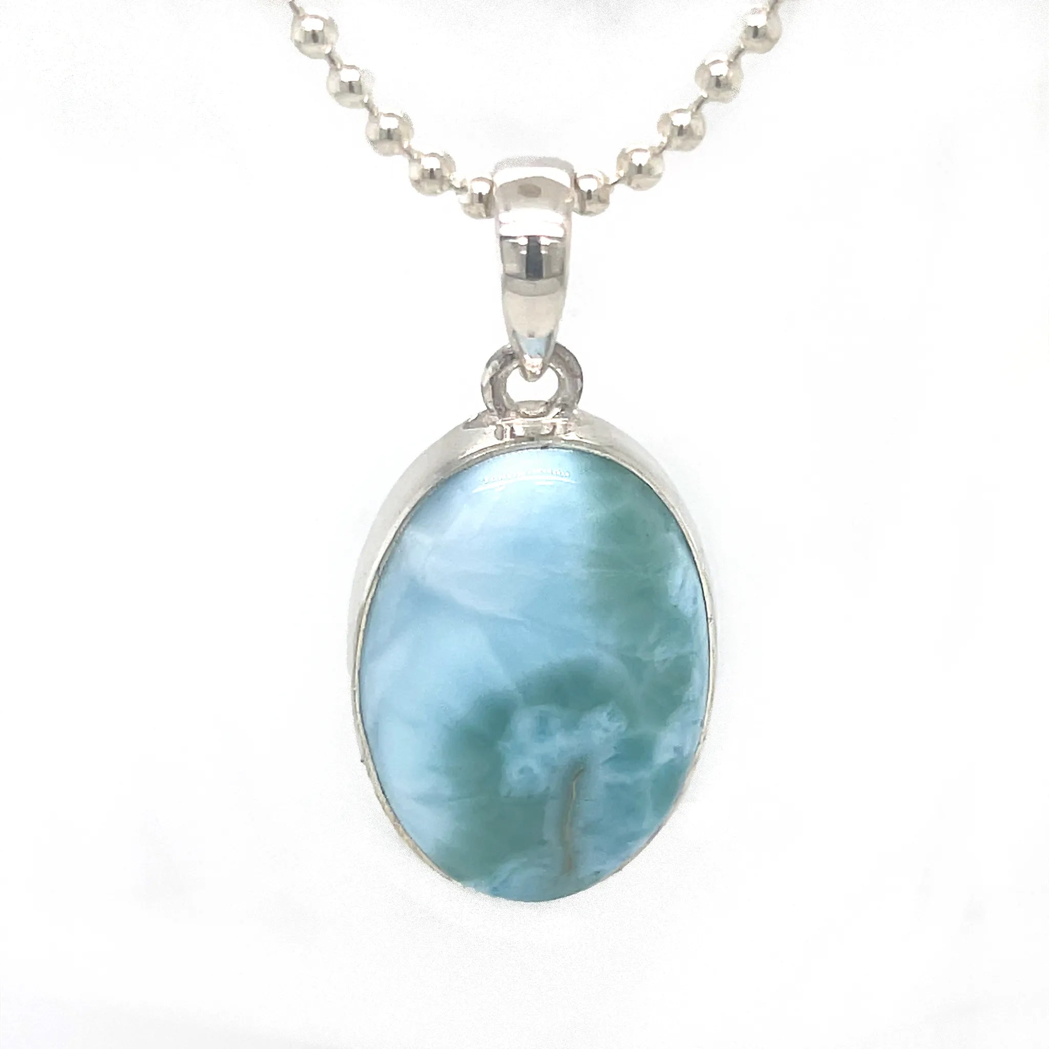 Elegant Larimar oval pendant set in polished .925 sterling silver. This soothing Caribbean gemstone is cherished for its nurturing energy, supporting emotional healing and clear communication.