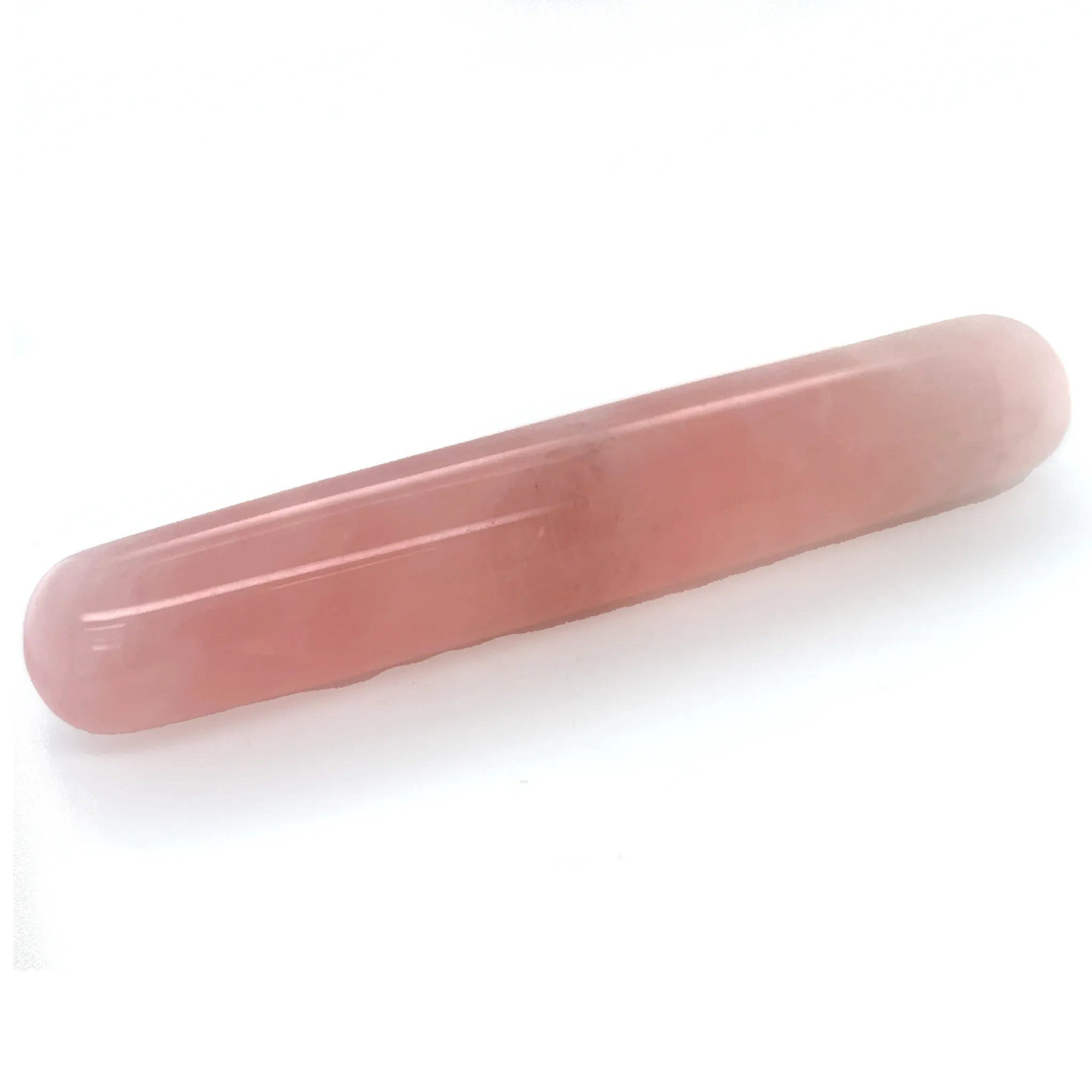 This polished Rose Quartz massage wand displays a soft pink tone, smooth texture, and a gently rounded finish. Carved from natural Rose Quartz, it’s ideal for bodywork, crystal facials, and heart chakra healing.