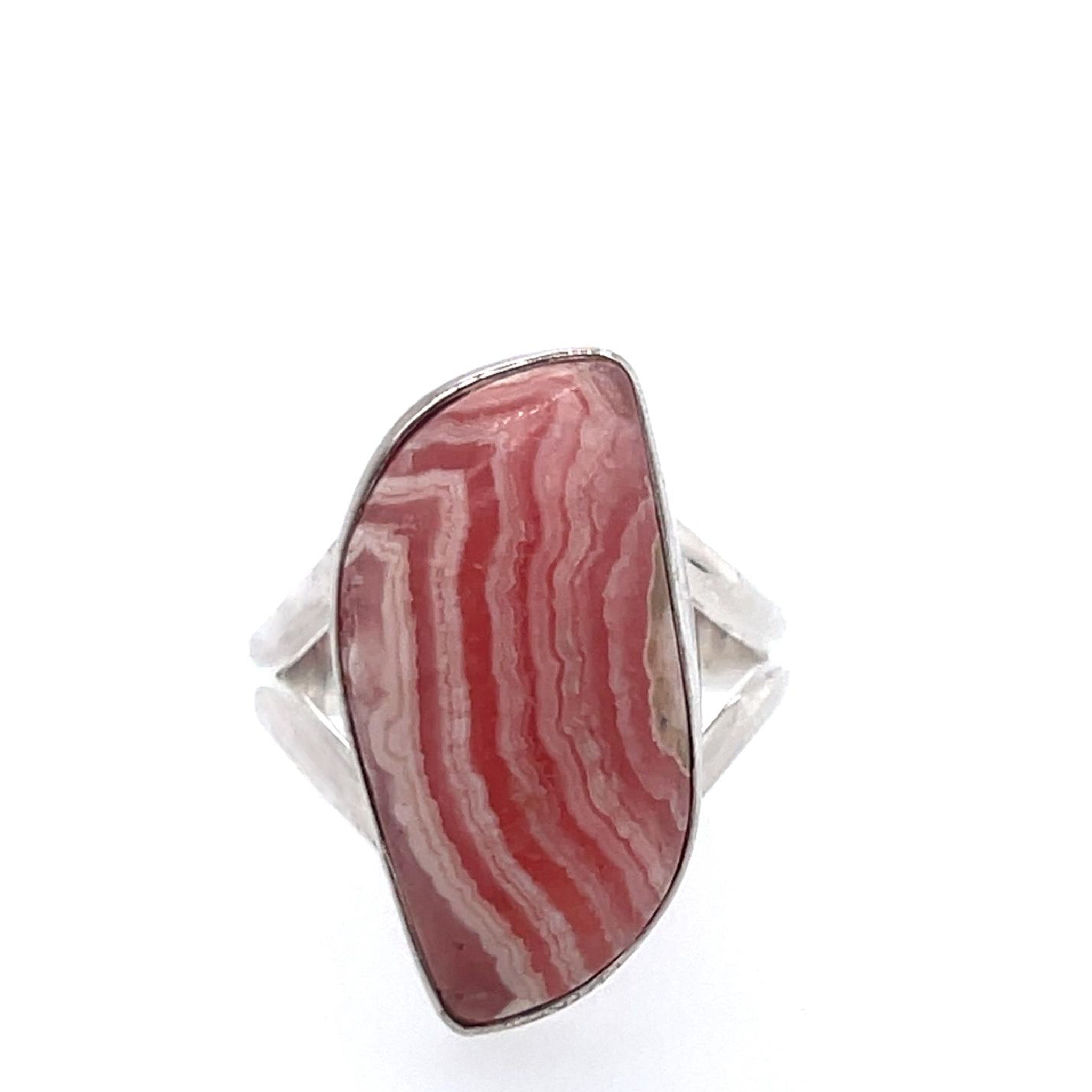 A natural Rhodochrosite freeform cabochon set in solid .925 sterling silver, featuring distinctive pink, cream and brown banding with soft, flowing patterns unique to each stone.
