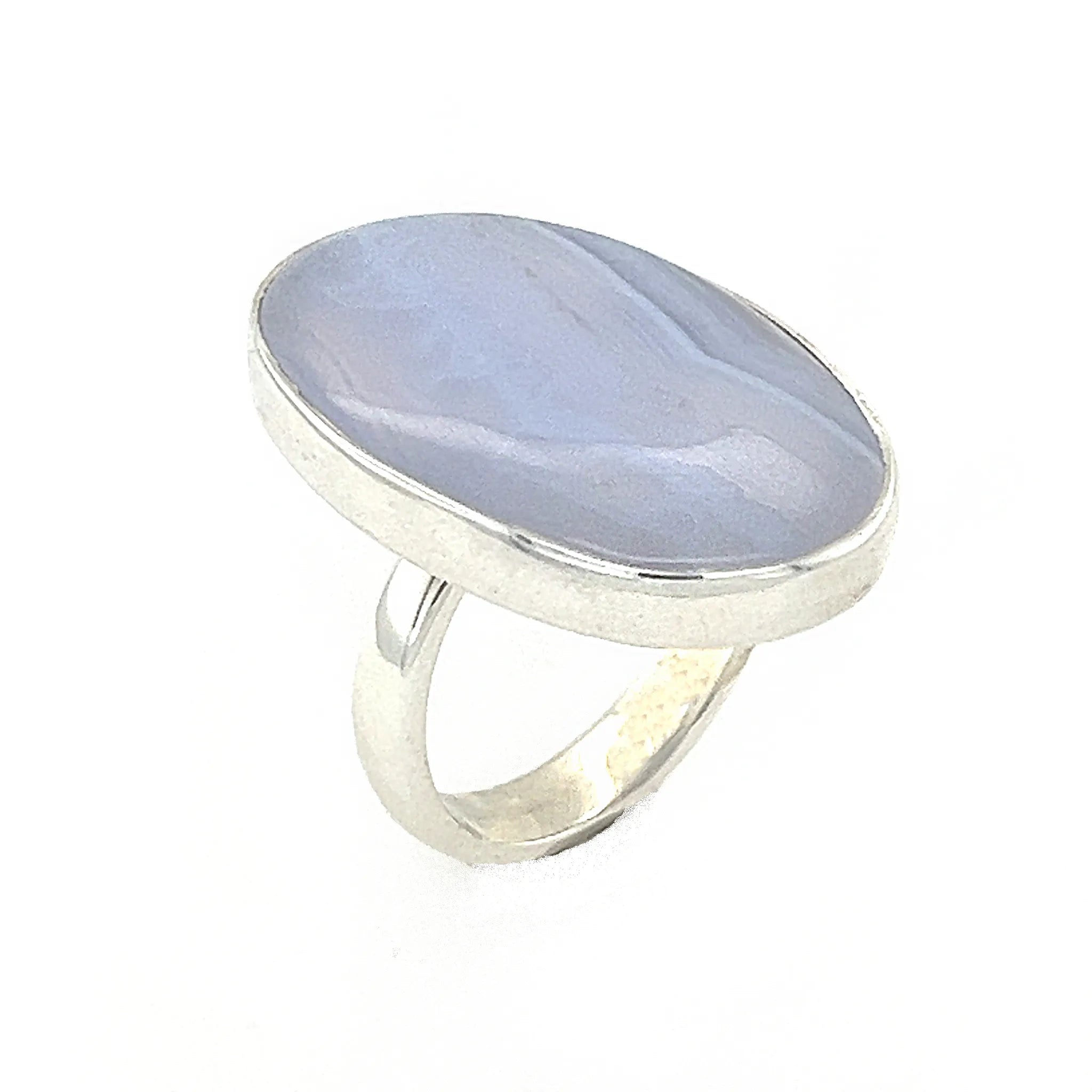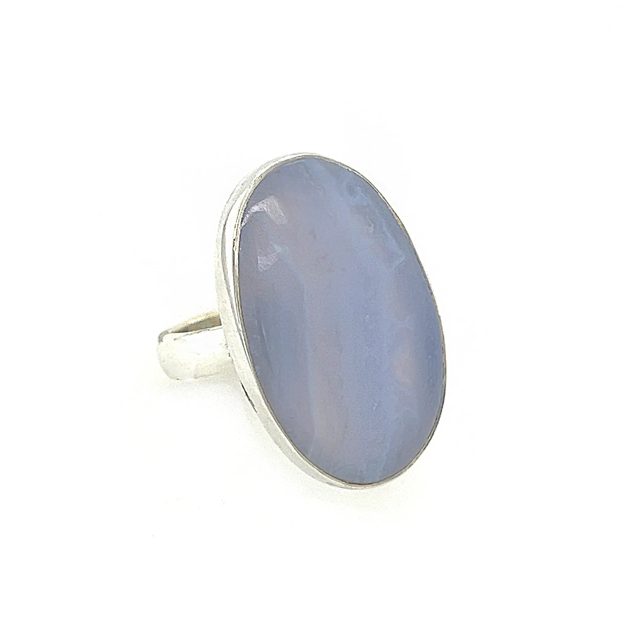 This Blue Lace Agate Adjustable Cabochon Ring features a polished oval stone set in .925 sterling silver. The soft blue and white bands create a calming, elegant look.