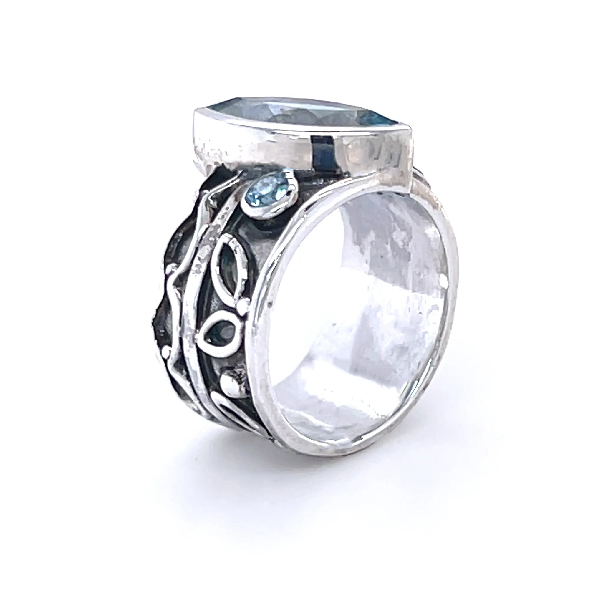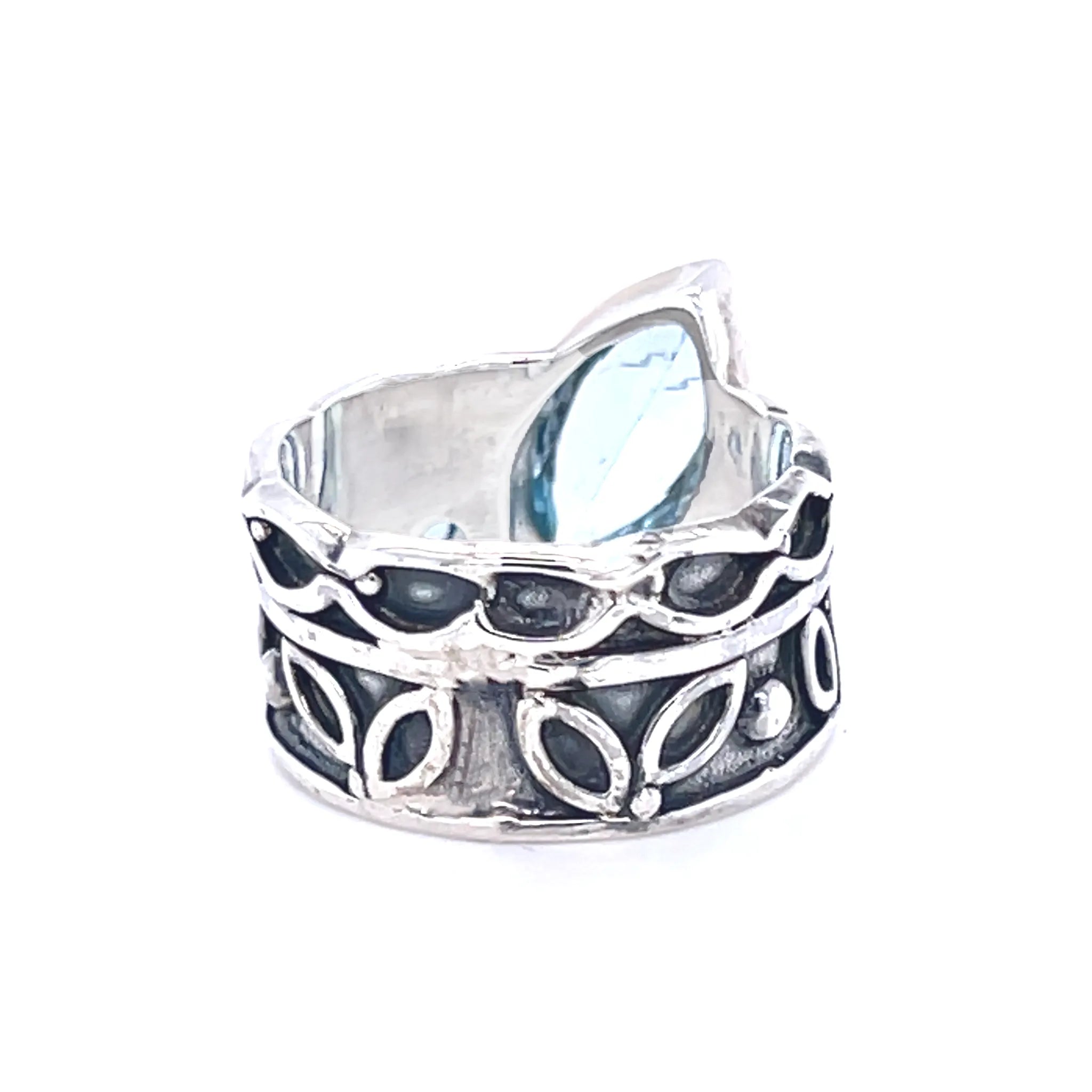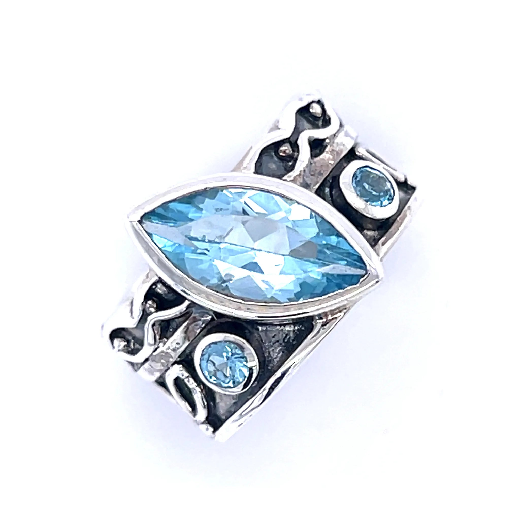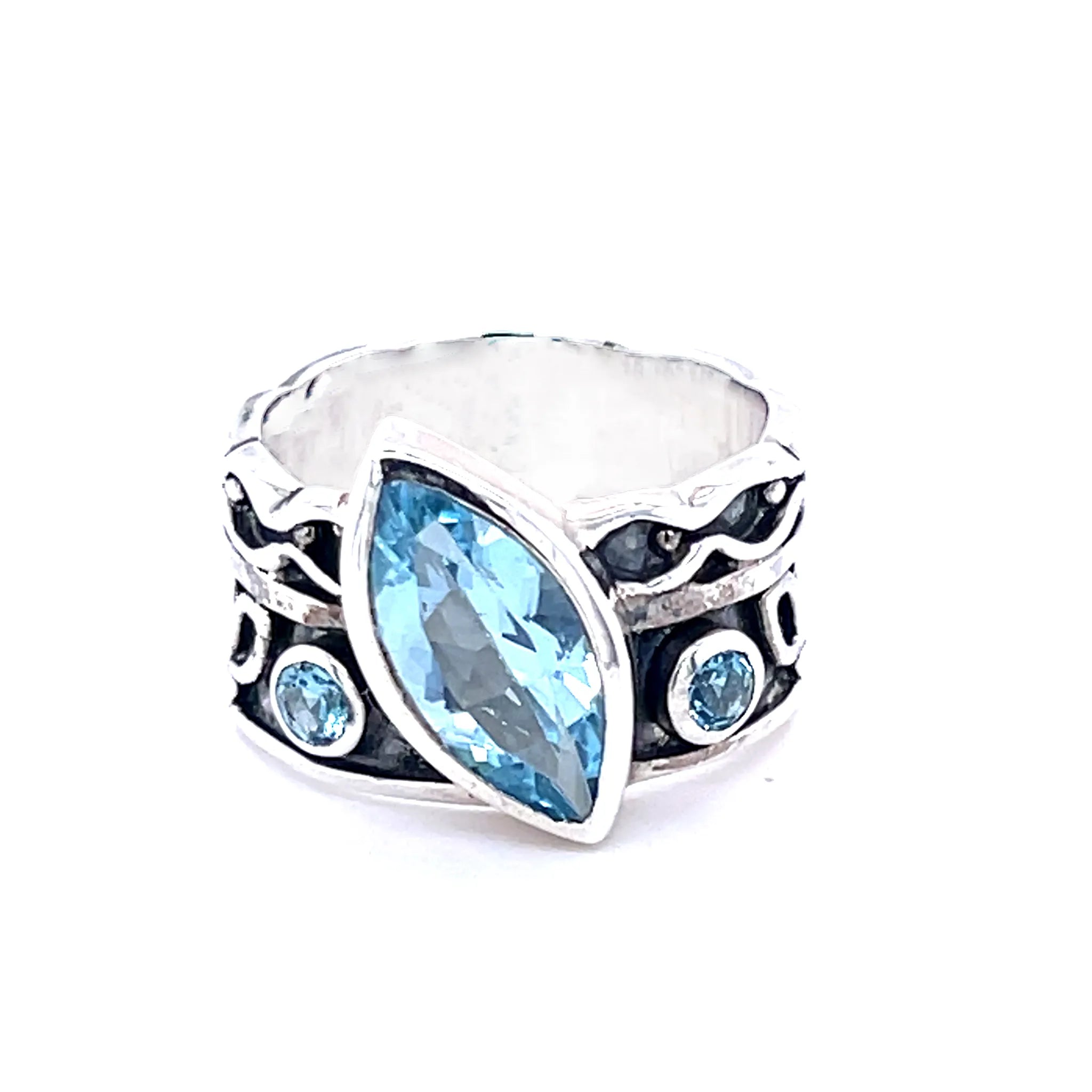 Blue Topaz Oxidised Silver Design Band Ring, crafted in .925 sterling silver with a bold 1cm band. The ring showcases a striking central marquise cut Blue Topaz, flanked by two faceted round gemstones on either side, creating balance and flow in the design. The oxidised silver finish gives it an antique, statement appeal.