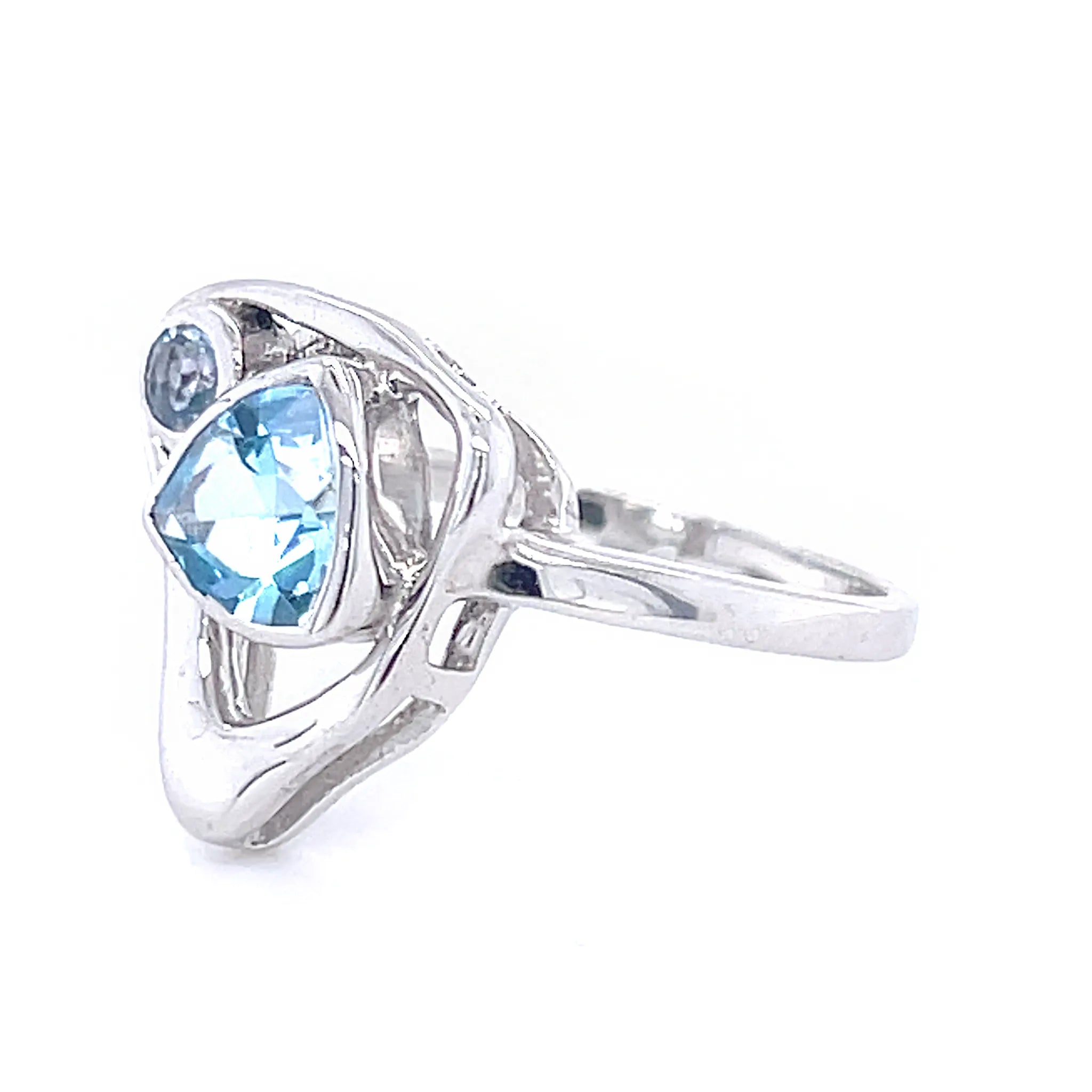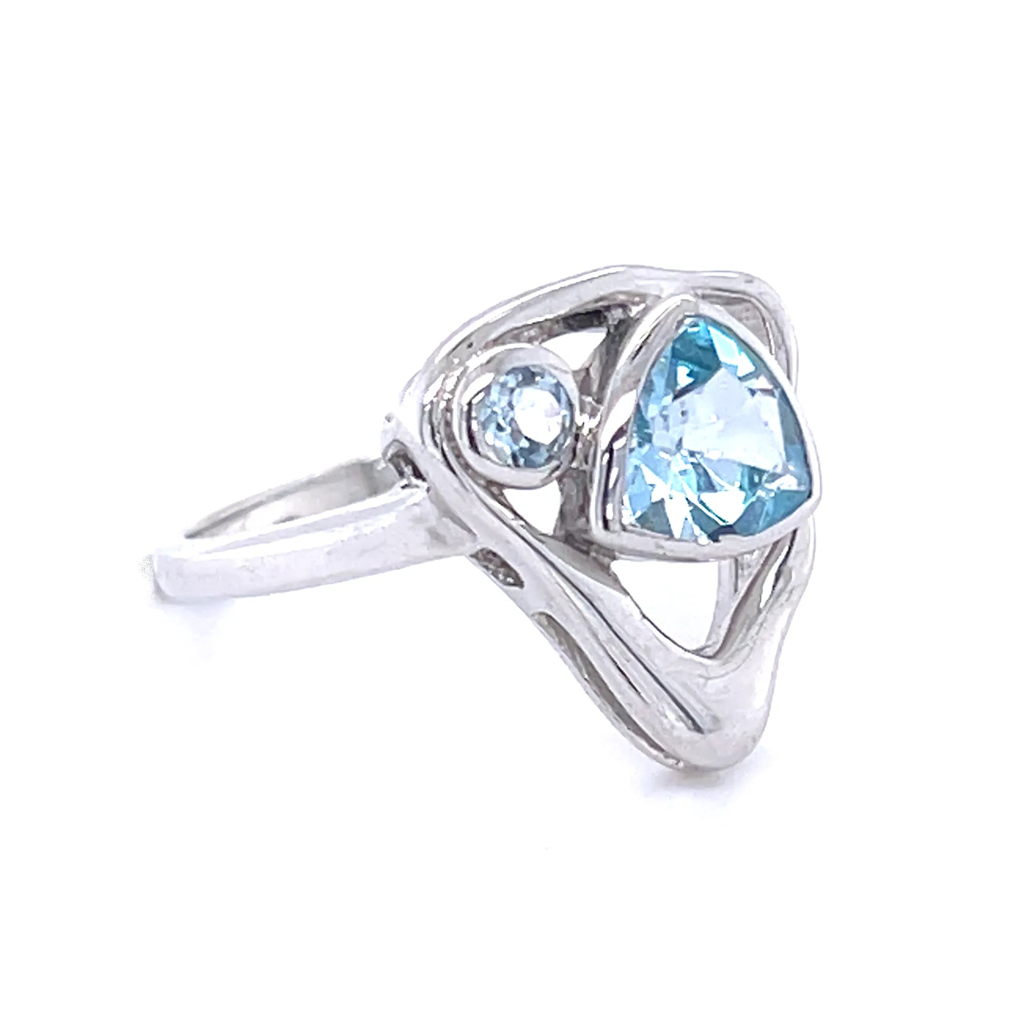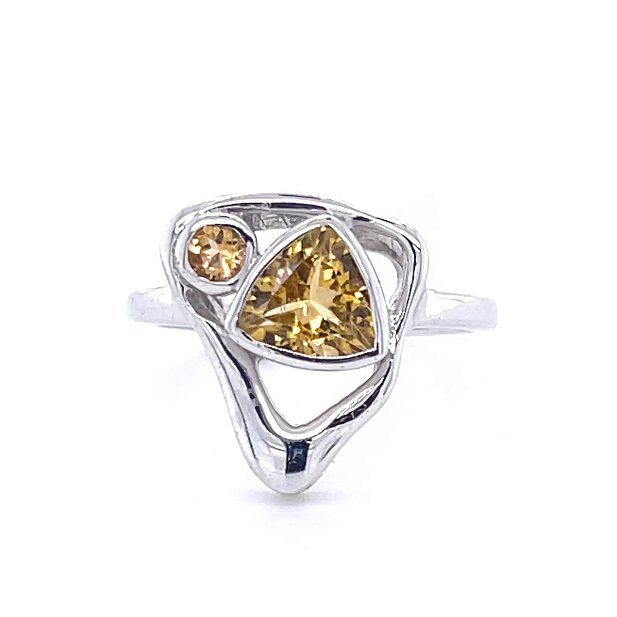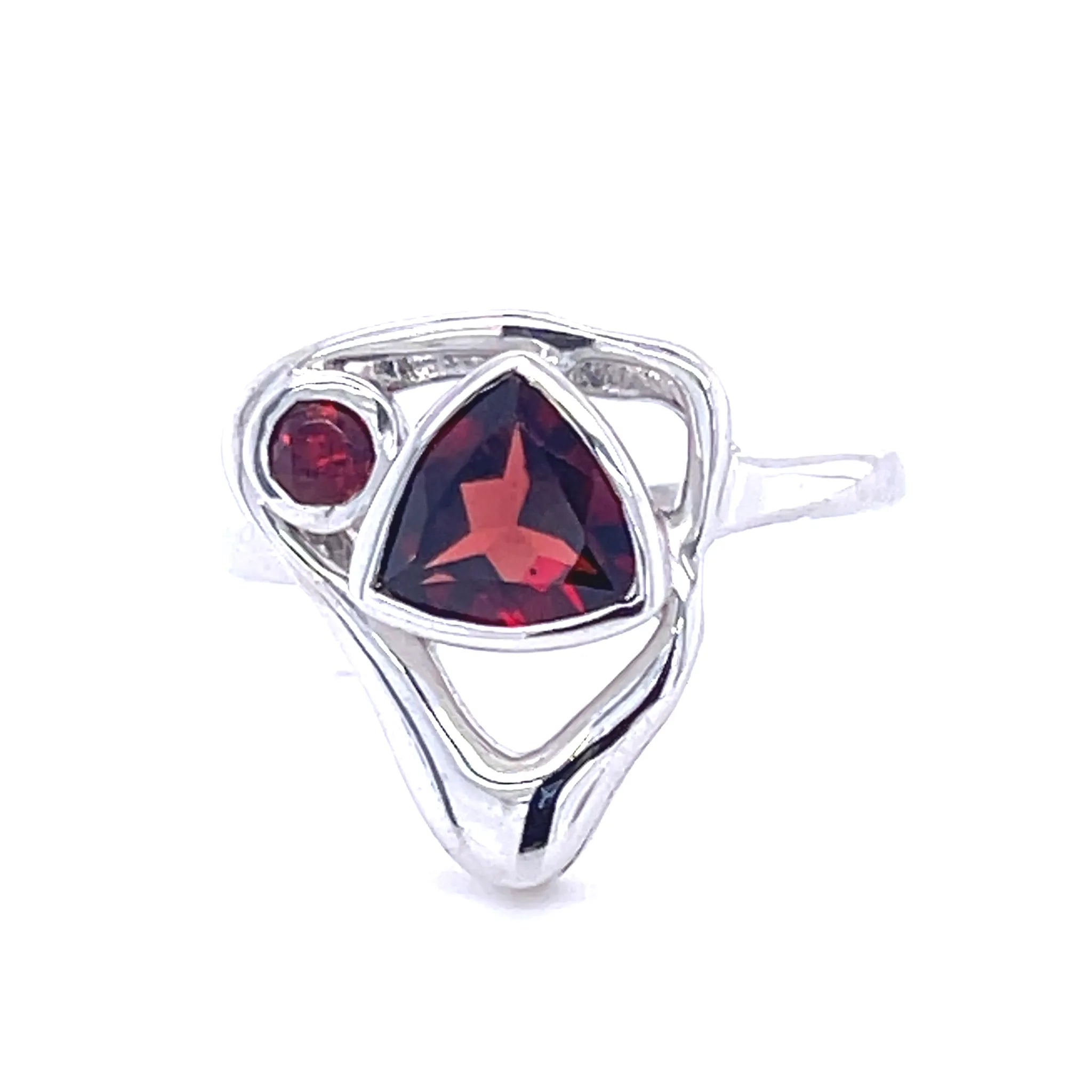 Silver Faceted Duet Ring, crafted in .925 sterling silver with a contemporary design. This unique piece features two gemstones, a striking triangular-cut centre stone paired with a smaller round accent on the side, creating a modern yet balanced look.