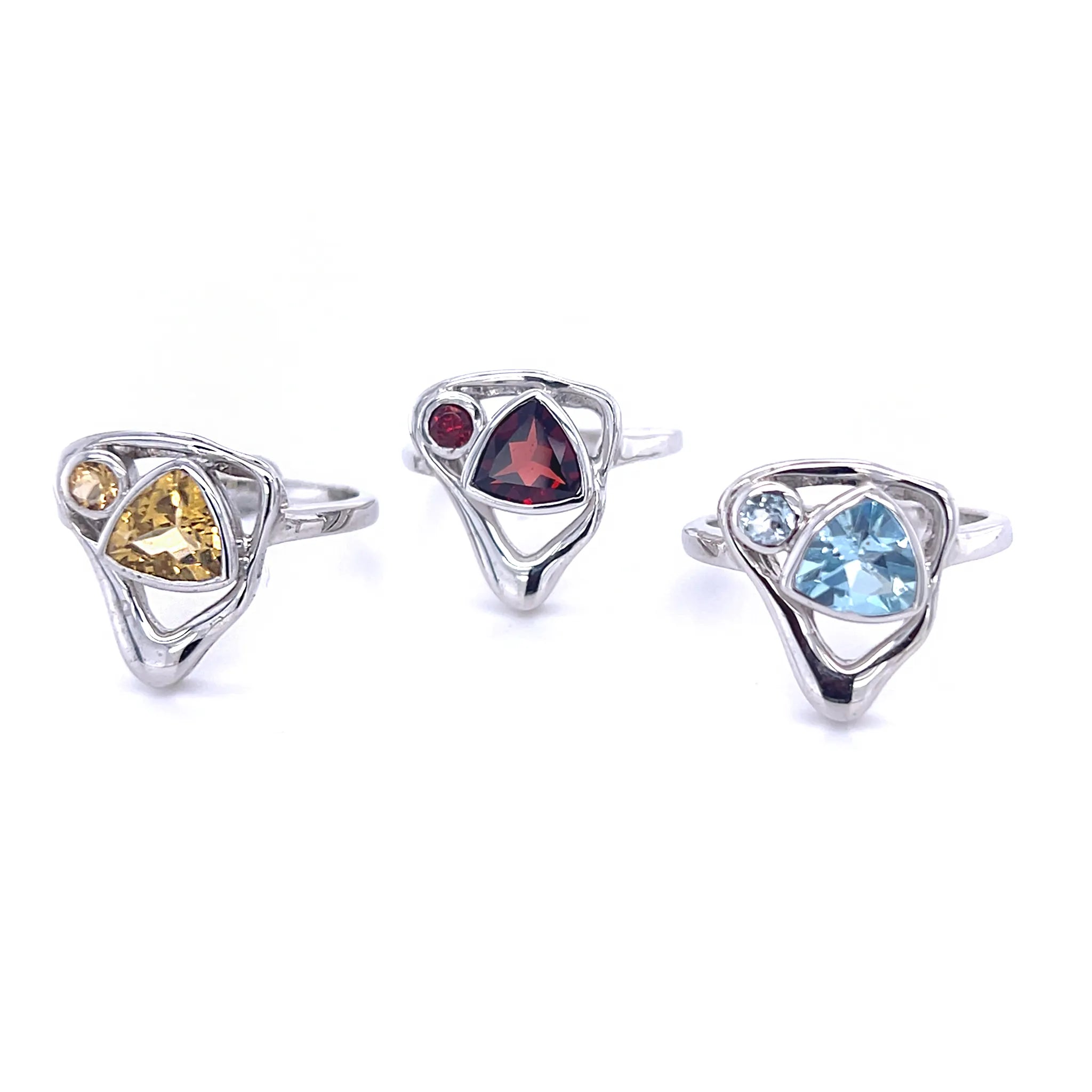 Available in Blue Topaz (Size 8), Garnet (Size 7), and Citrine (Size 8). See our ring size chart to determine your size.