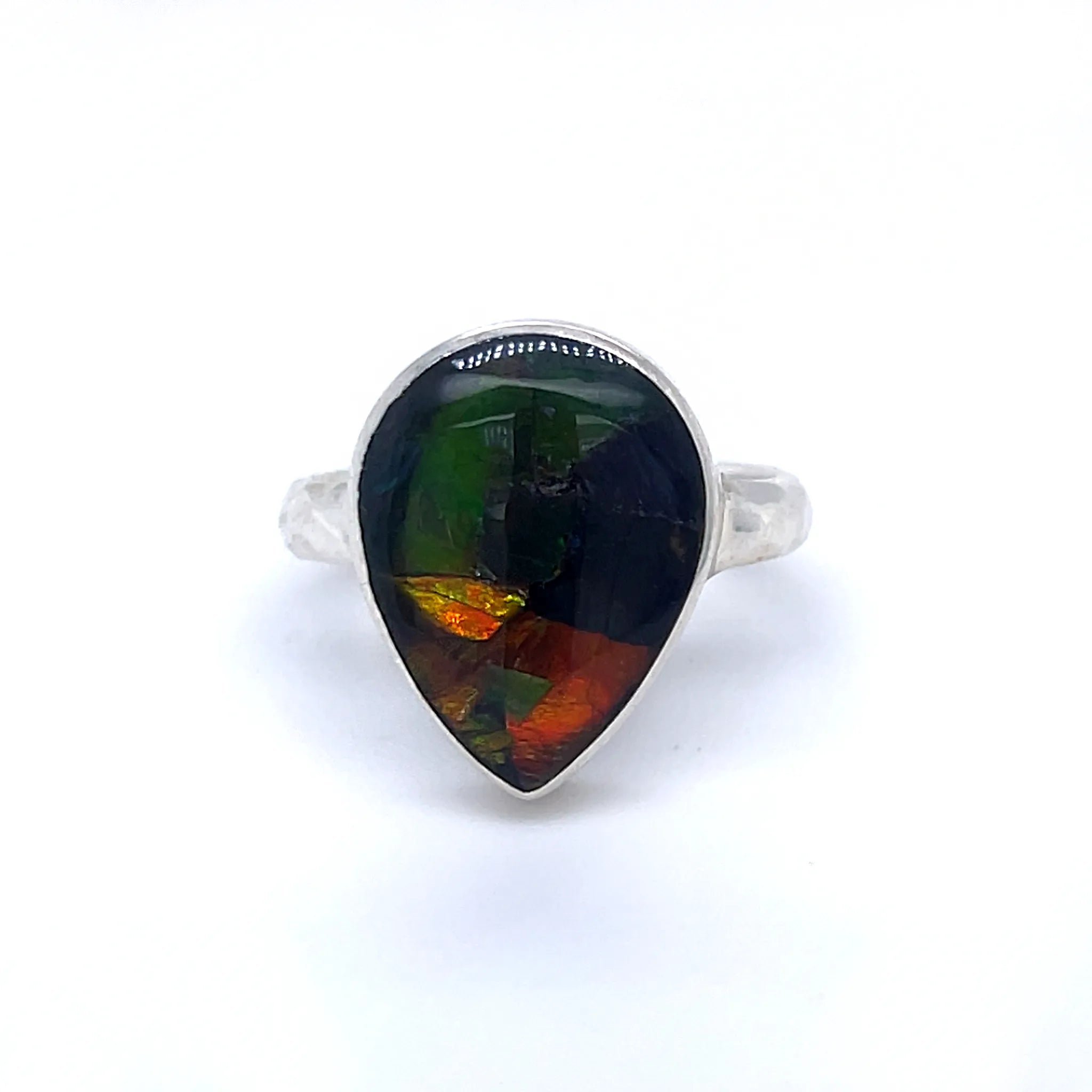 Ammolite silver ring set in .925 sterling silver, showcasing a polished teardrop cabochon displaying vivid flashes of green, blue, red and amber. The ring features a textured sterling silver band and is US size 7 (17.15 mm diameter)