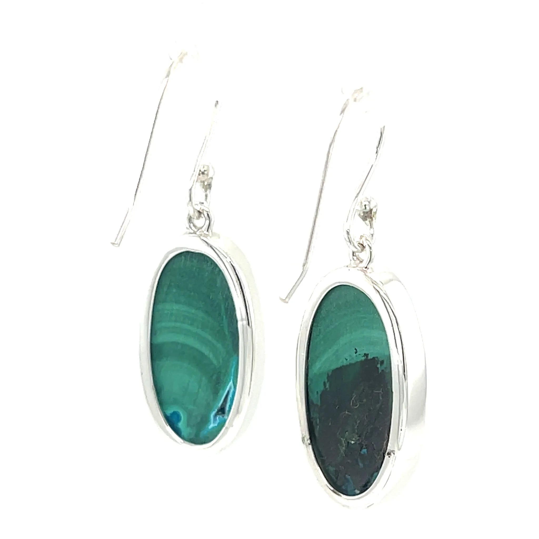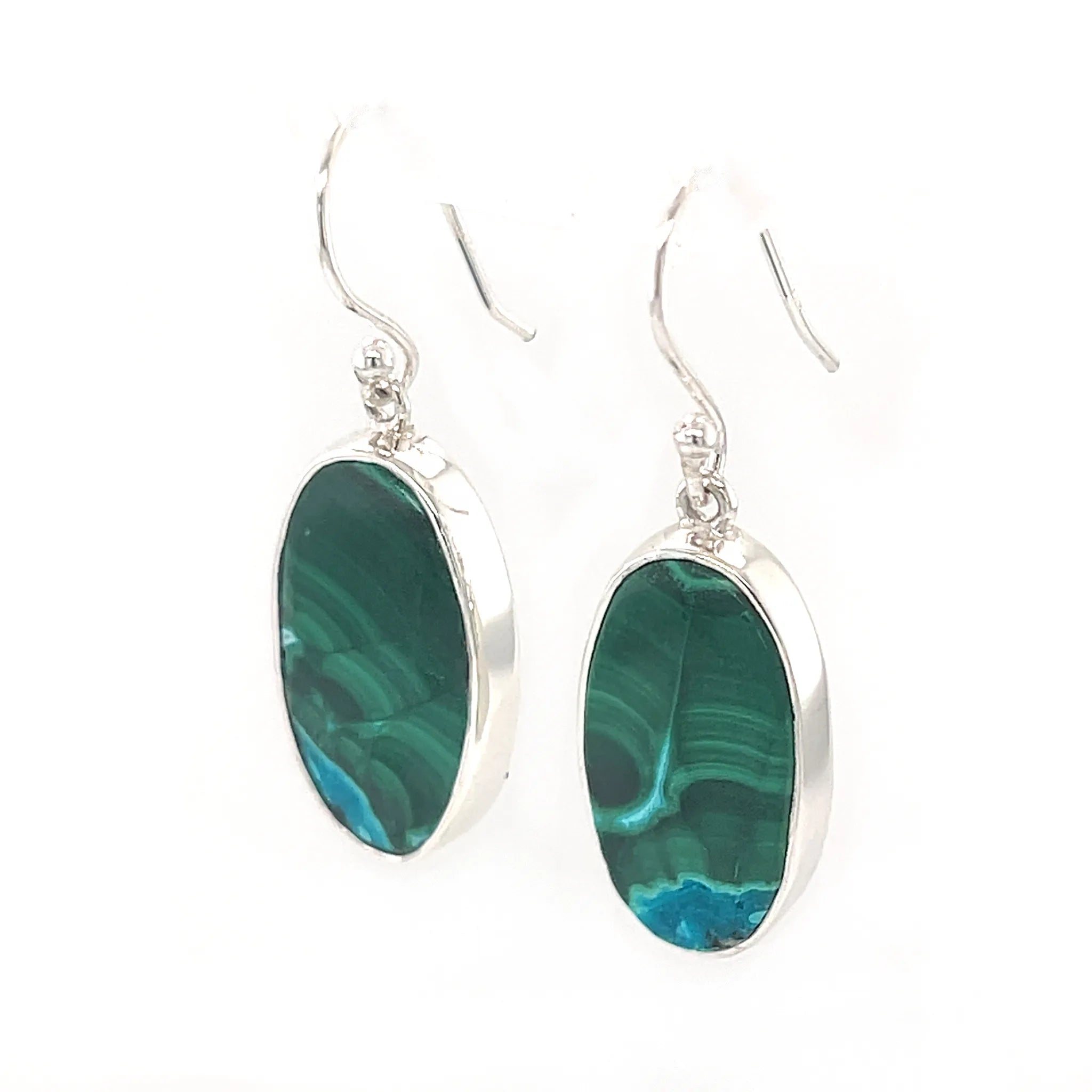 These stunning .925 sterling silver earrings showcase natural Malachite-Chrysocolla ovals, combining rich green bands with vivid blue highlights.