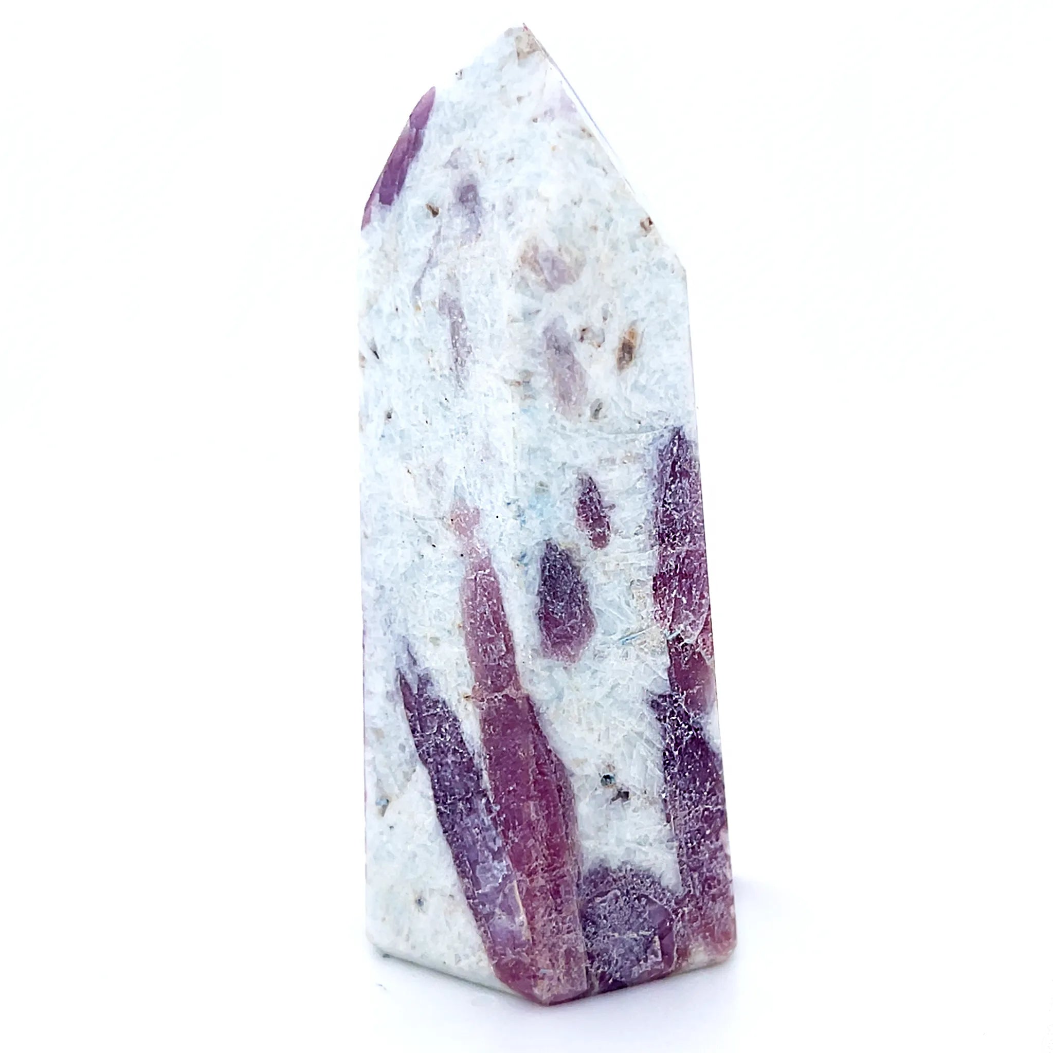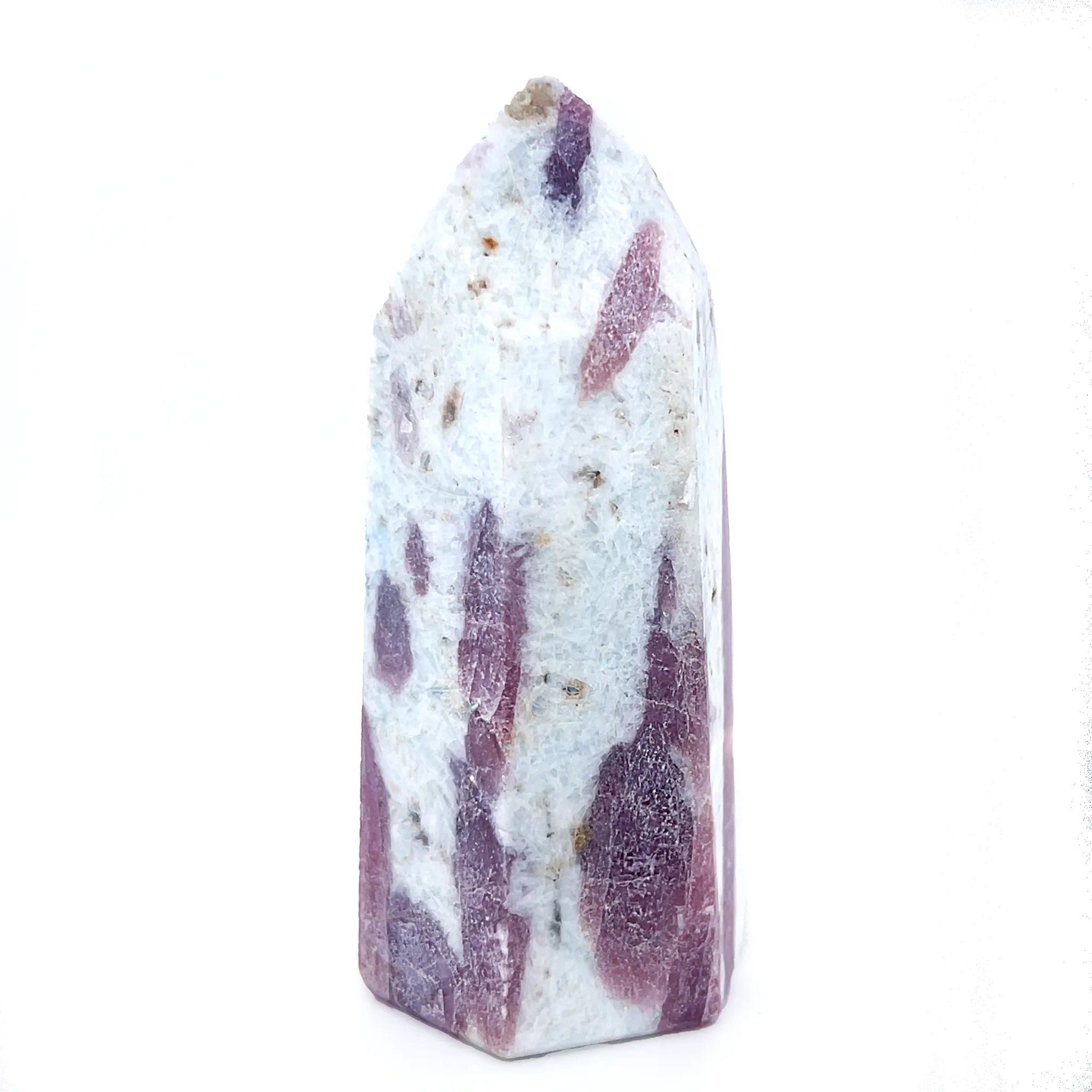 This Pink Tourmaline in Matrix Point showcases striking pink crystals naturally embedded in a pale, granite-like matrix. Polished into a six-sided tower, it highlights the raw beauty and contrast of the materials.