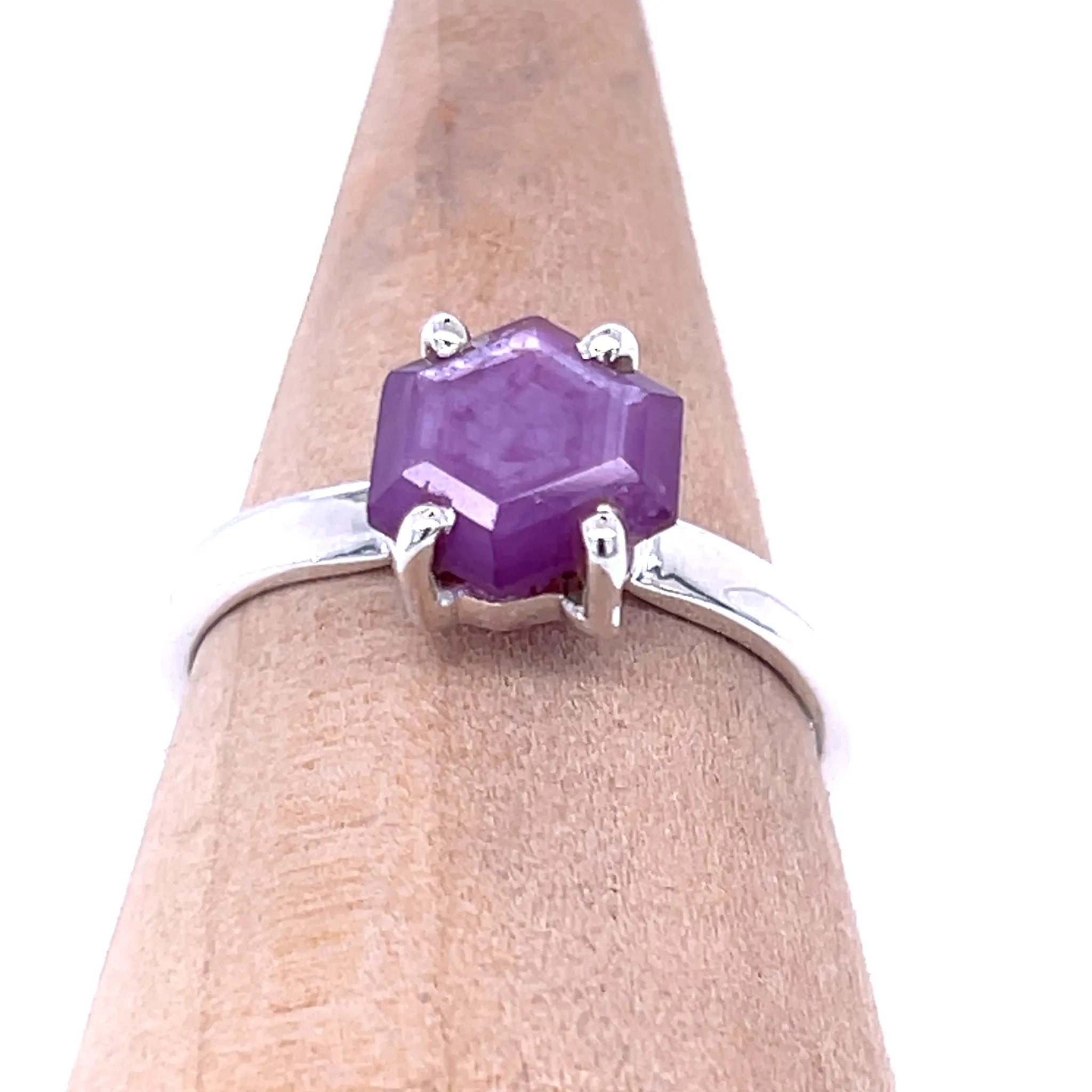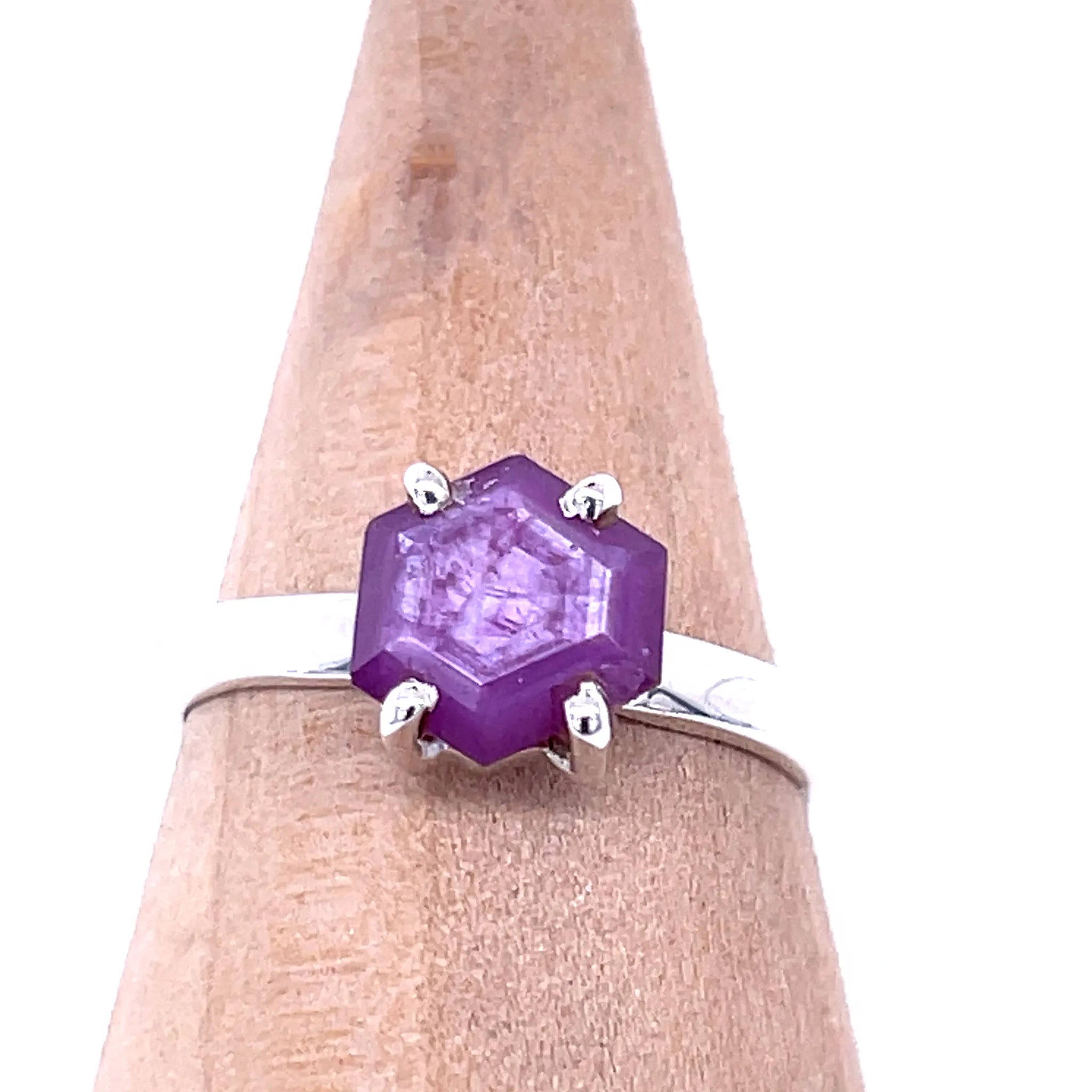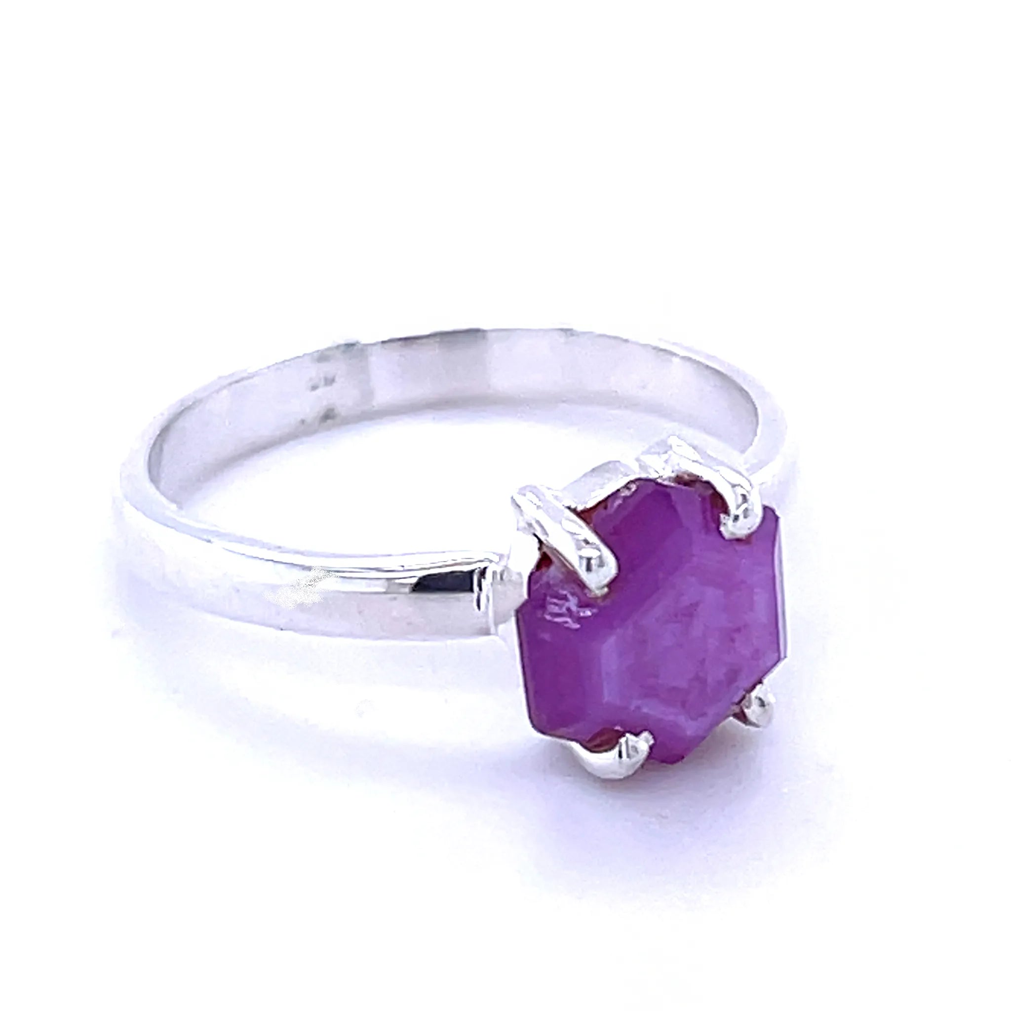 This Ruby Ring Size 8 features a striking natural ruby slice, faceted to reveal its rich red tones with a subtle purple tinge. Set in a refined, 925 sterling silver claw design that highlights the gem’s natural beauty.