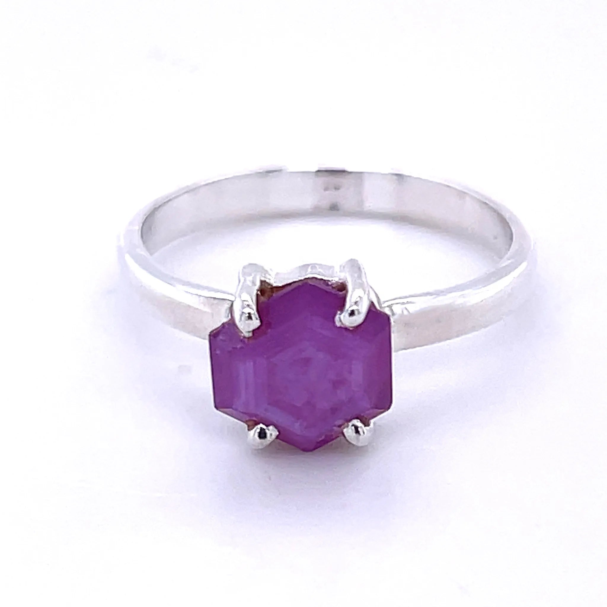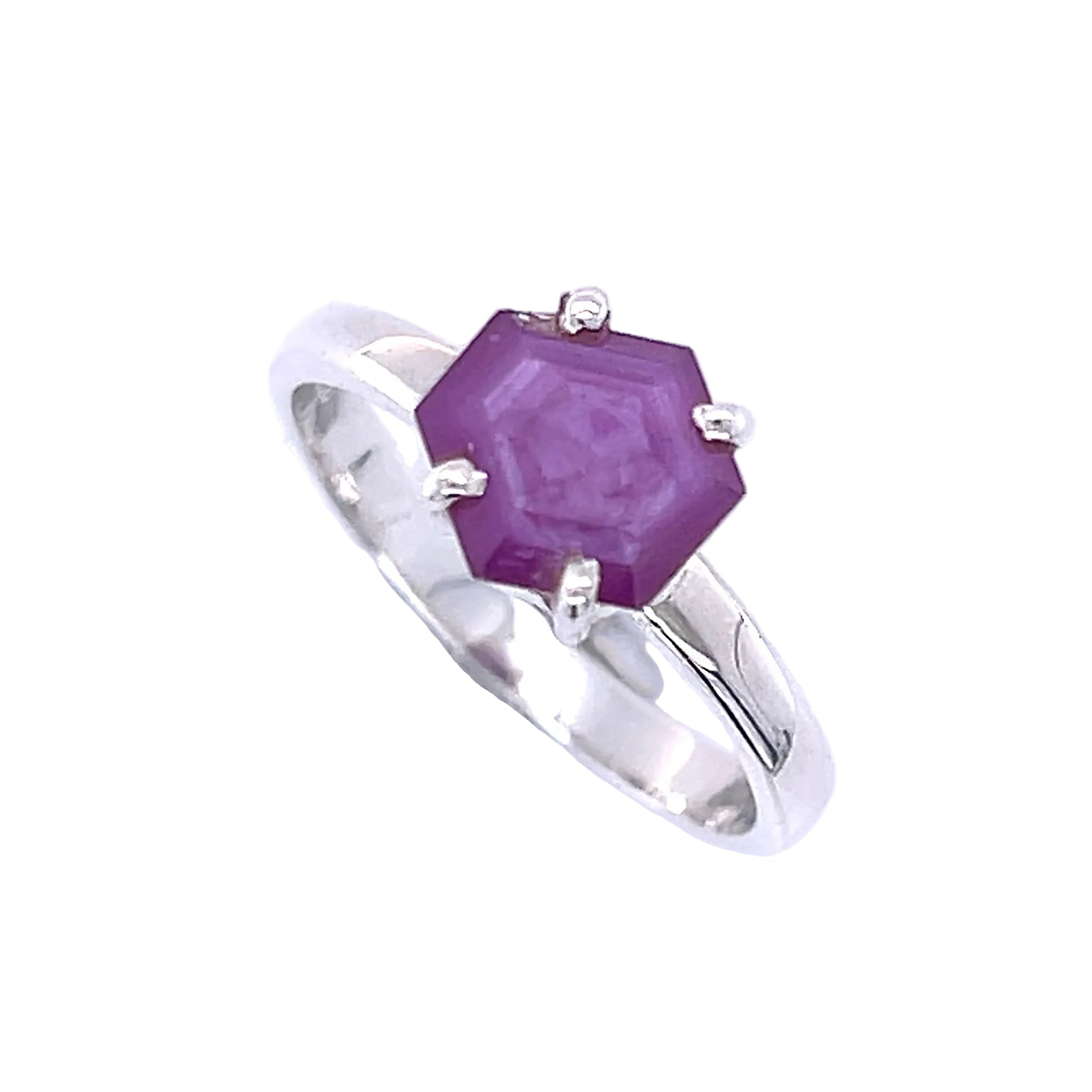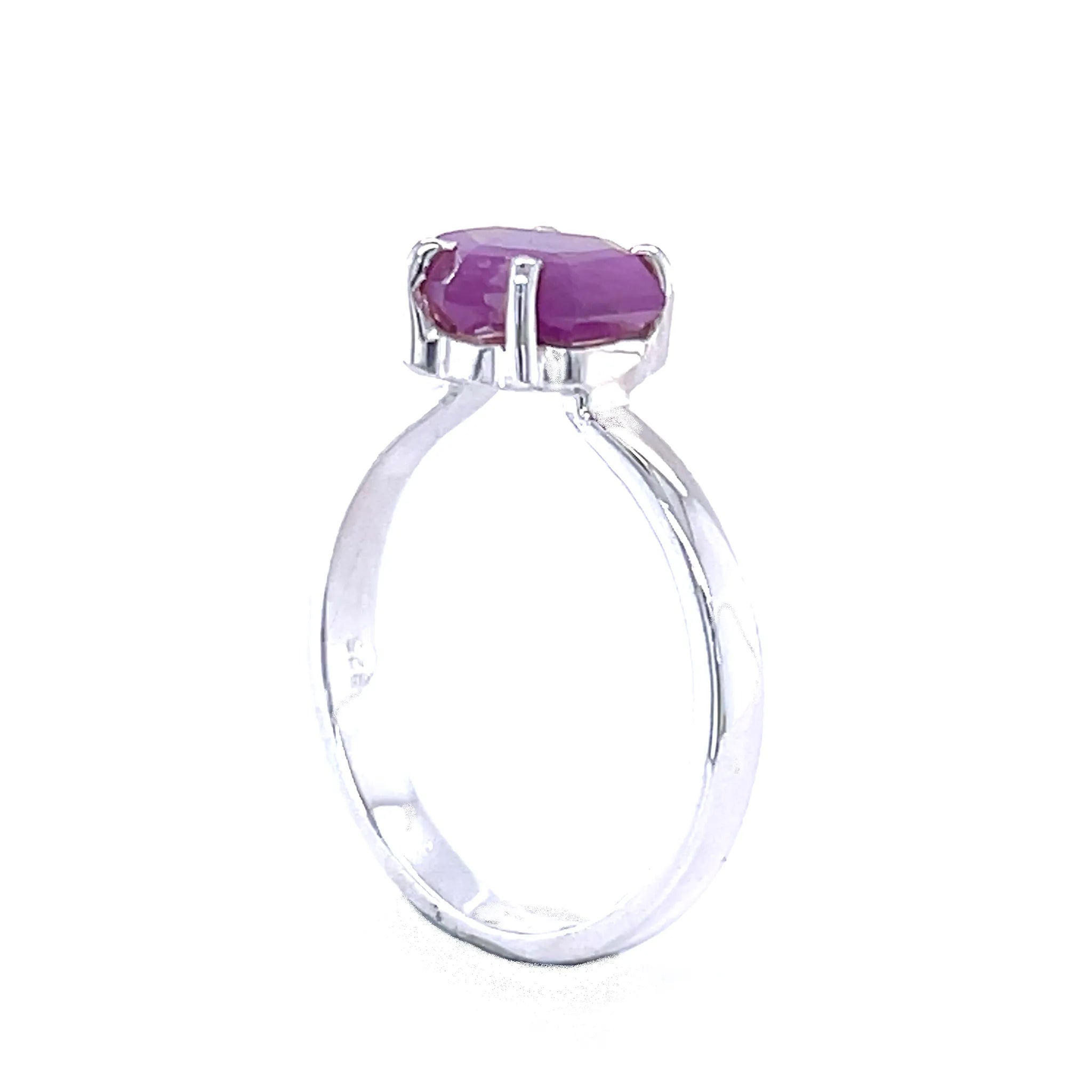 This Ruby Ring Size 8 features a striking natural ruby slice, faceted to reveal its rich red tones with a subtle purple tinge. Set in a refined, 925 sterling silver claw design that highlights the gem’s natural beauty.