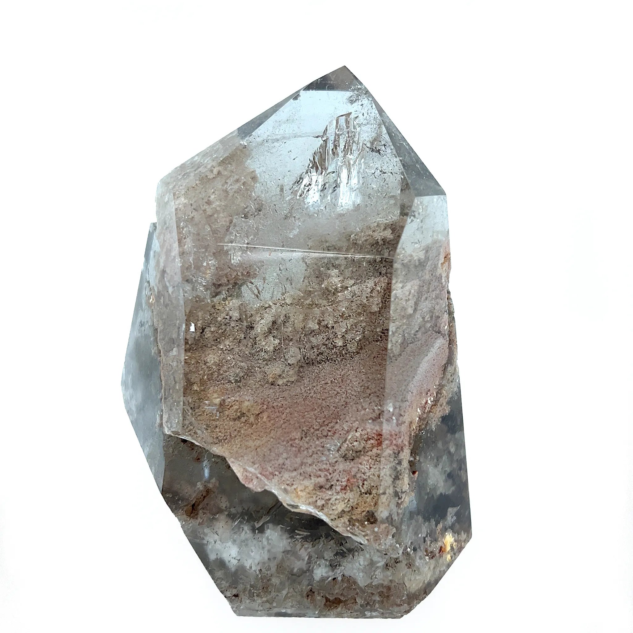 This polished point features Smoky Quartz with captivating Lodelite inclusions, creating a unique, landscape-like scene within the crystal.