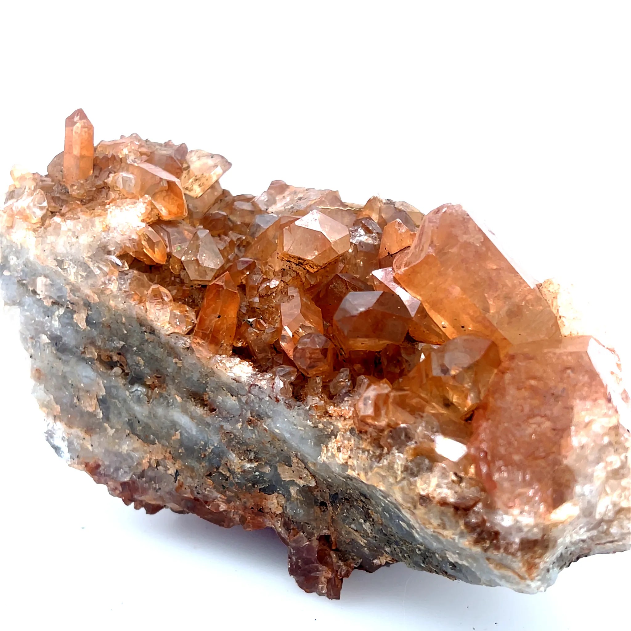 This natural Tangerine Quartz Cluster features vibrant orange points on a grey-white matrix. The rich colour comes from iron oxide naturally bonded to the quartz surface.
